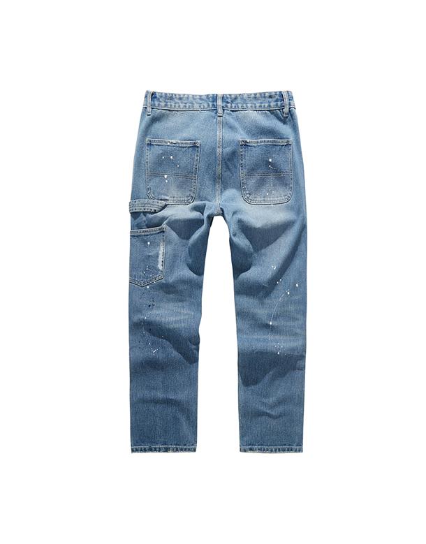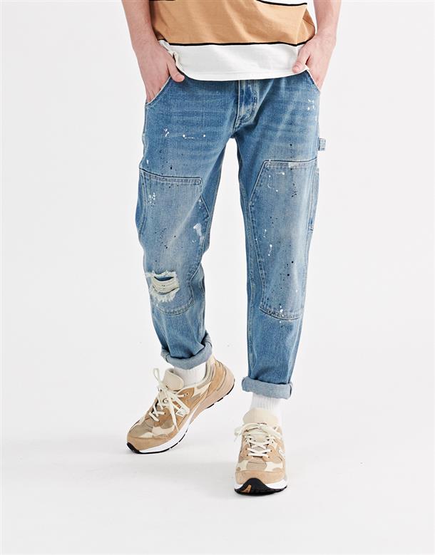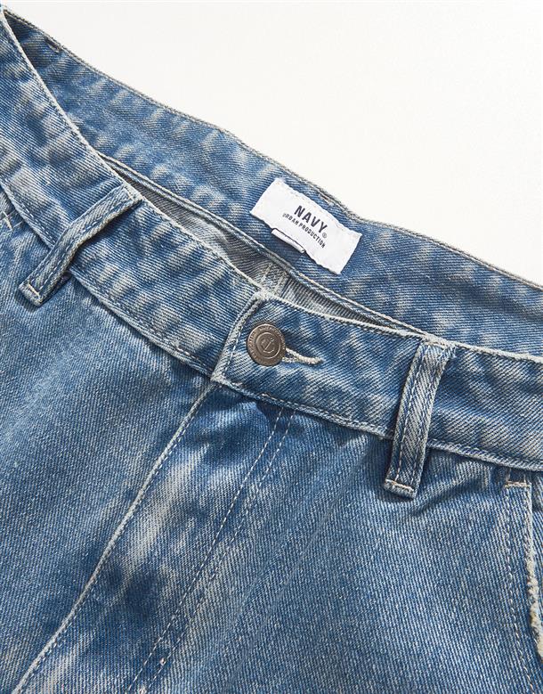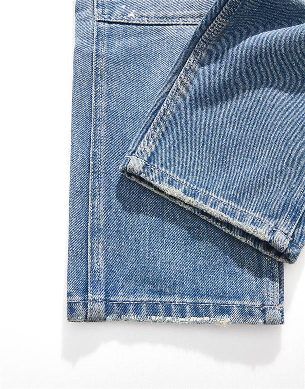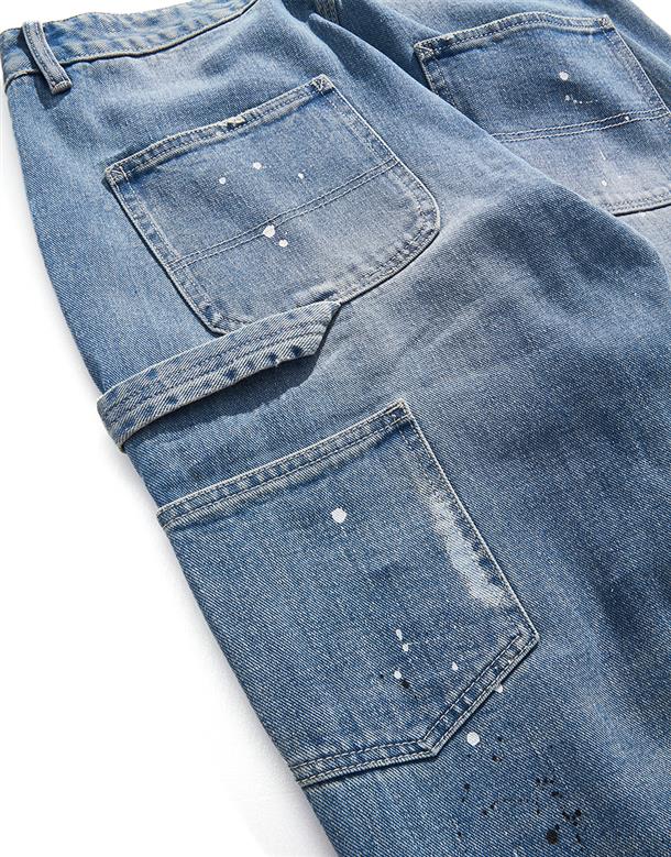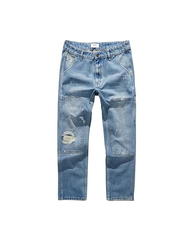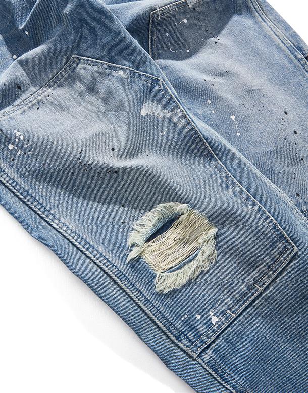 外貼剪接造型破壞潑漆設計,闊腿牛仔刷色褲。
