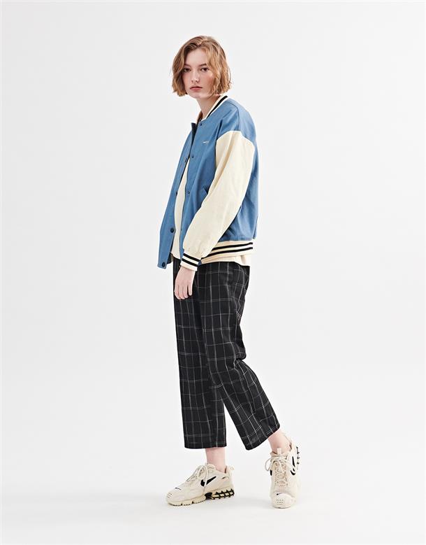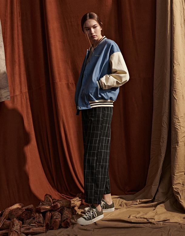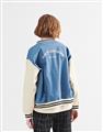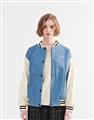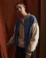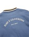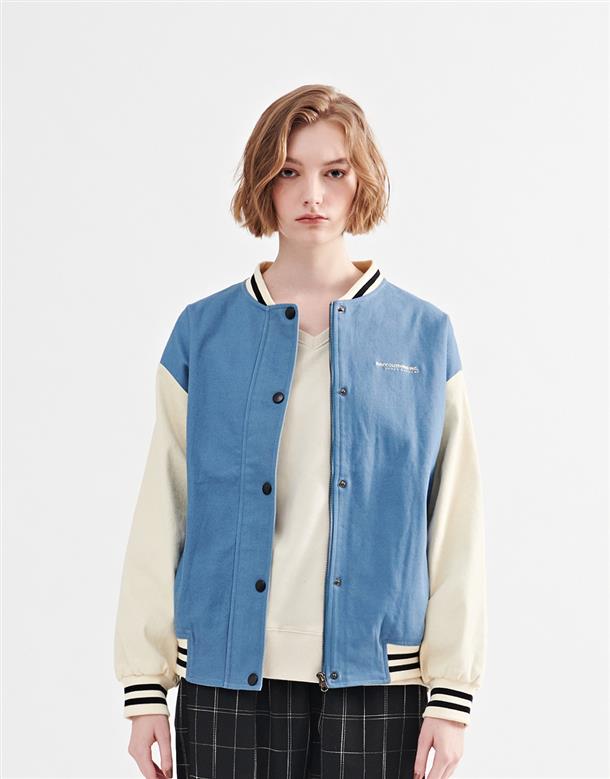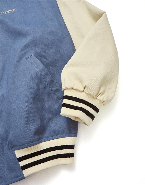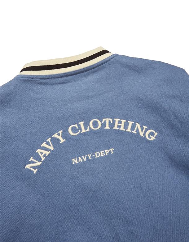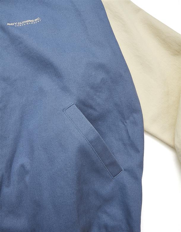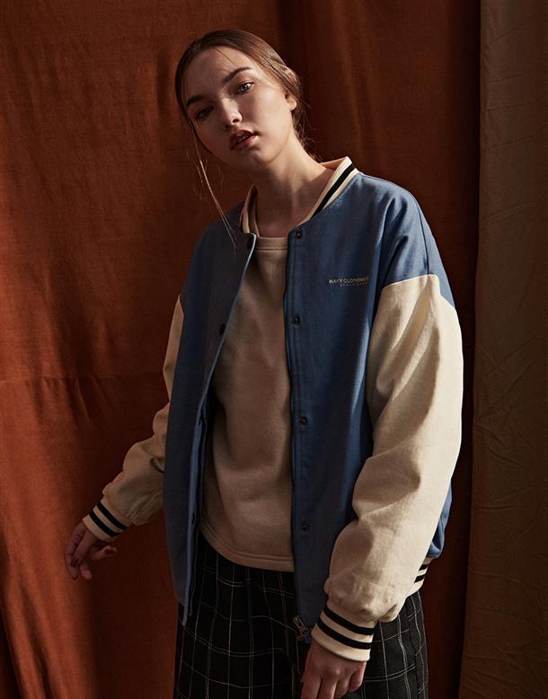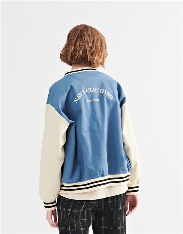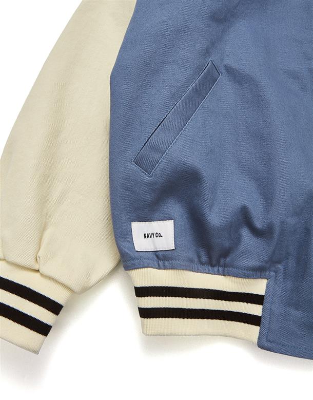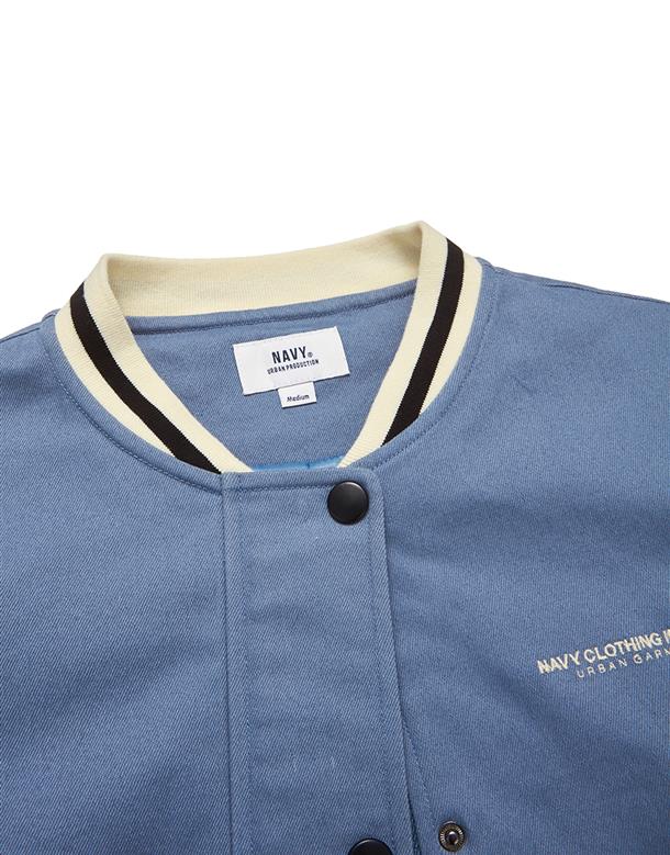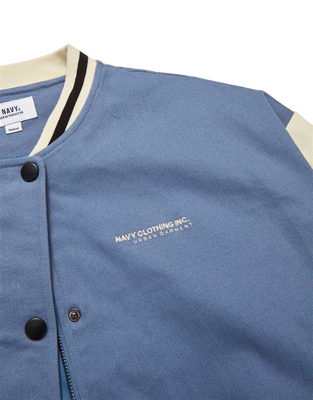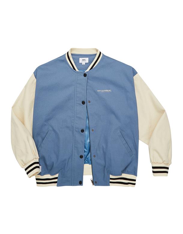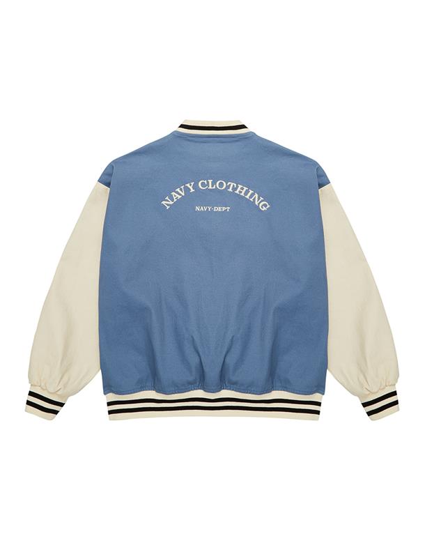 NAVY品牌繡花,斜紋彈性落肩棒球大外套。