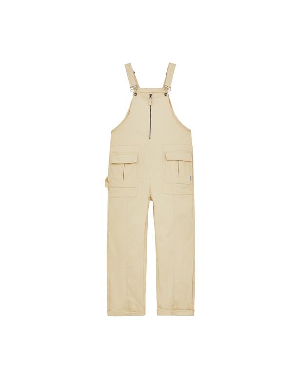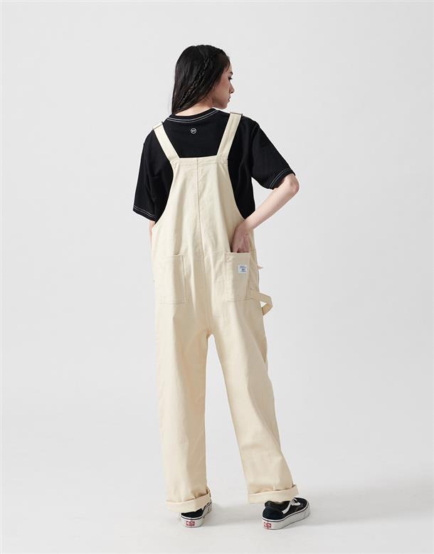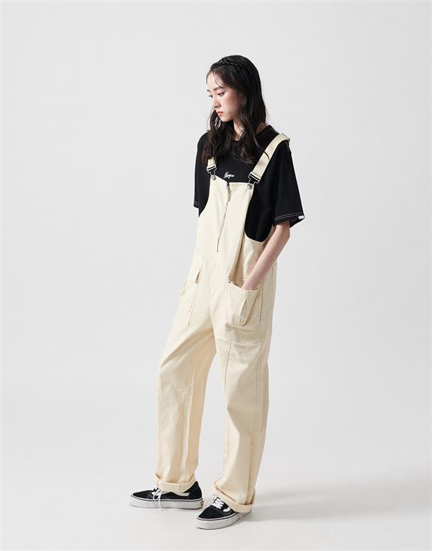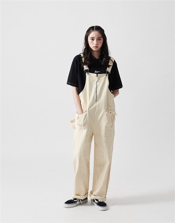 口袋工裝吊帶褲,門襟拉鍊式,造型穿搭款。
