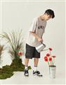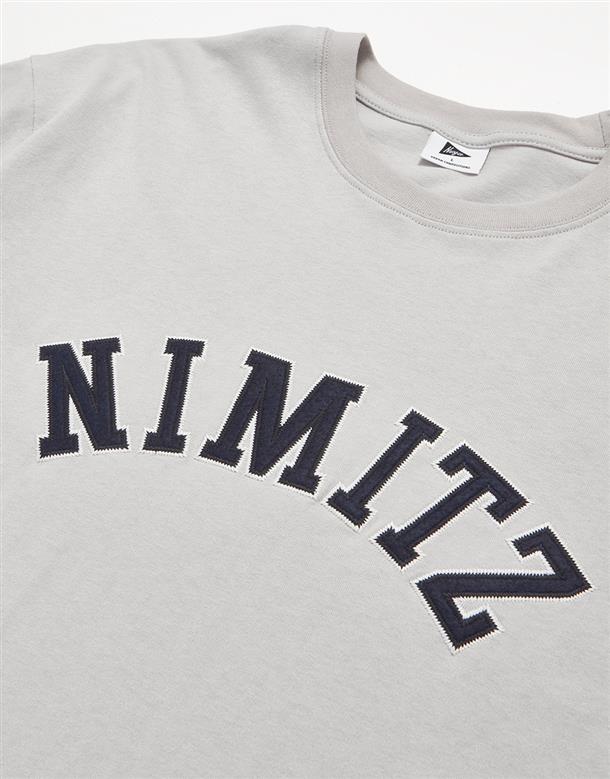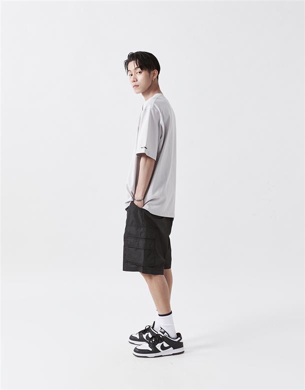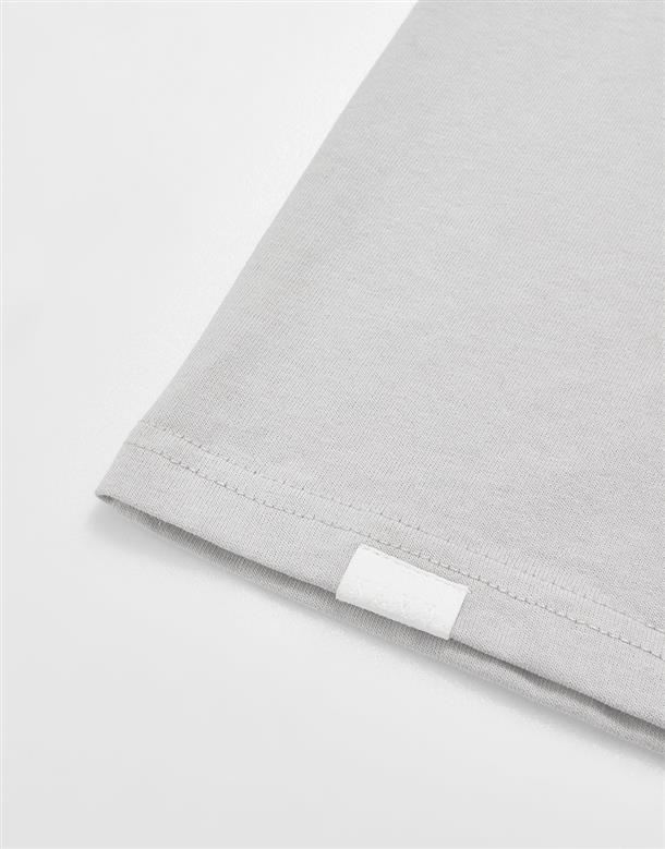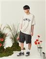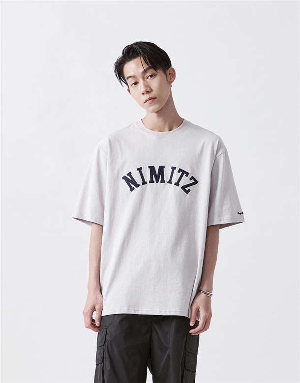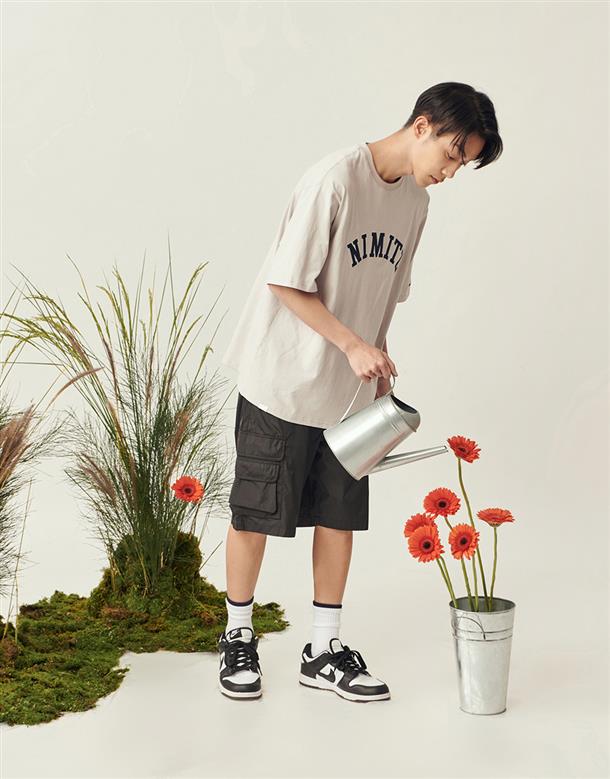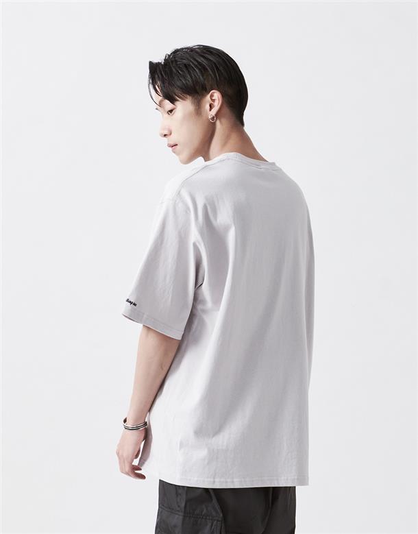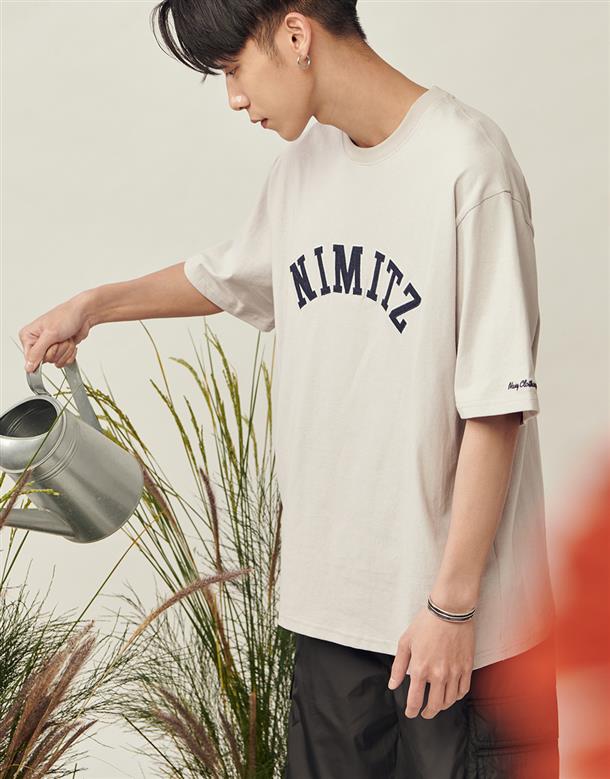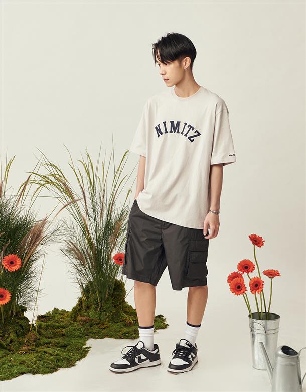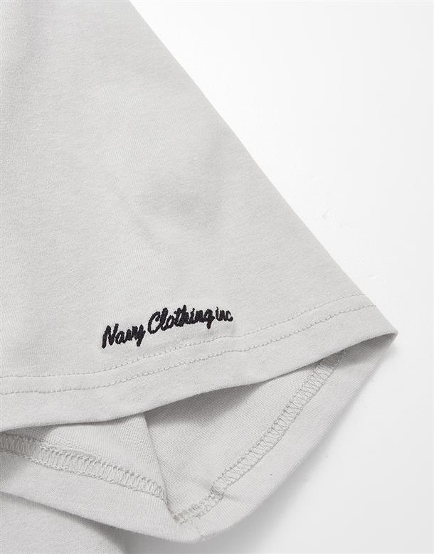 雙層麂絨包變繡弧形字體重磅麻棉洗水款短TEE。