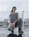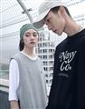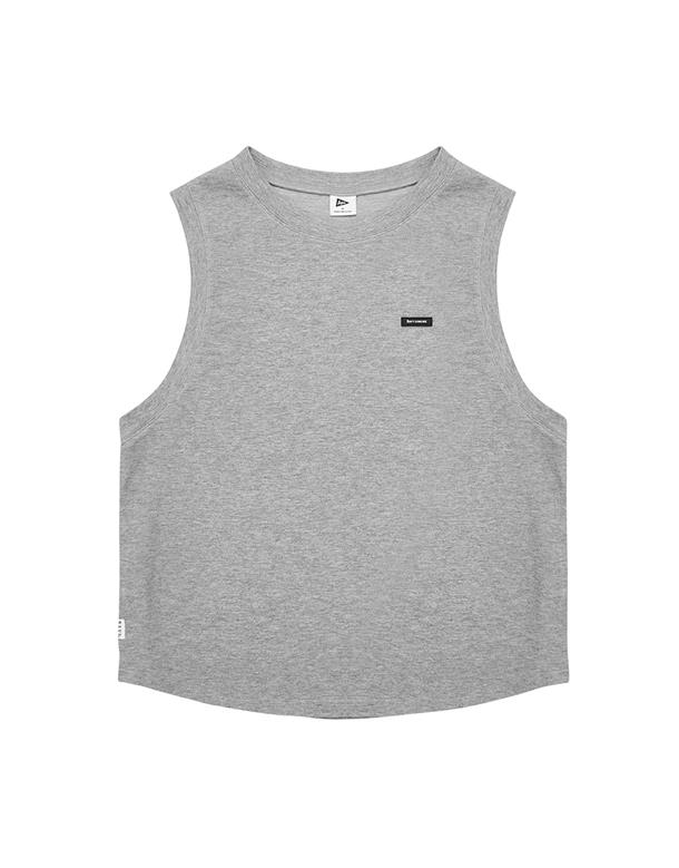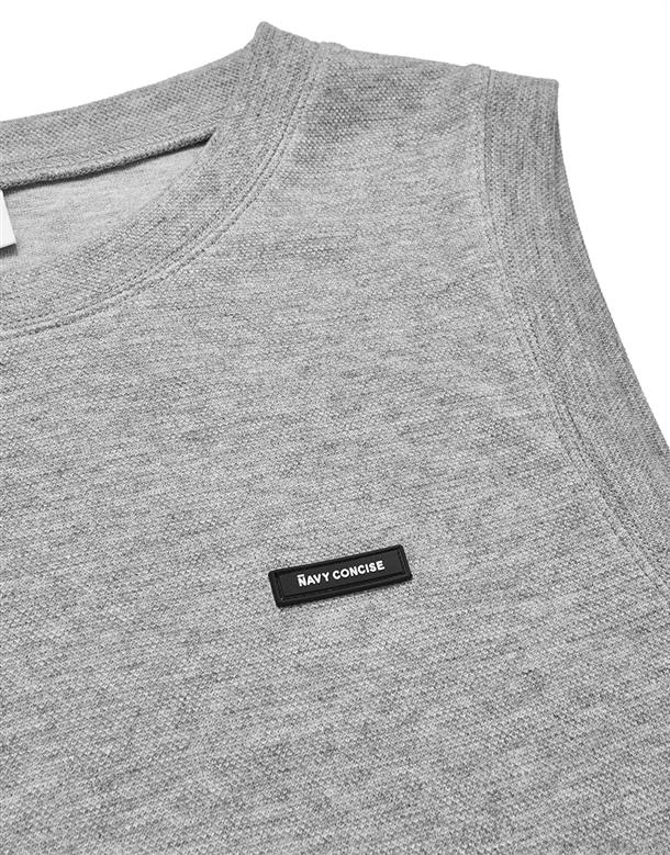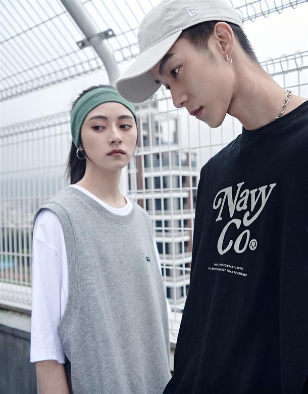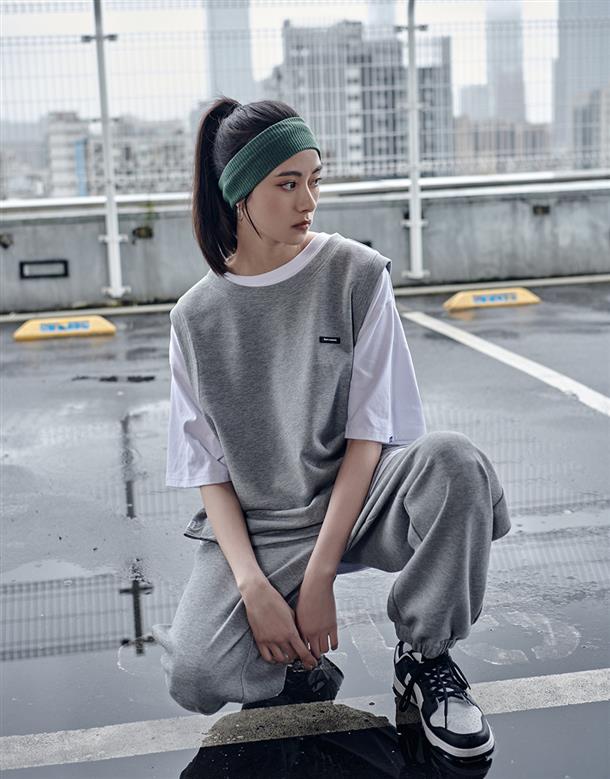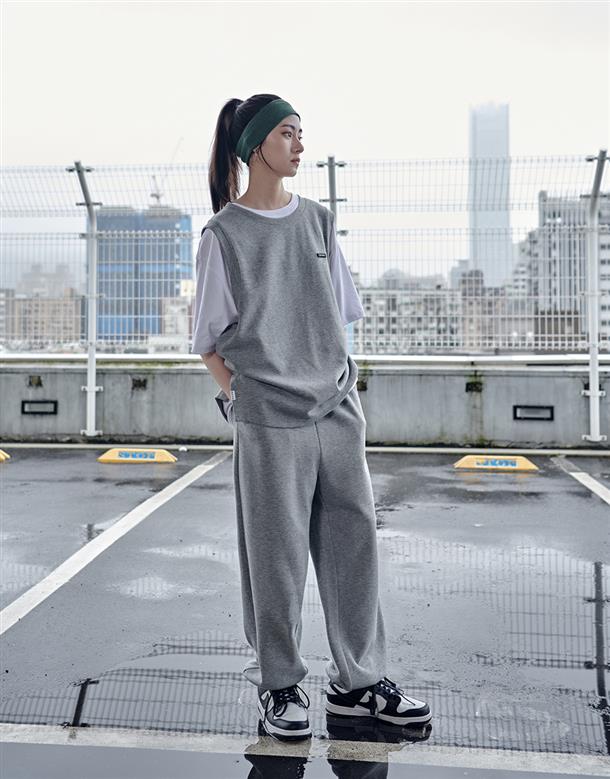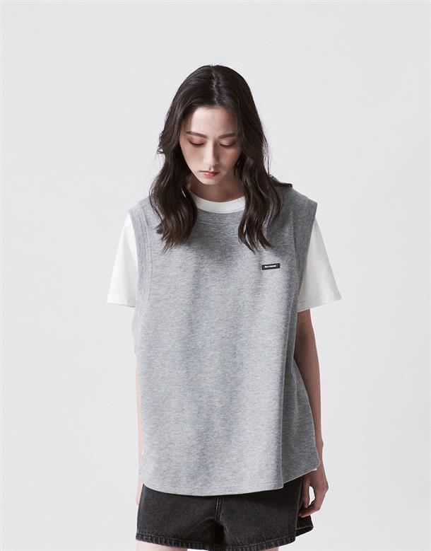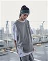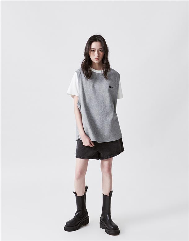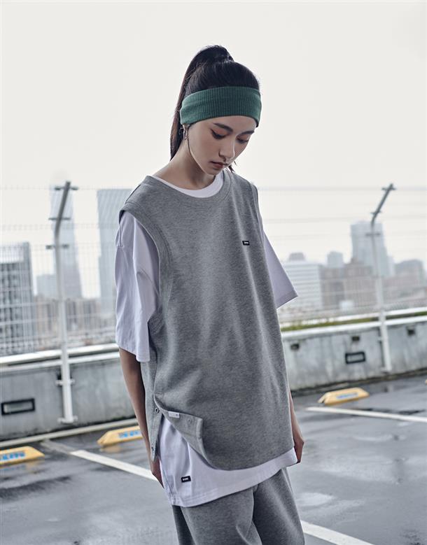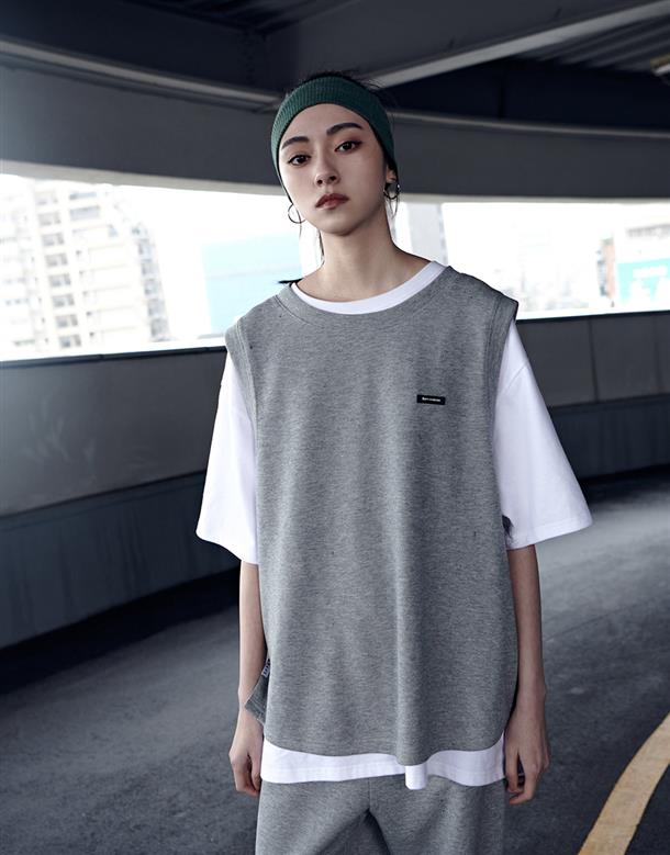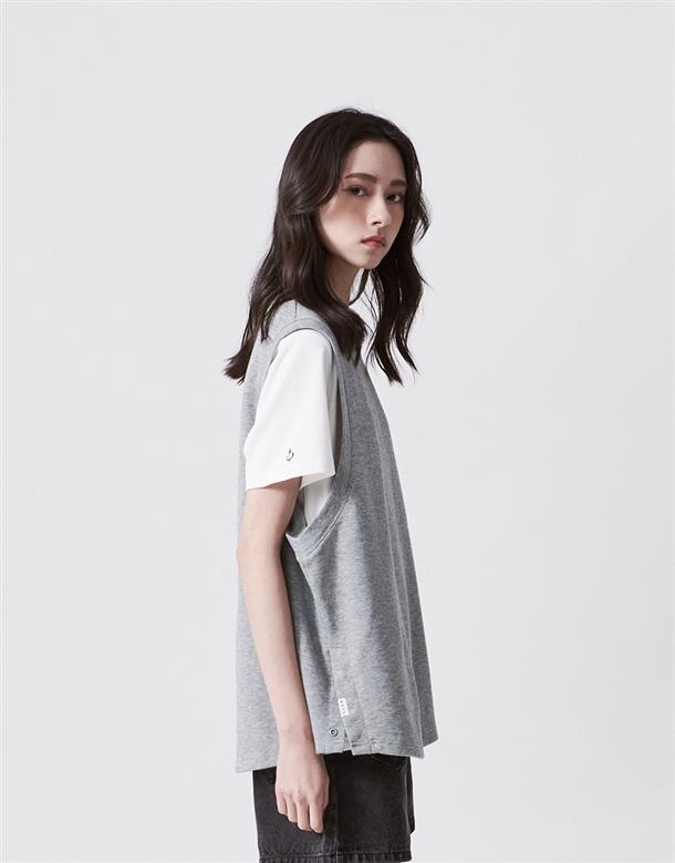 Navy City Girl著用,柔軟華夫格面料,下襬開衩可露出內短TEE造型,寬鬆版型背心。