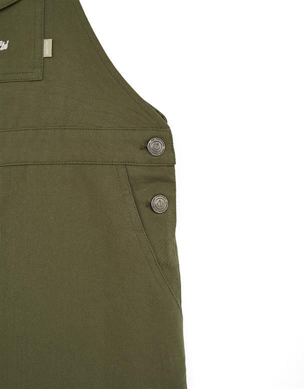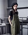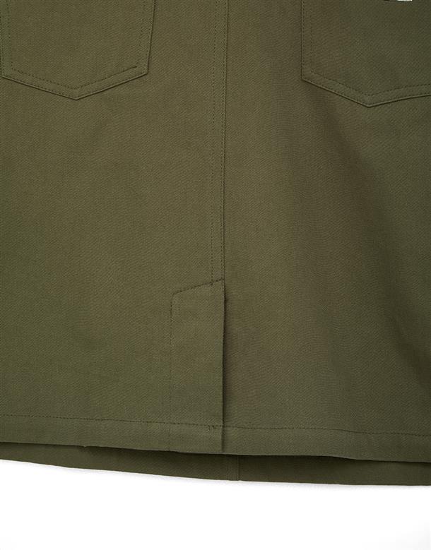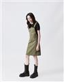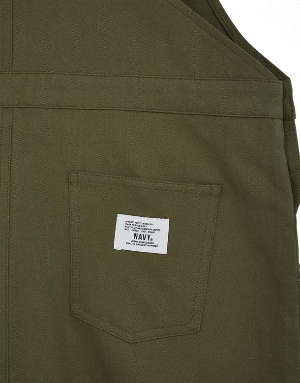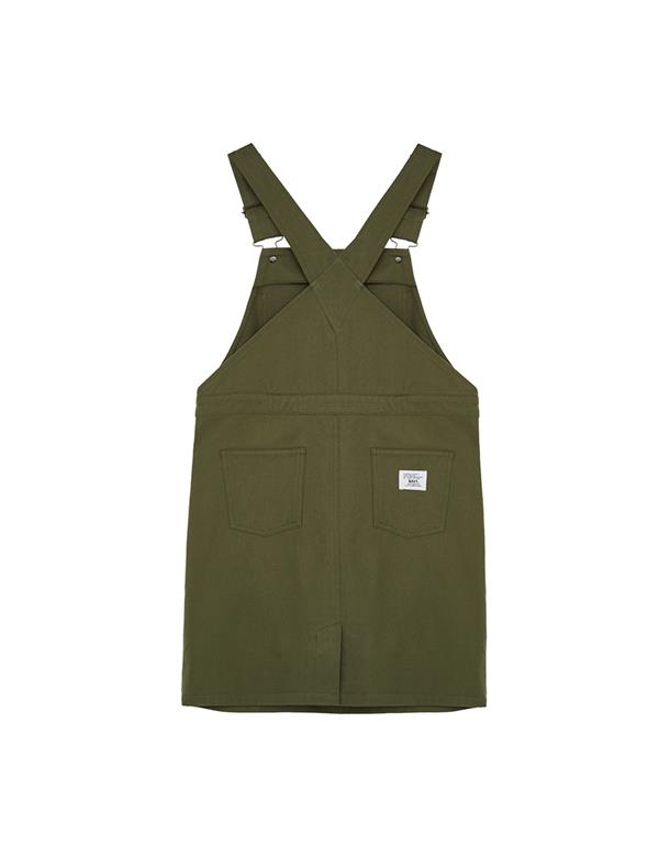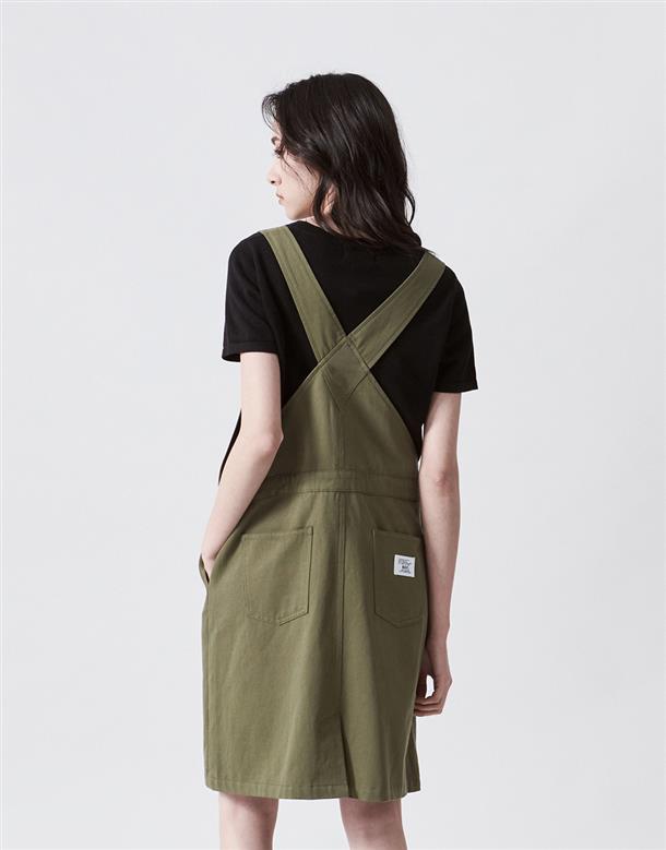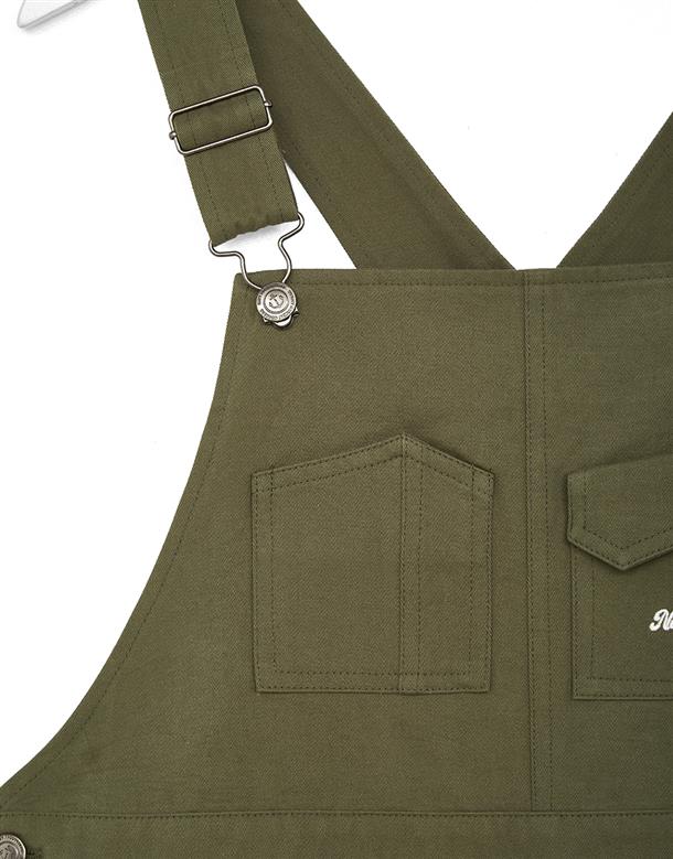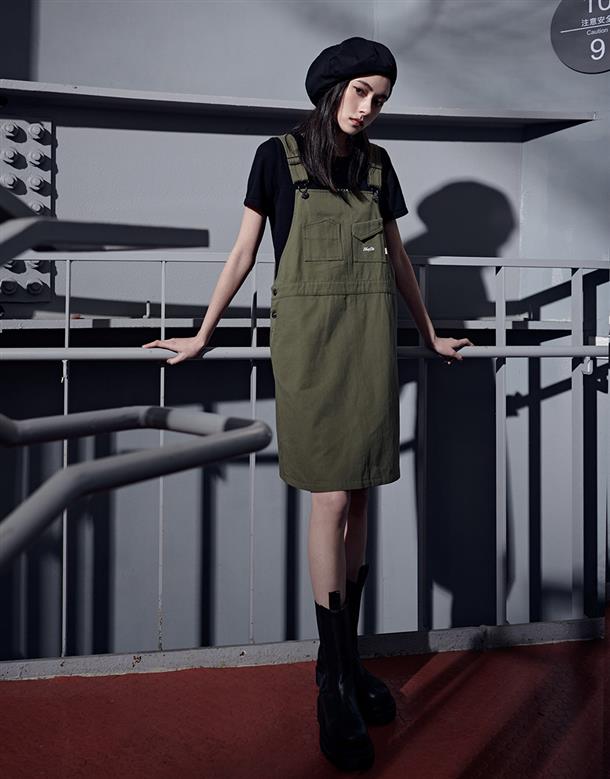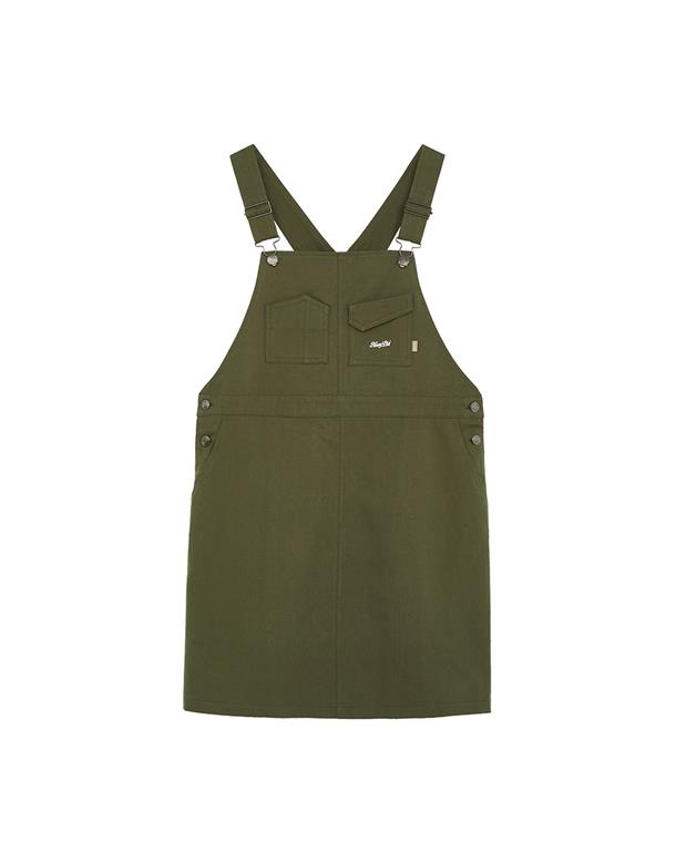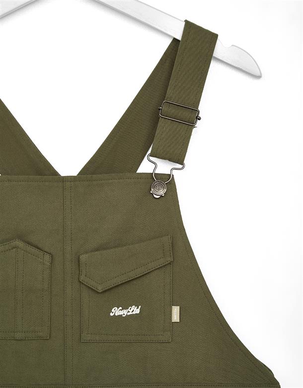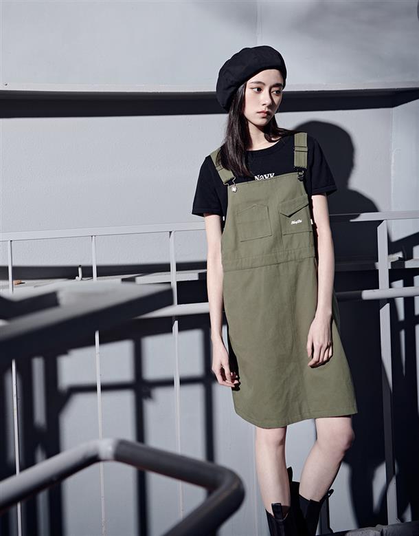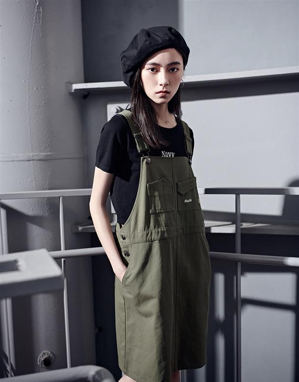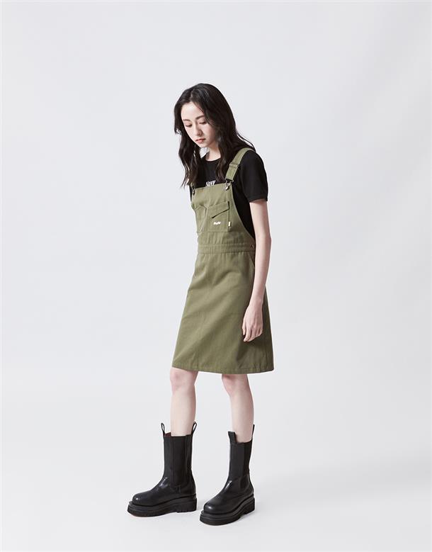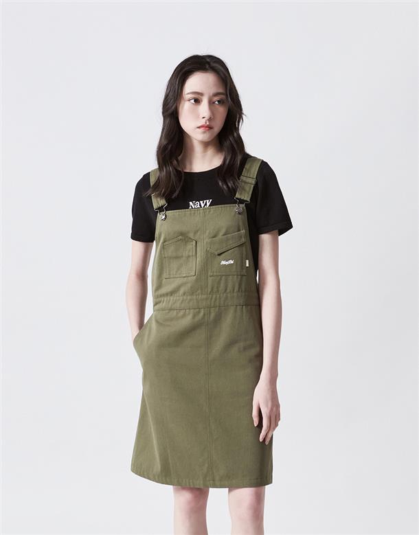 Navy City Girl著用,質感棉料,後片下襬開衩好活動,多口袋設計工裝吊帶裙。