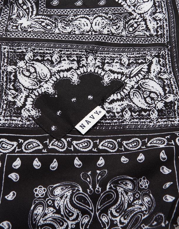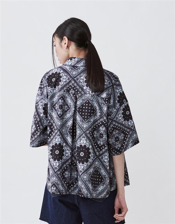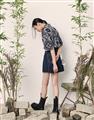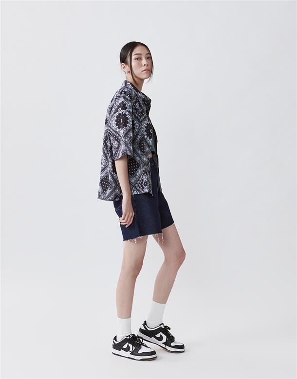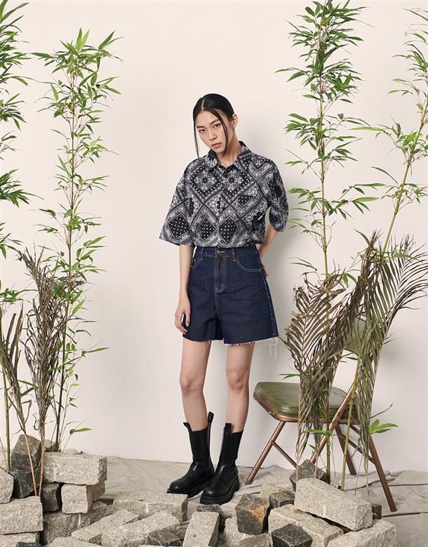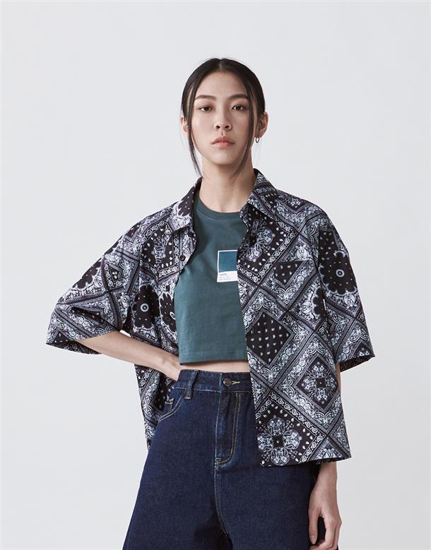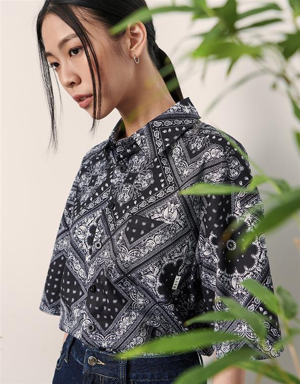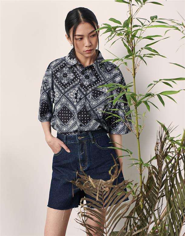 Navy City Girl著用,佩斯利花紋古巴領短襯,個性流行款,肩線前移,前短後長。