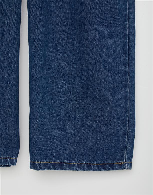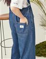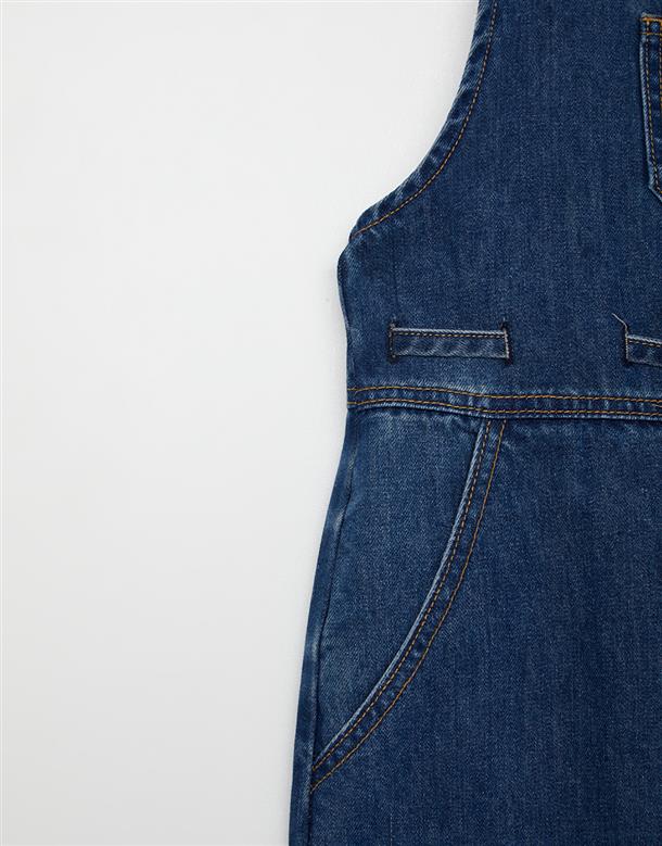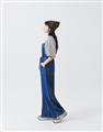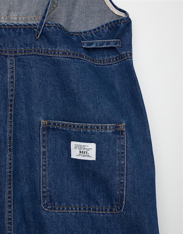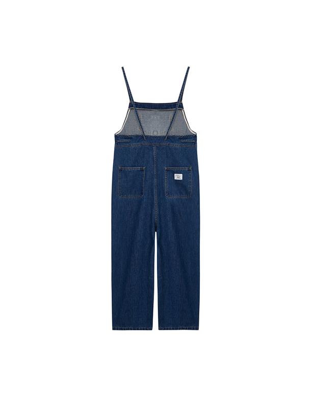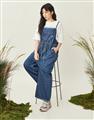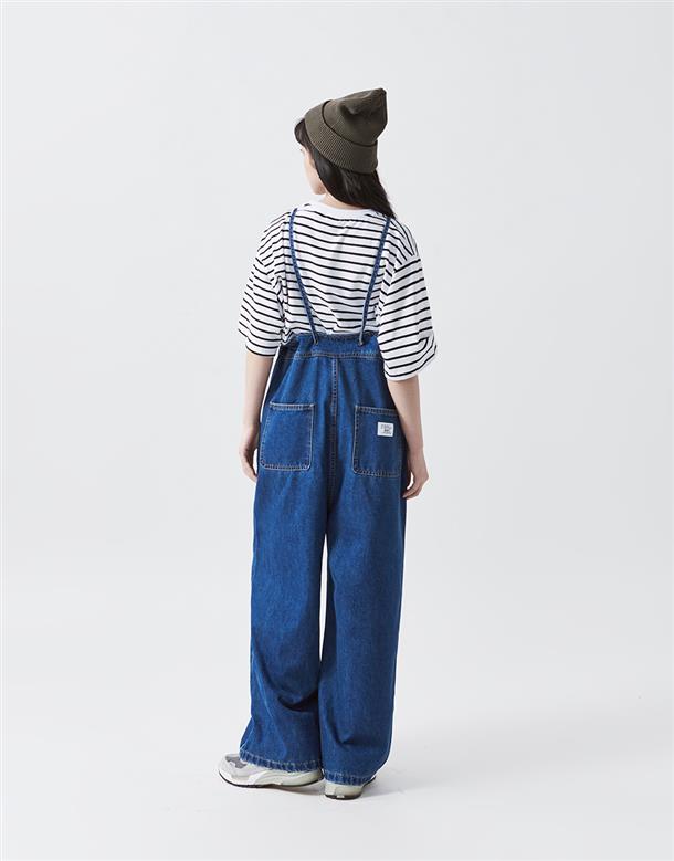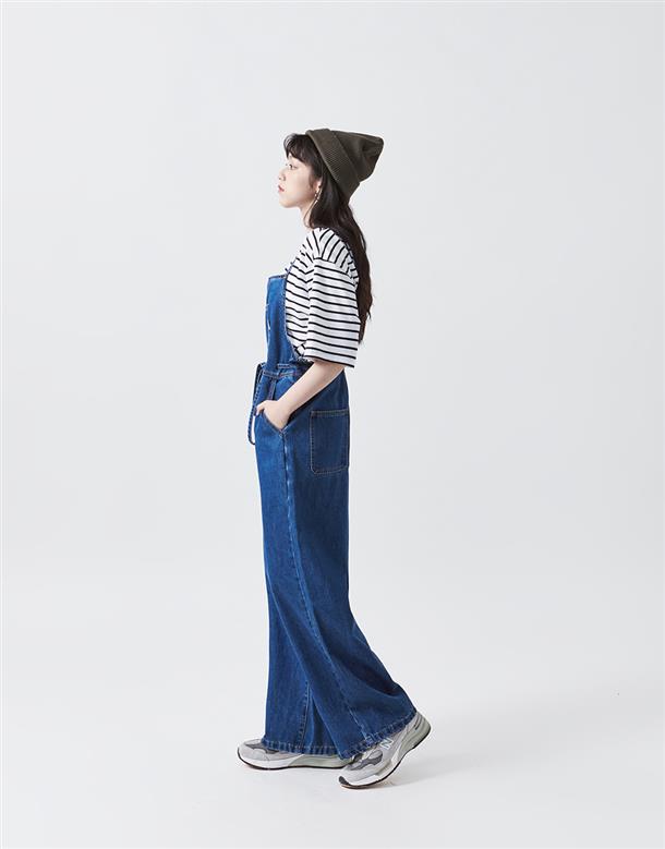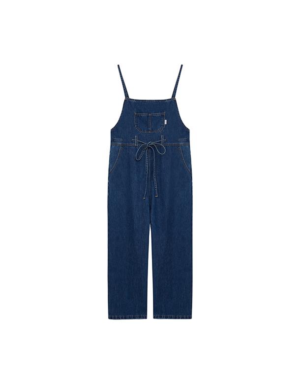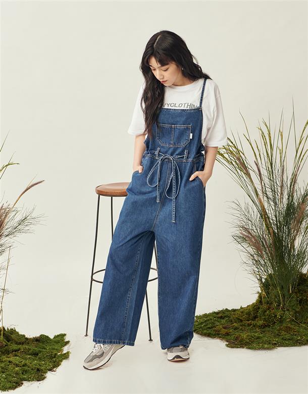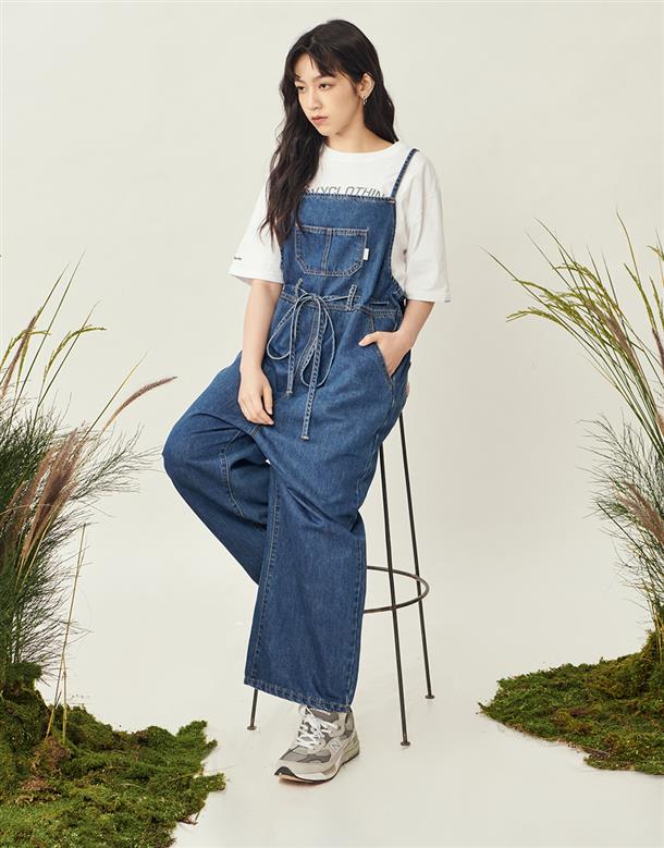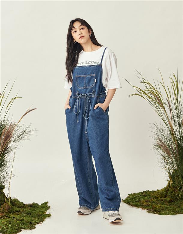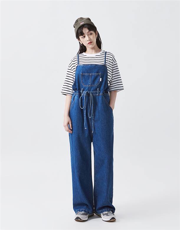 Navy City Girl著用,綁繩牛仔吊帶褲,率性造型流行款。