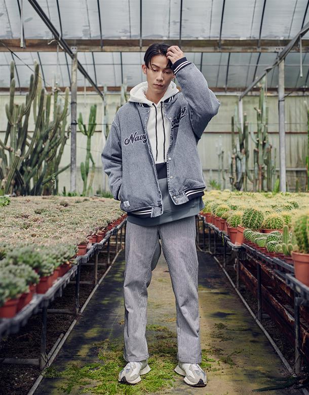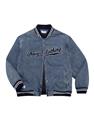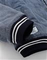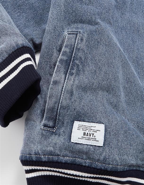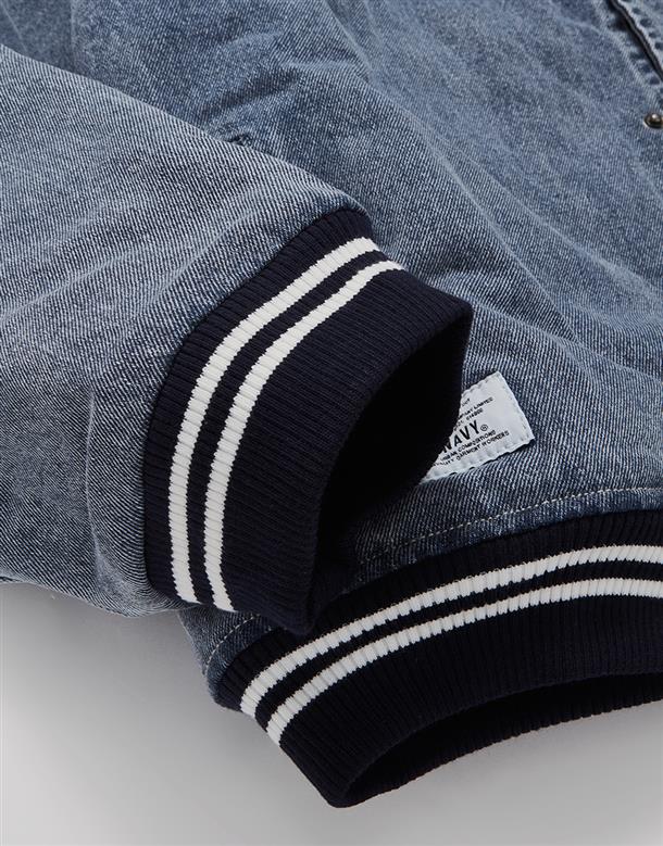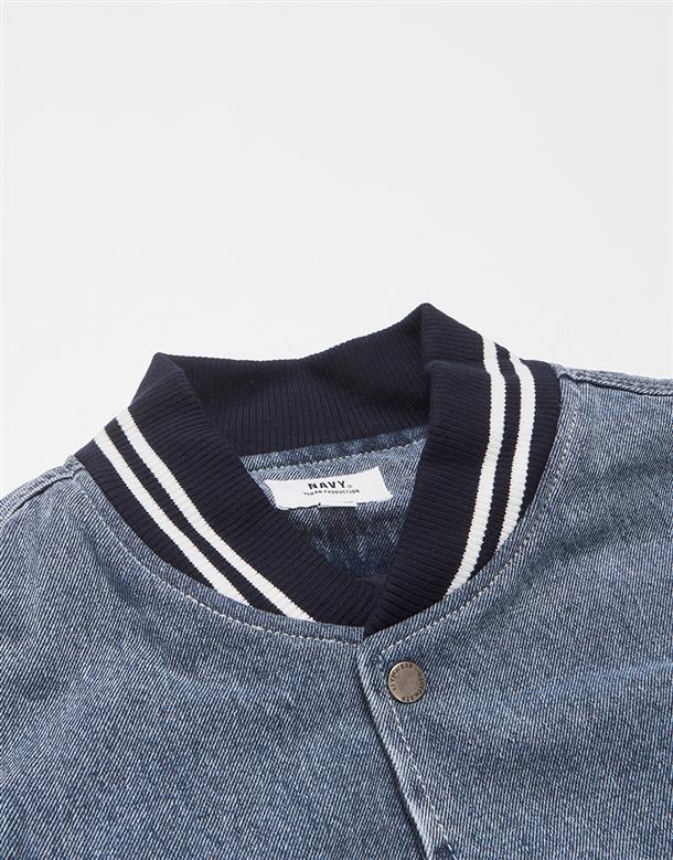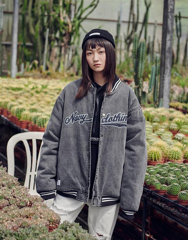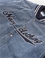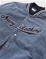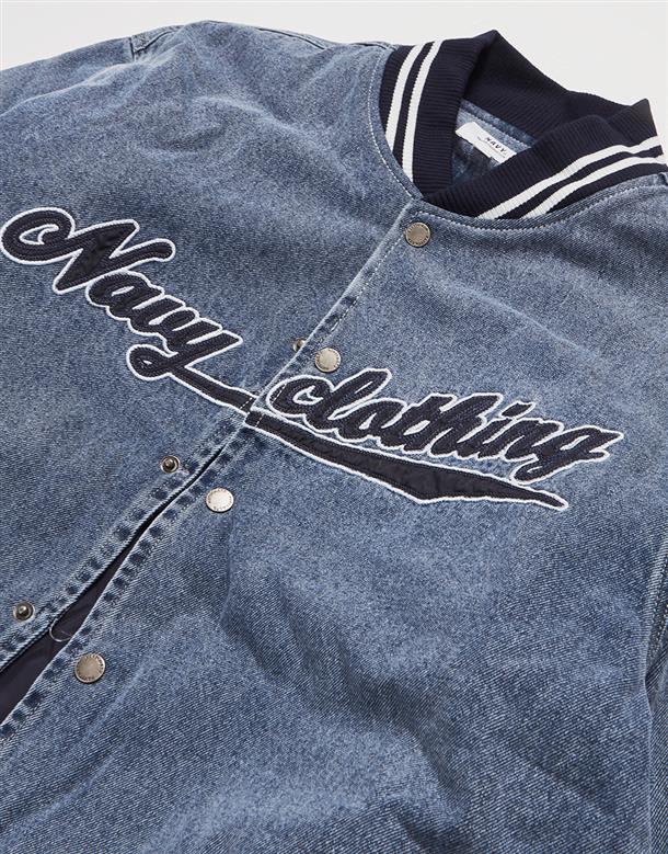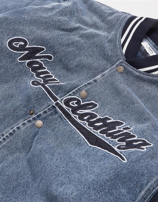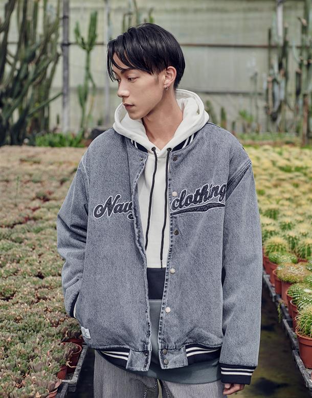 秋冬必備經典百搭洗水牛仔貼布繡落肩棒球外套。