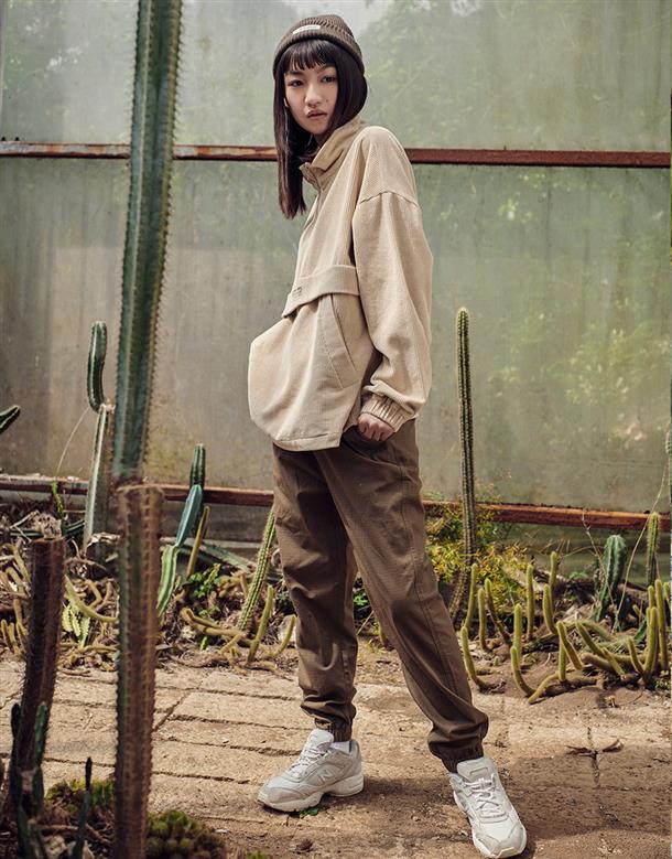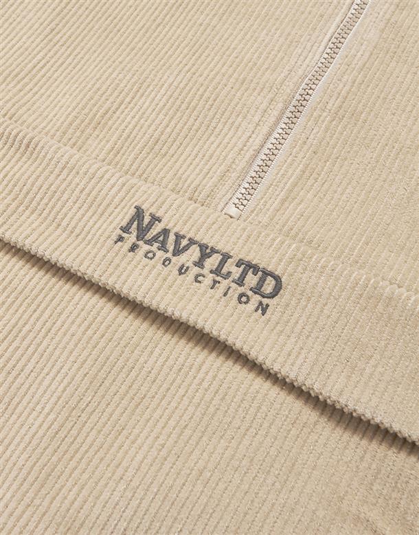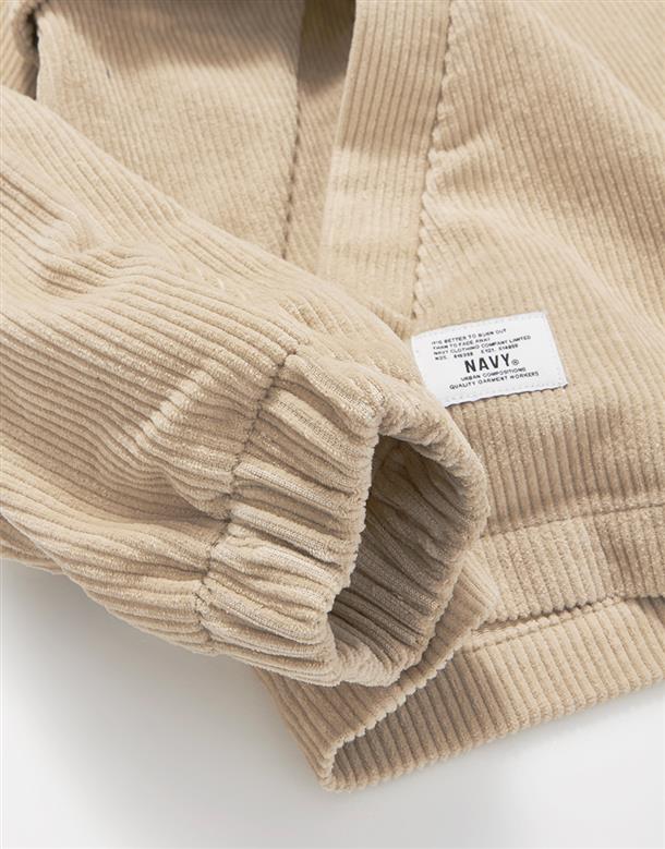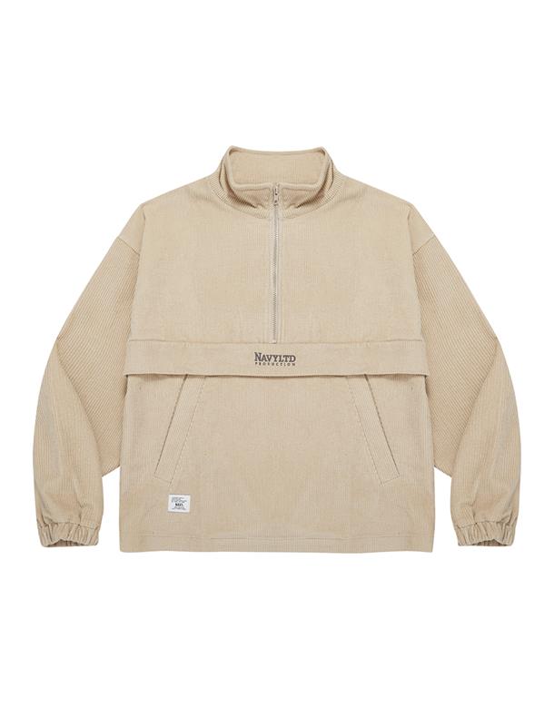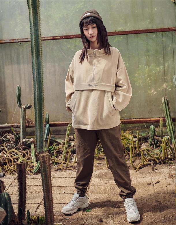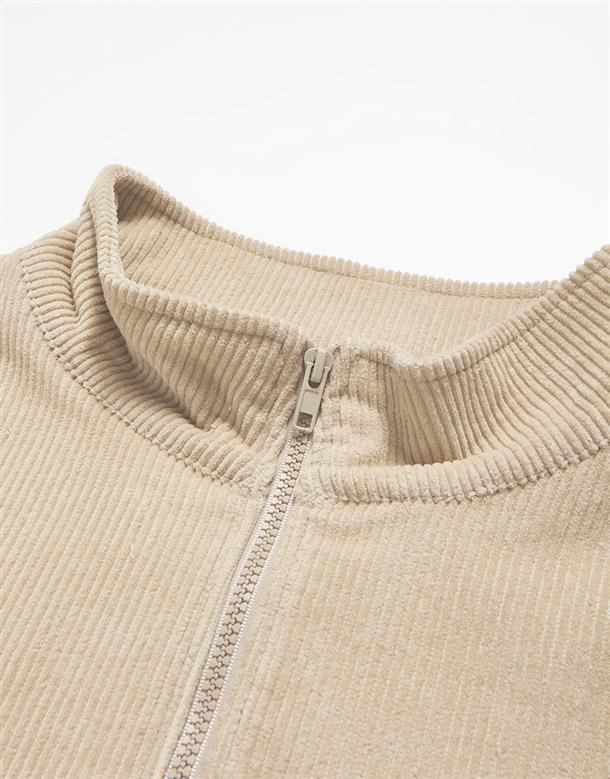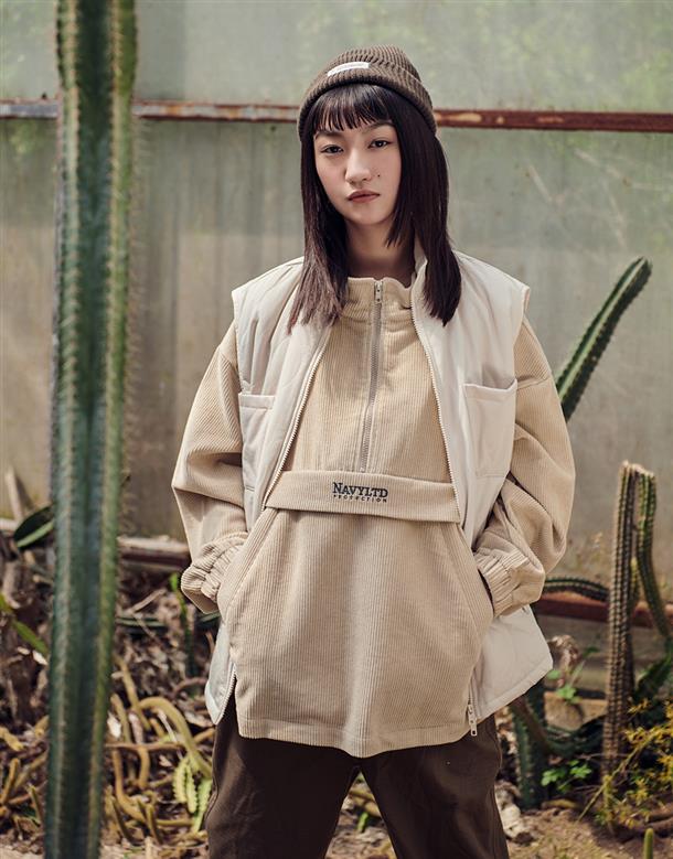 燈芯絨材質,落肩微寬鬆版型,半開襟拉鍊設計,左右插袋x2,電繡LOGO。