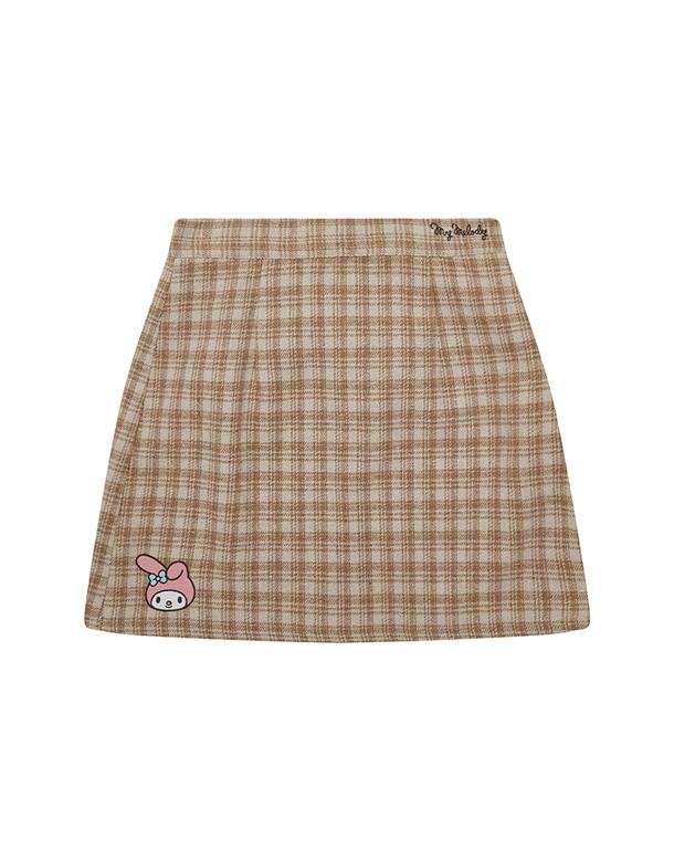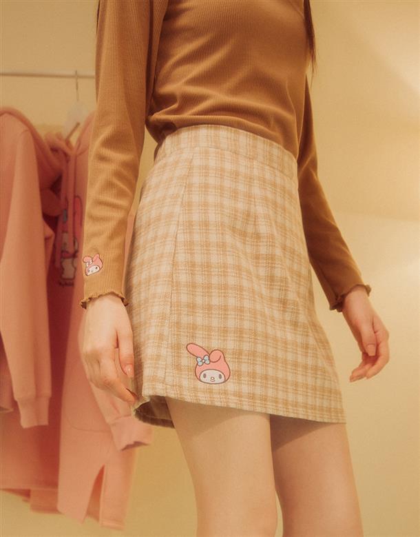 毛呢感格紋短裙,美樂蒂電繡,舒適搭配款。