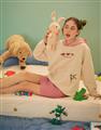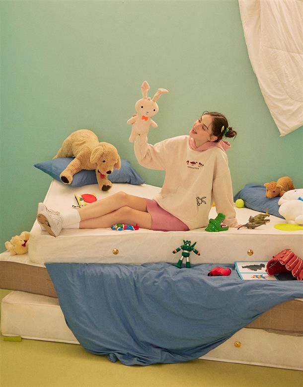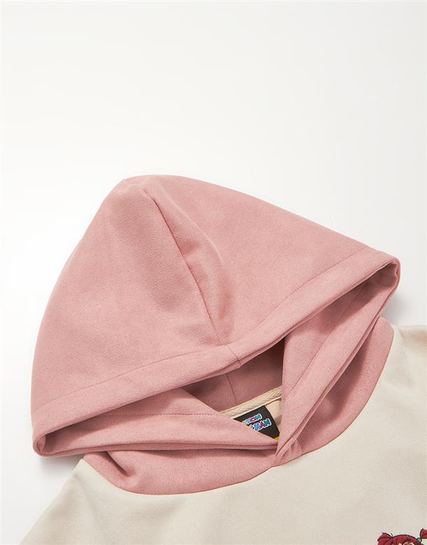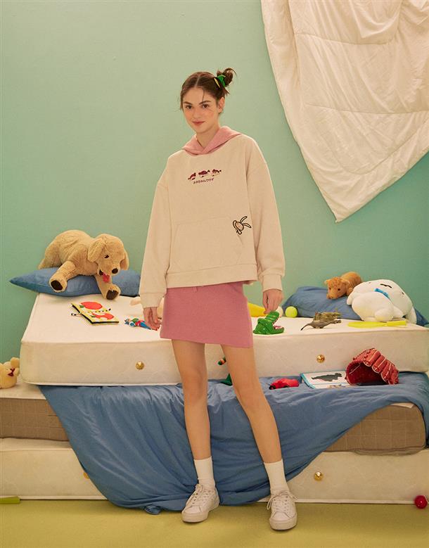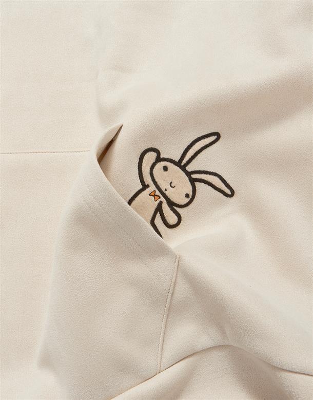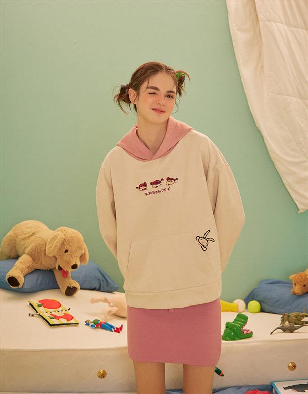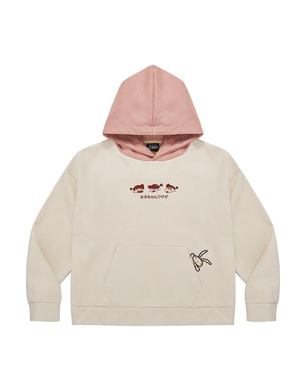 妮妮撞色帽TEE,精緻小物電繡設計,口袋兔子絨布貼布繡,舒適麂皮絨面料。