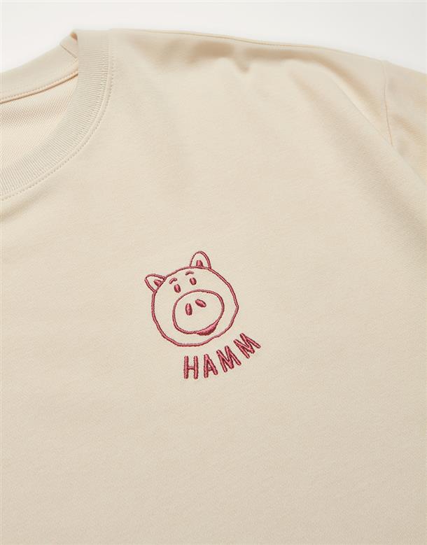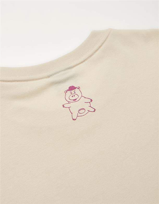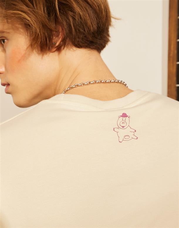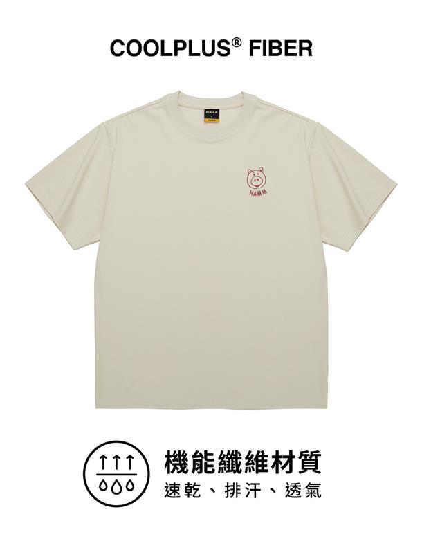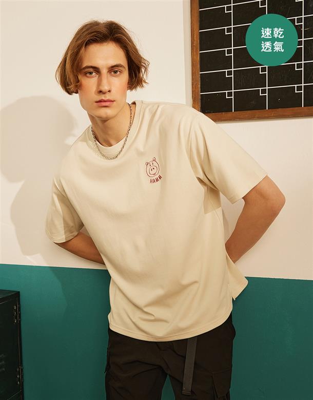 訂製機能透氣面料,內層採用吸濕排汗原紗織製而成,落肩寬鬆版火腿豬設計短TEE。