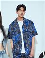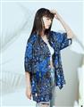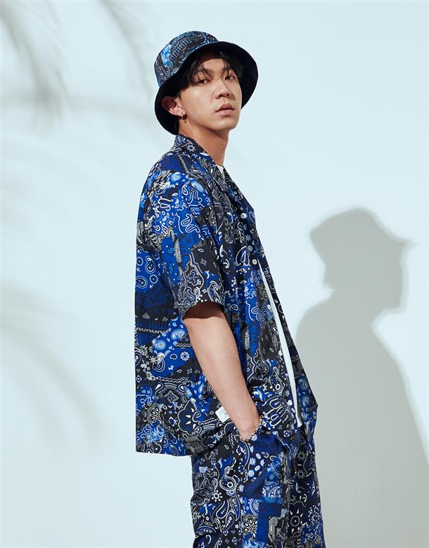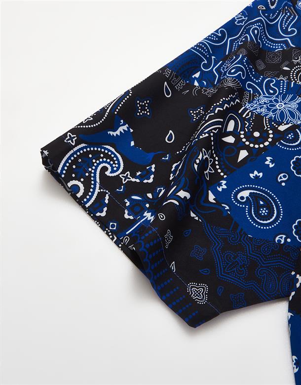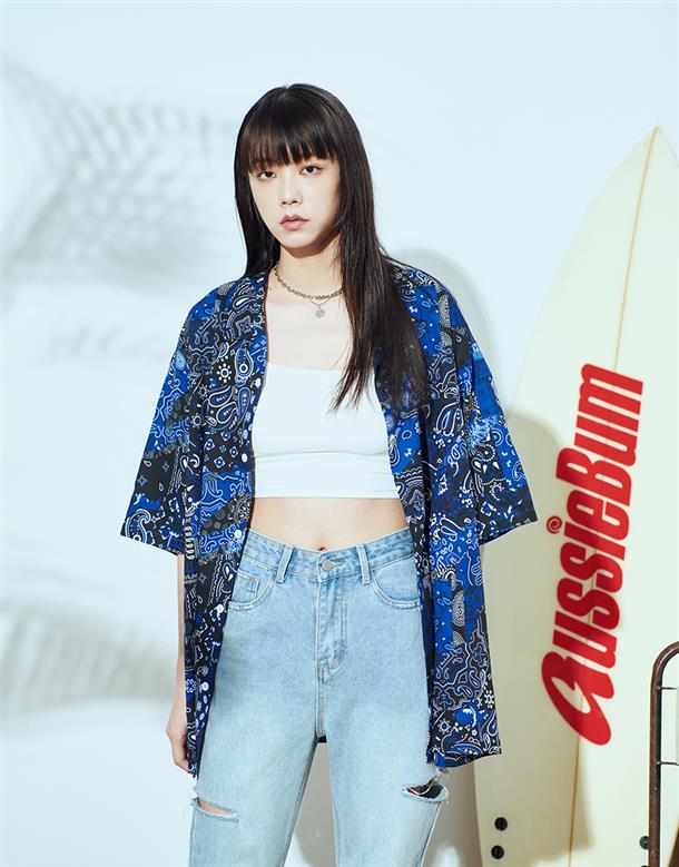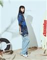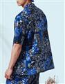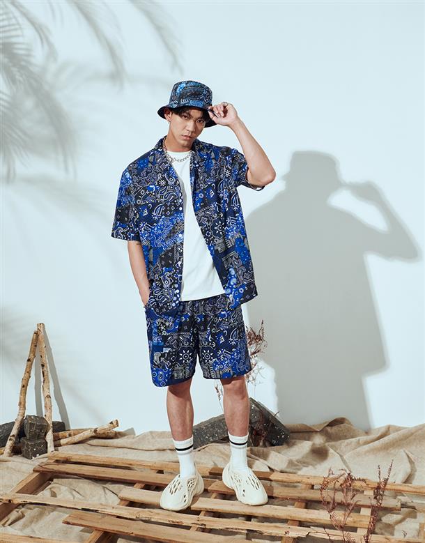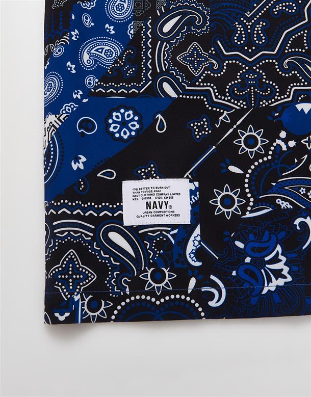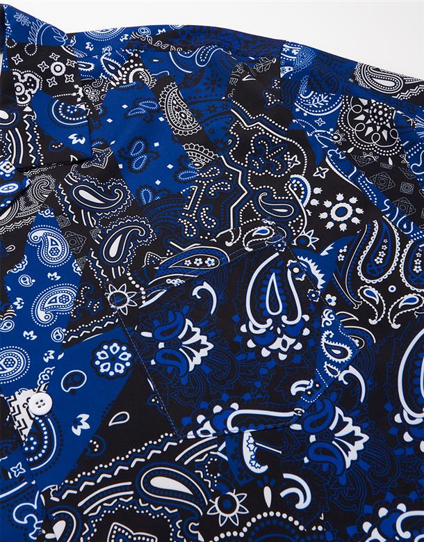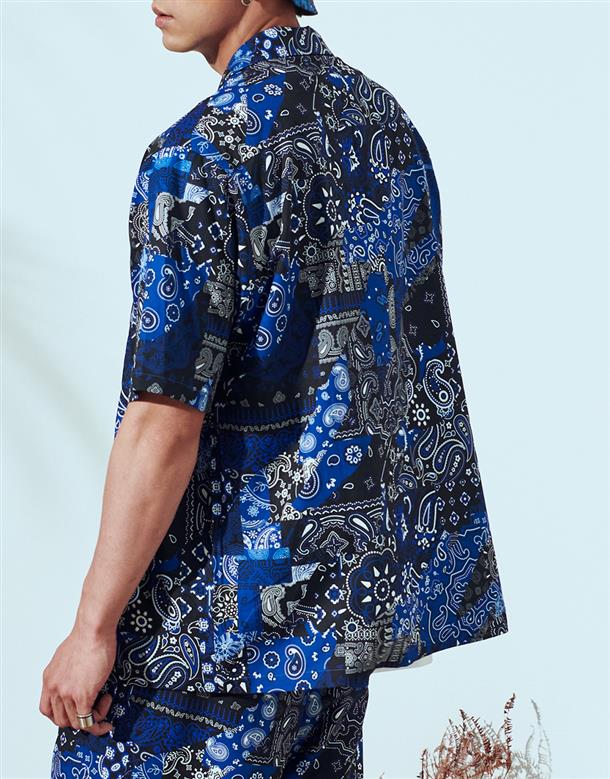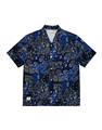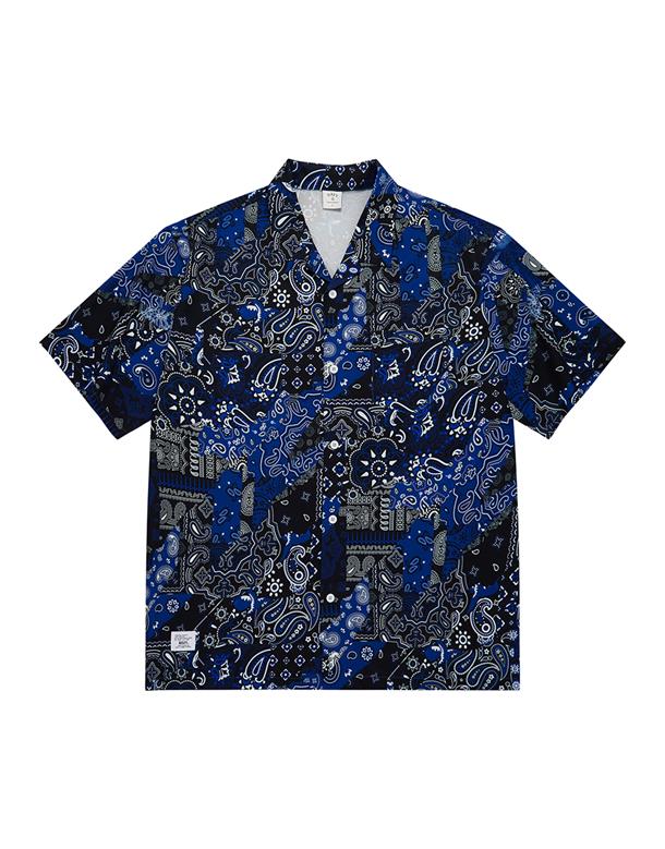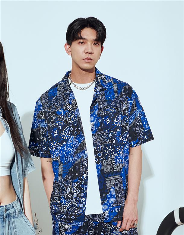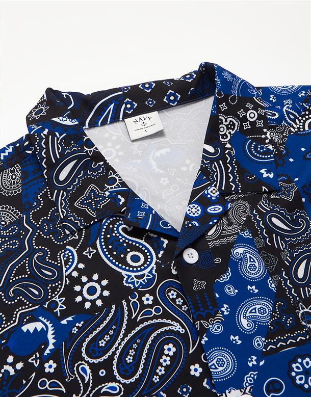 NAVY拼接變形蟲夏季輕薄面料穿搭款,開襟領短袖襯衫。
