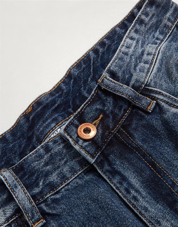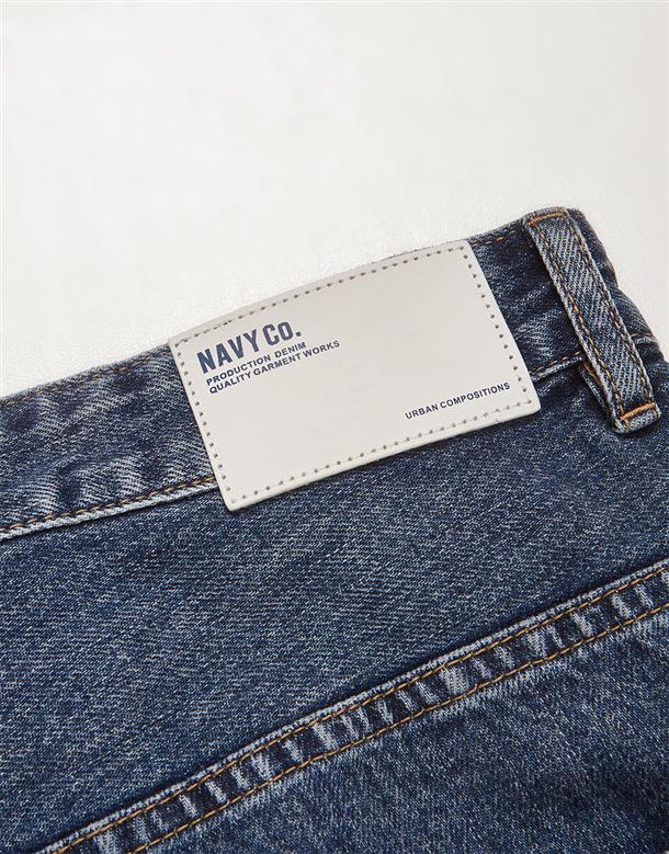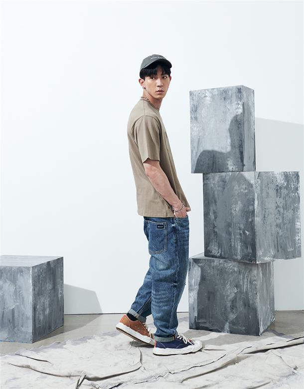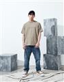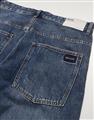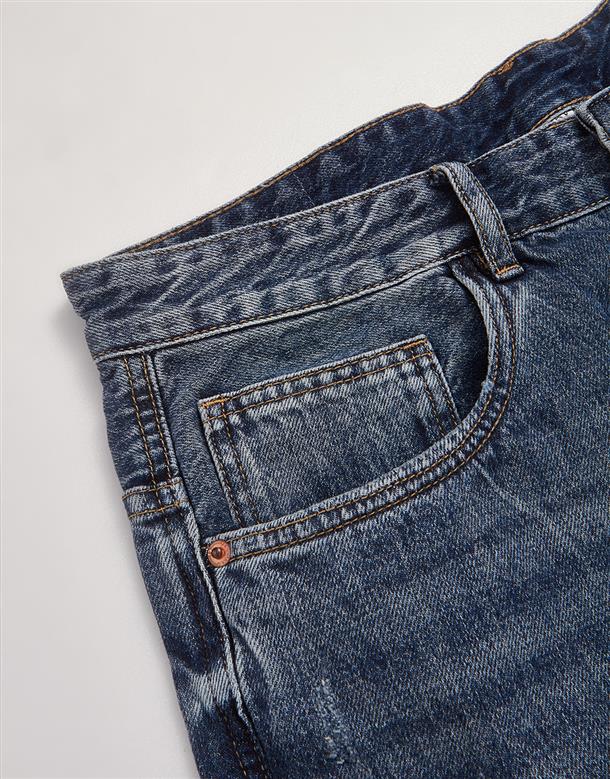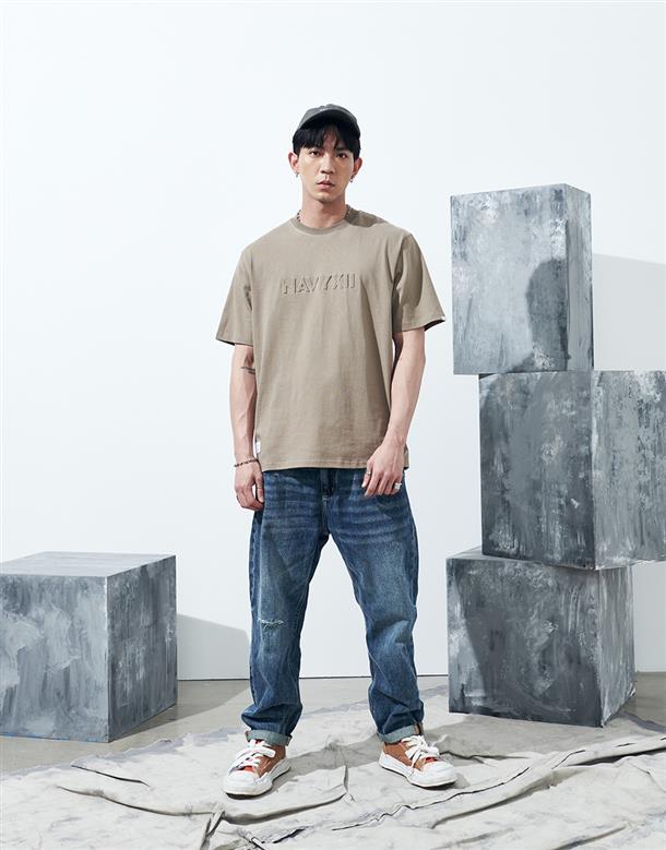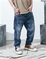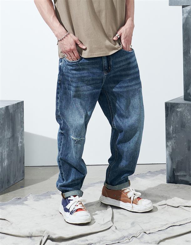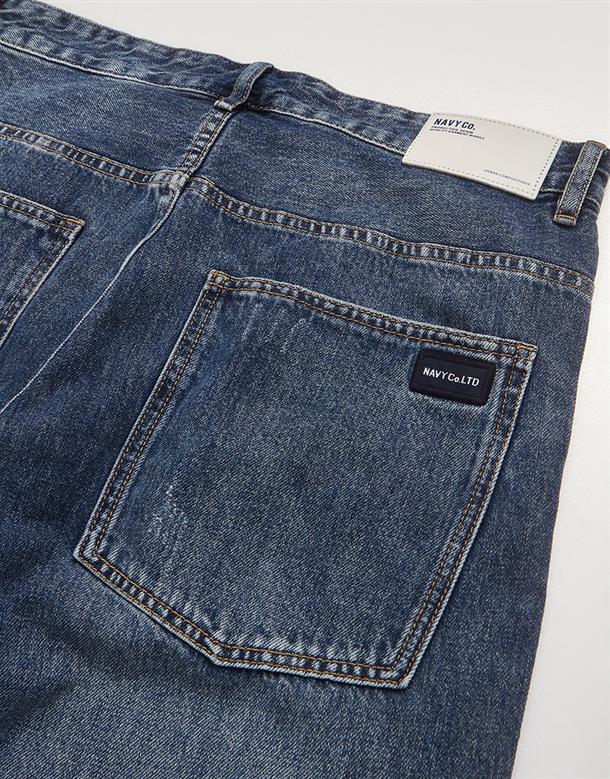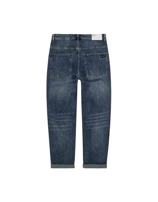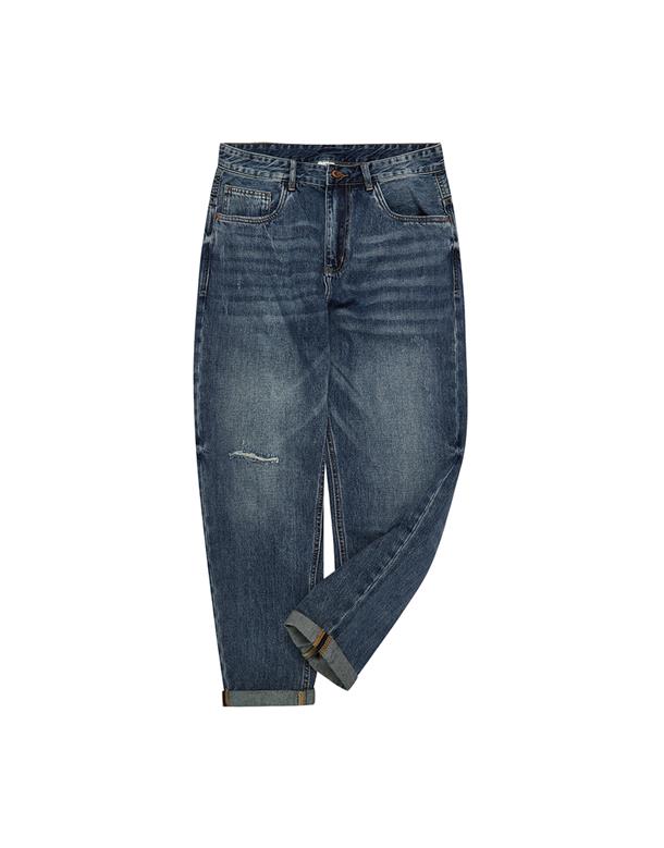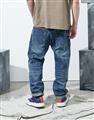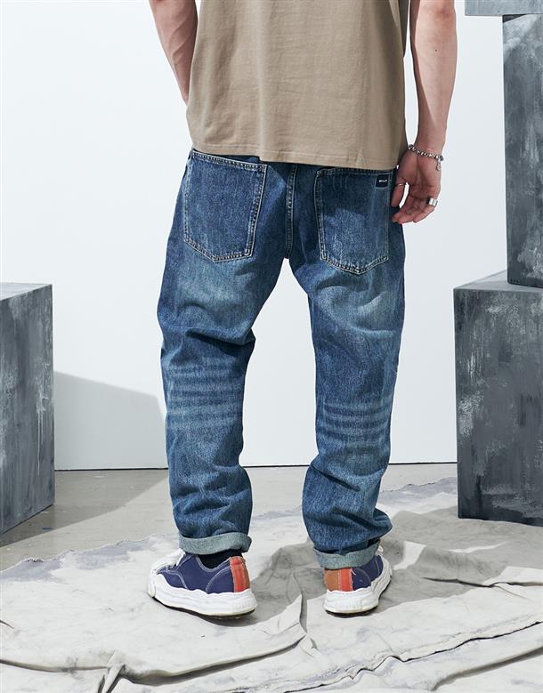 雪花洗水落色款微錐形修身版型牛仔長褲。