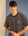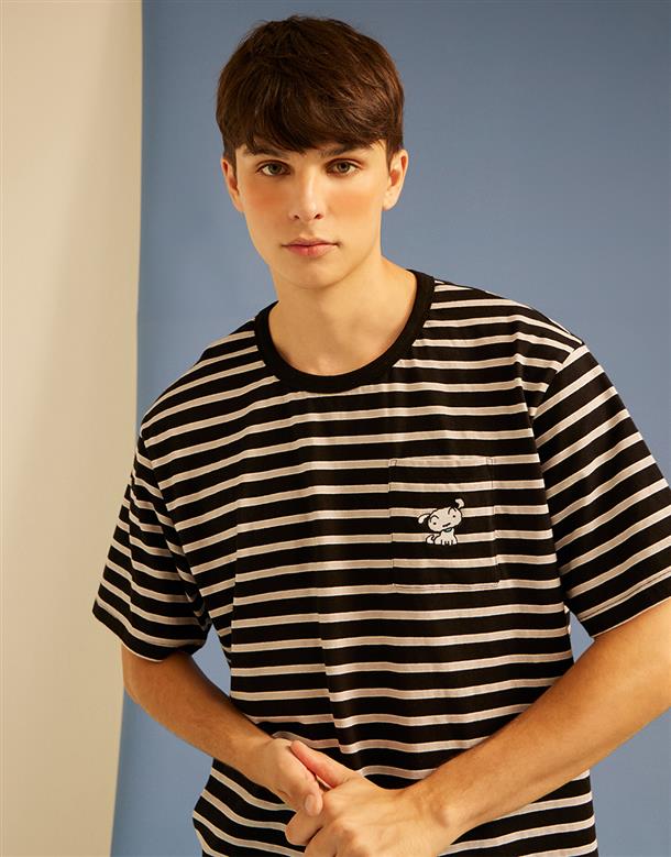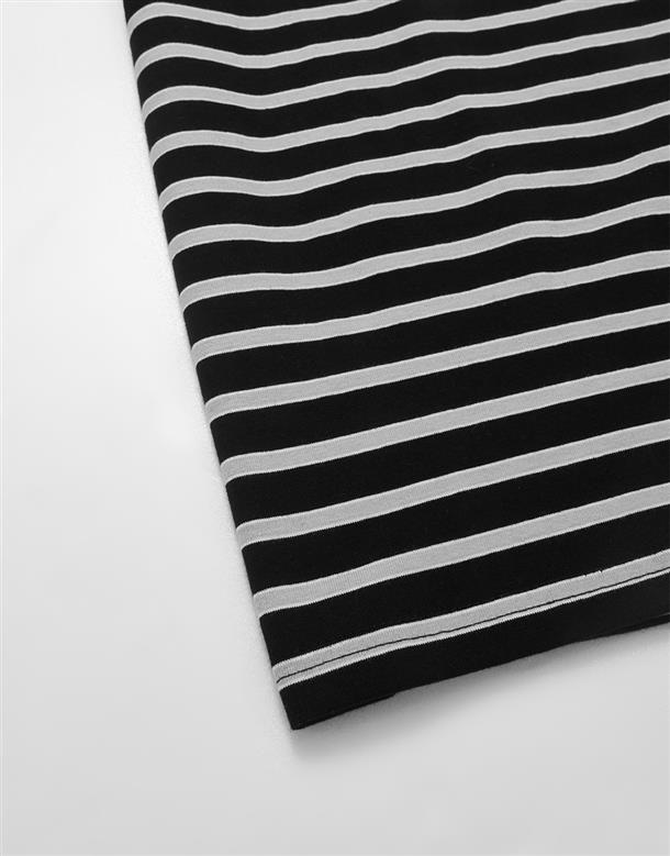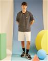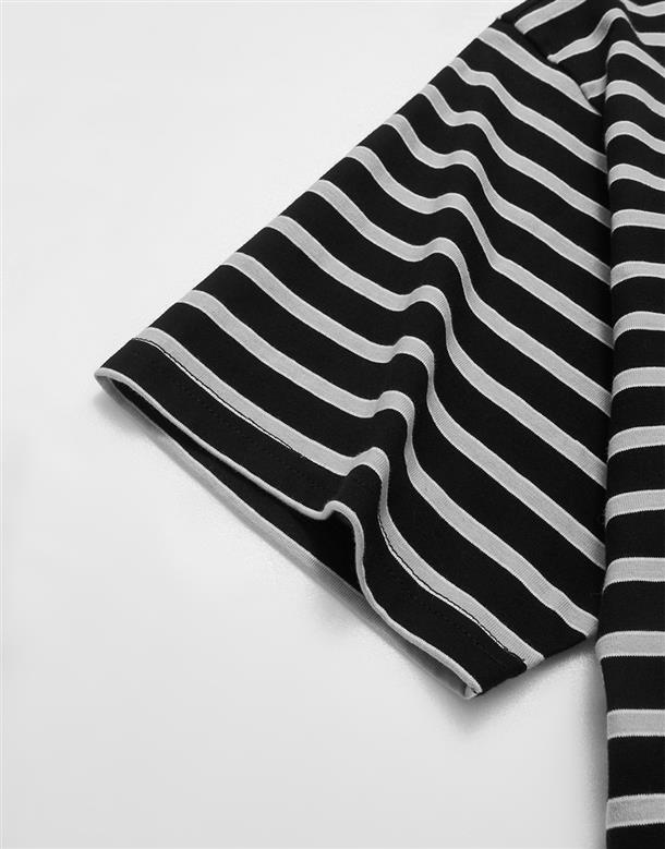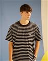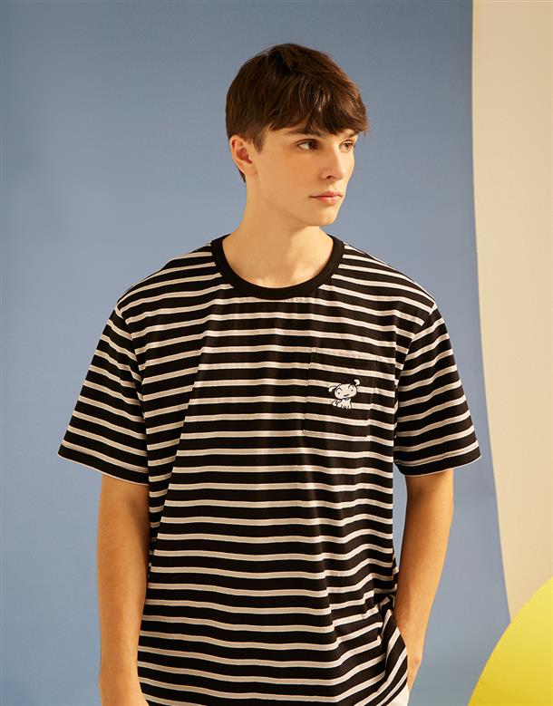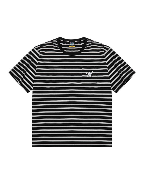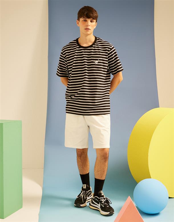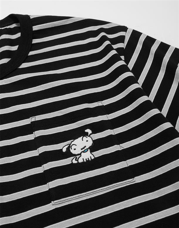 小白精緻電繡,口袋條紋落肩滾領短TEE。