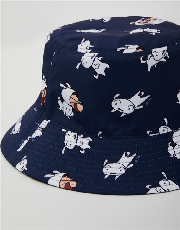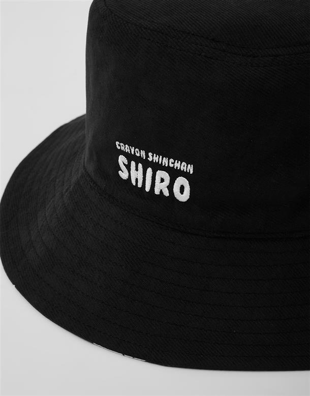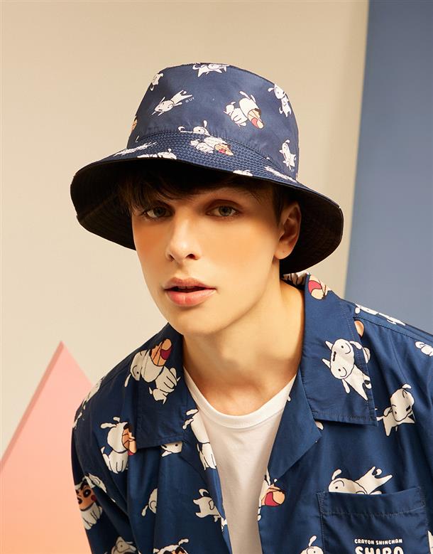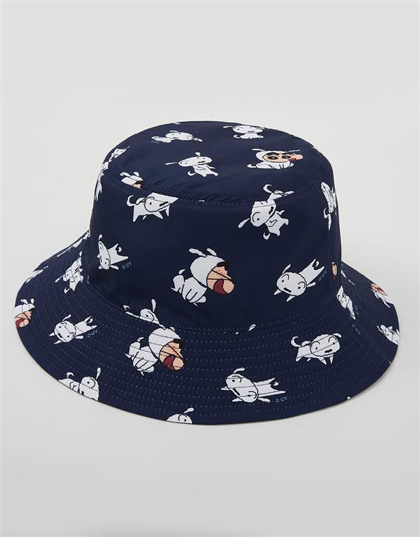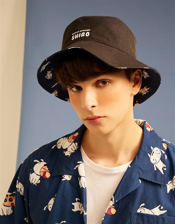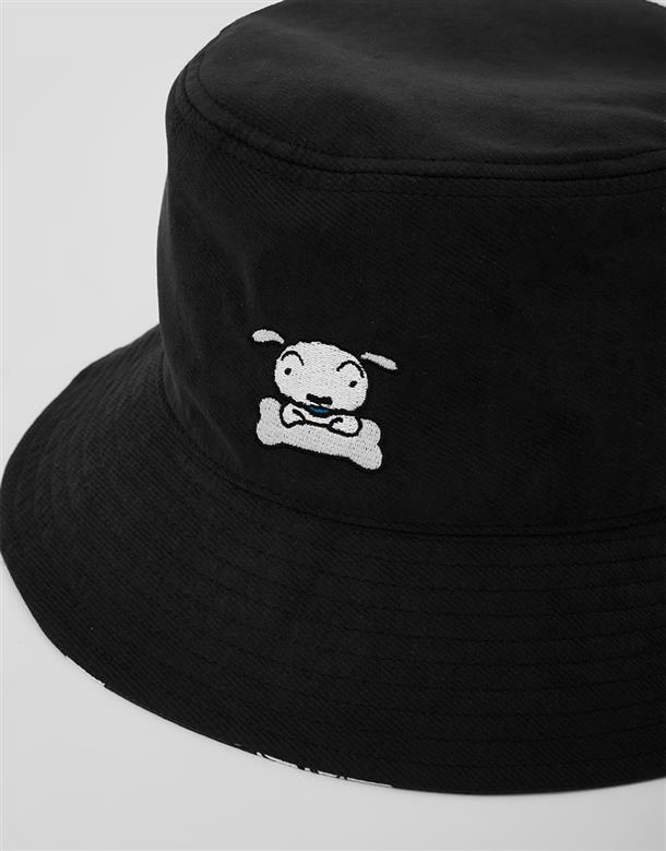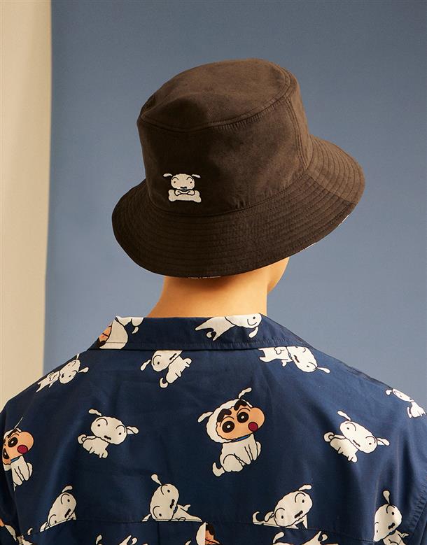 蠟筆小新雙面漁夫帽,一面為精緻電繡,另一面為滿版小新與小白印花設計 。
