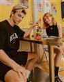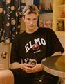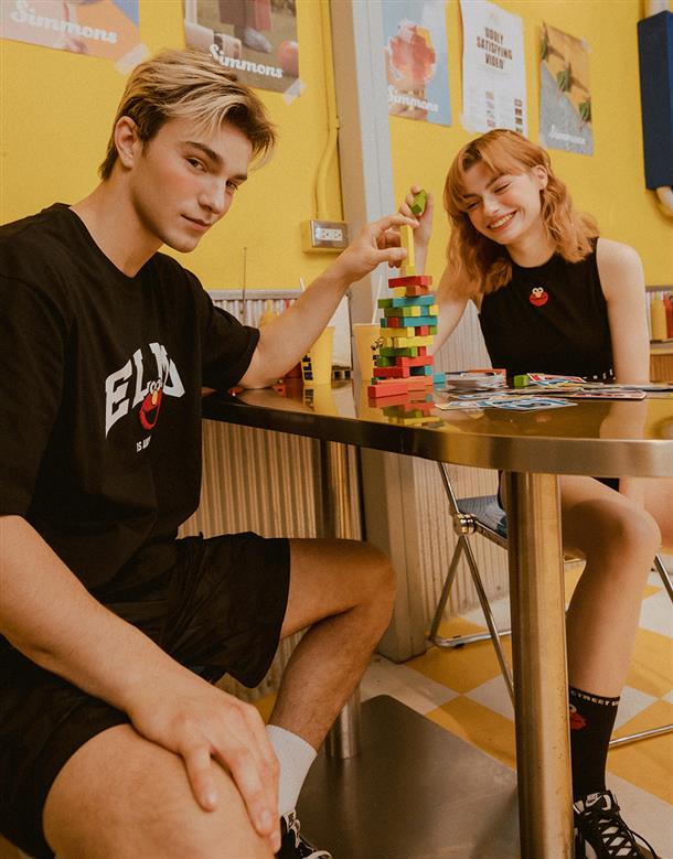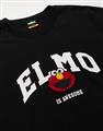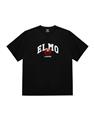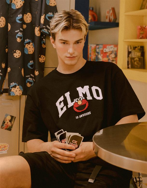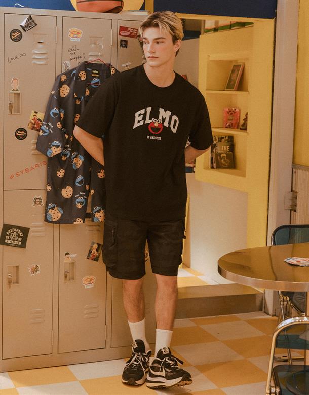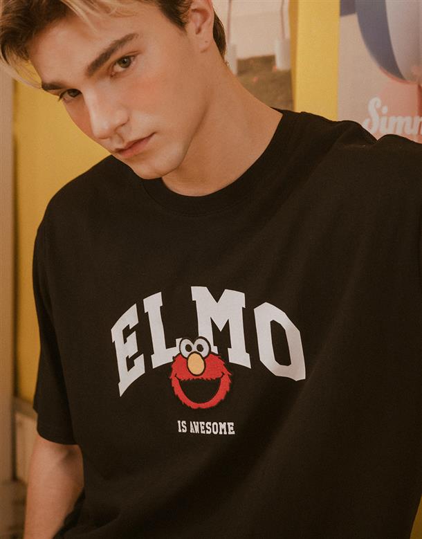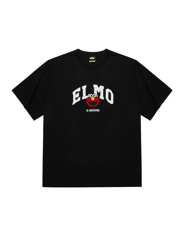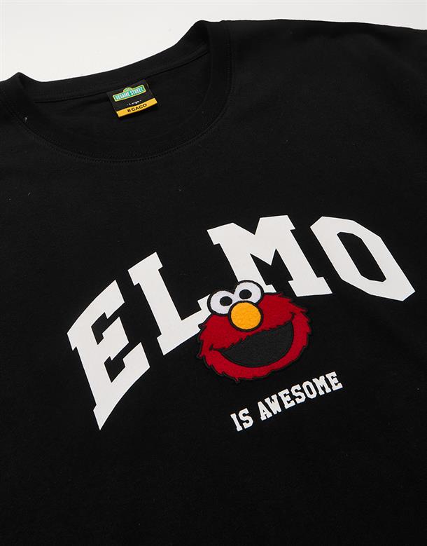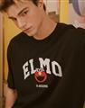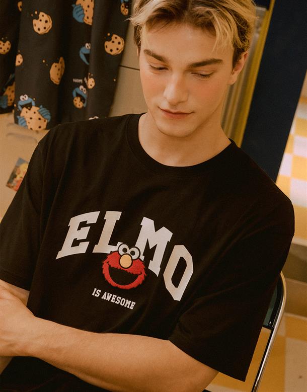 Elmo精緻貼布繡與印刷大字設計,舒適棉麻寬鬆落肩短TEE。