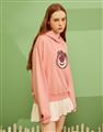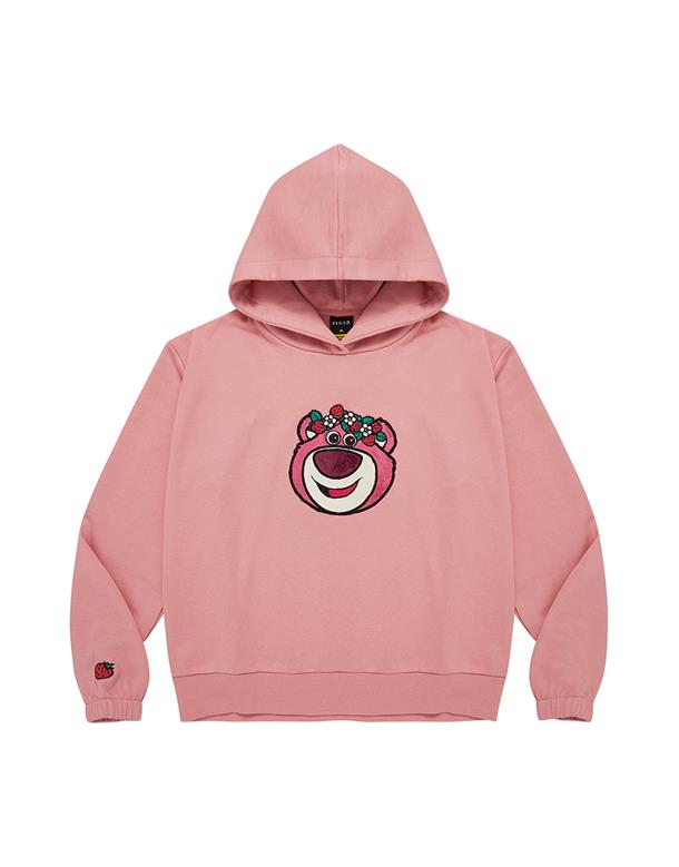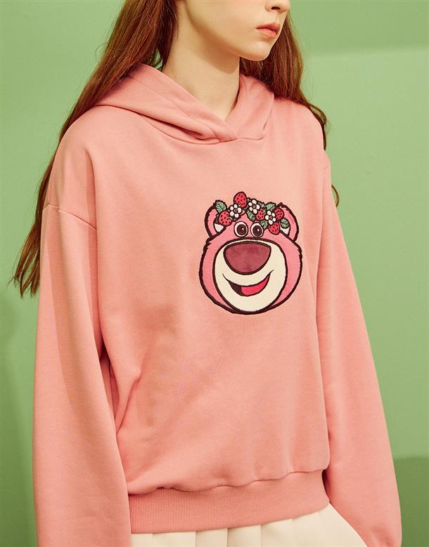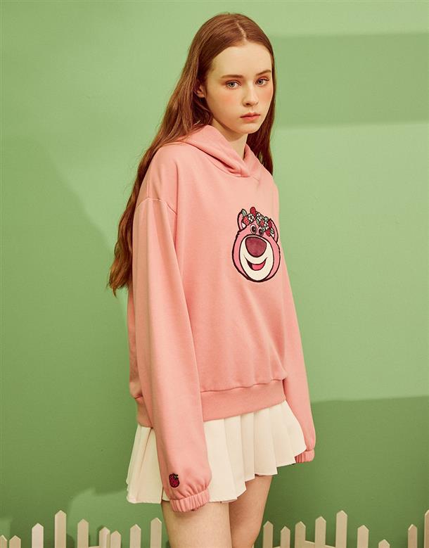 草莓熊抱哥貼布繡,袖口鬆緊帶設計,落肩連帽TEE。