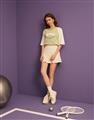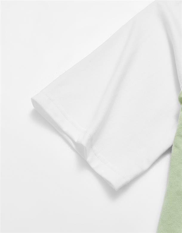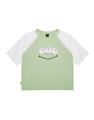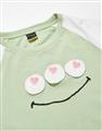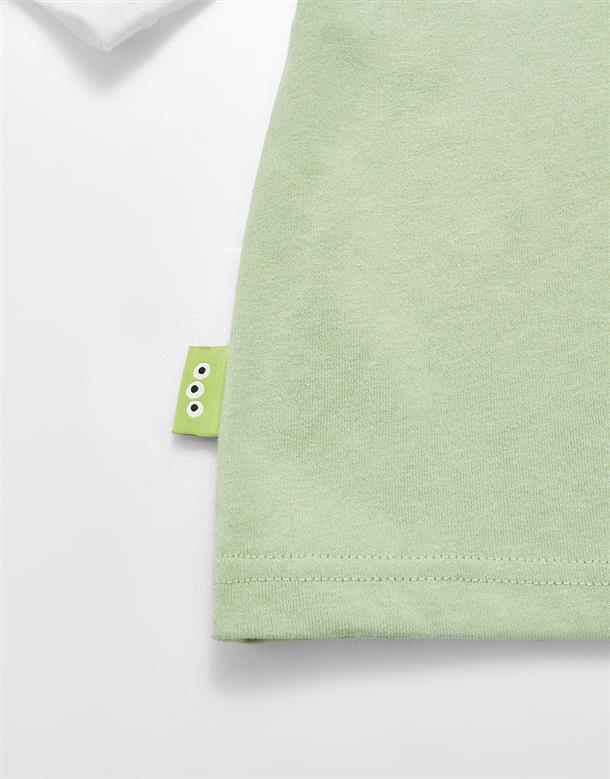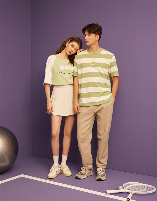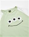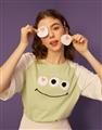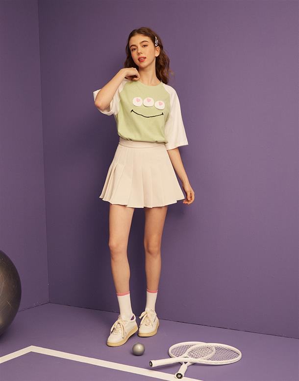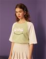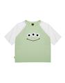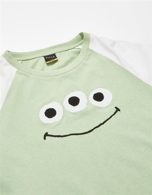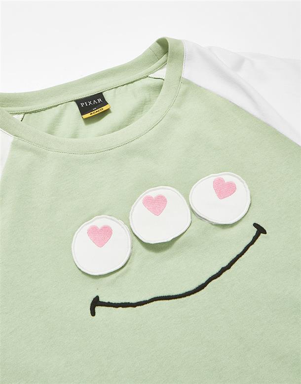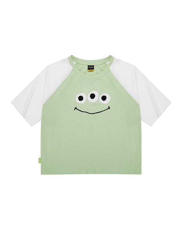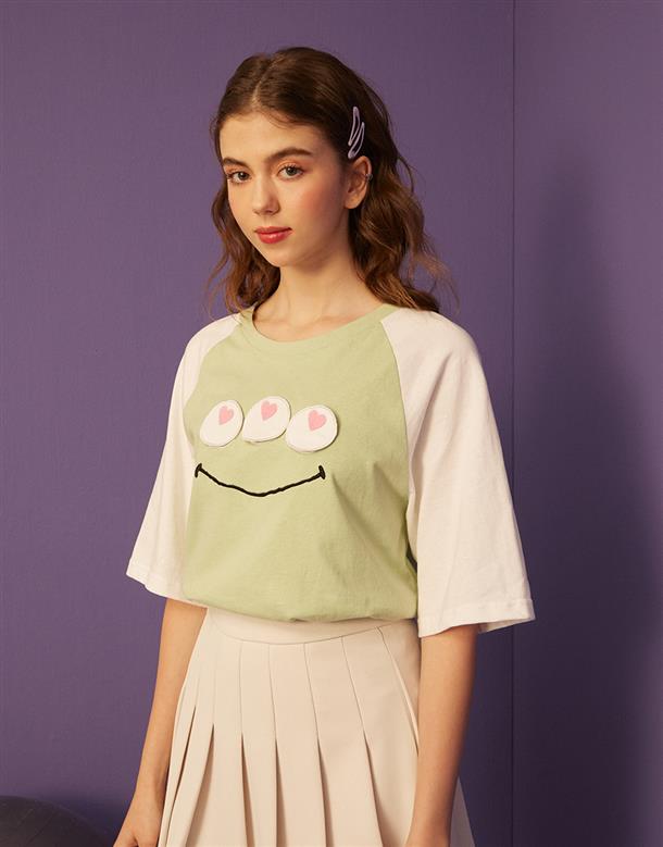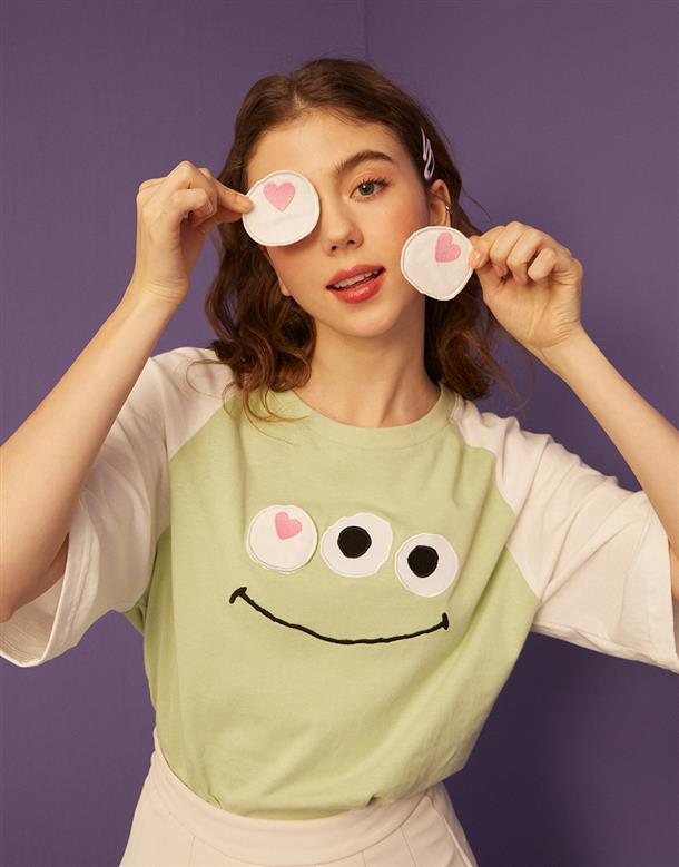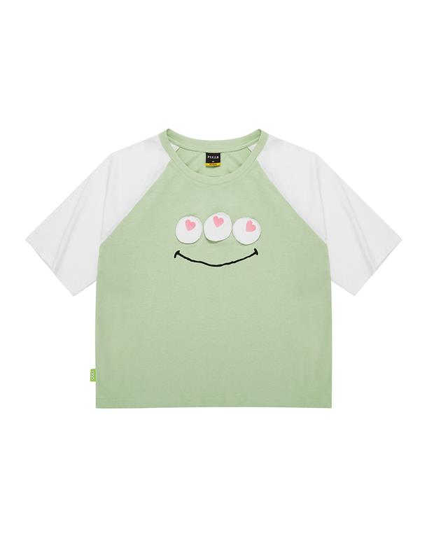 三眼怪愛心眼睛魔鬼氈,拉克蘭袖撞色設計,舒適棉麻寬鬆短TEE。
