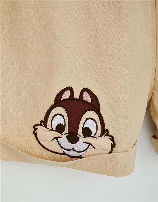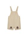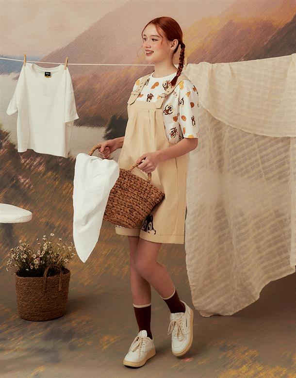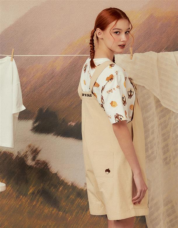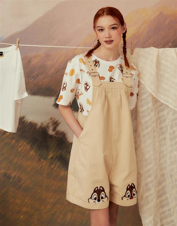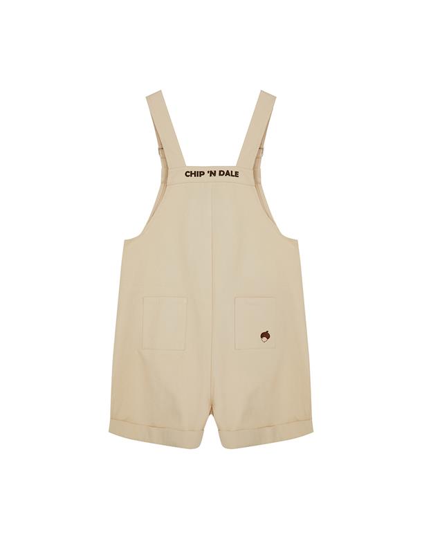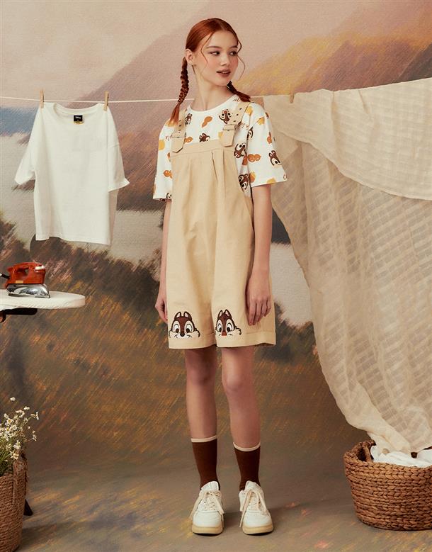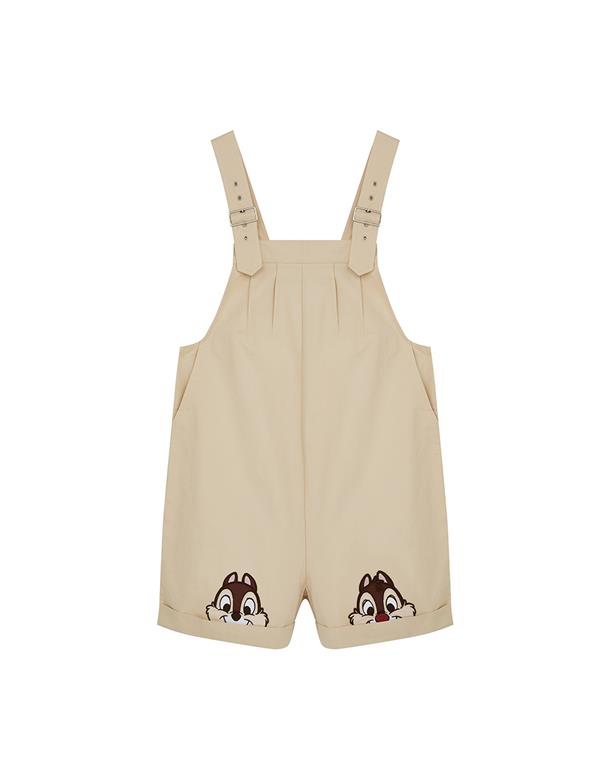 奇奇蒂蒂吊帶褲,褲口趣味貼布設計,活摺寬鬆遮肉版型,斜紋洗水率性連身款。