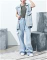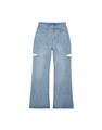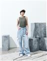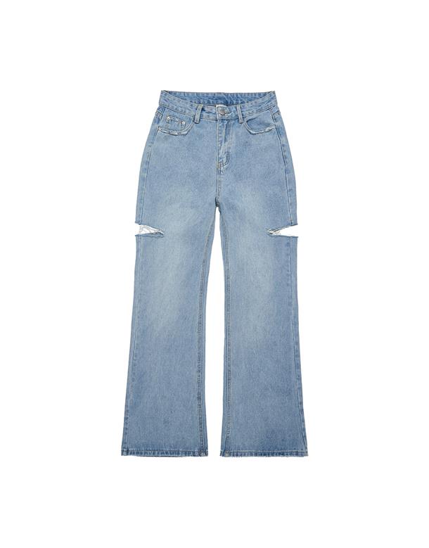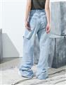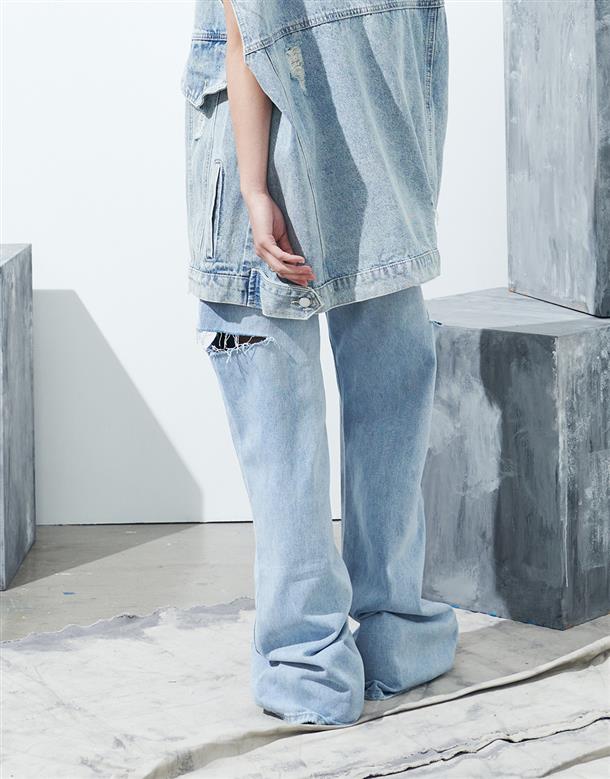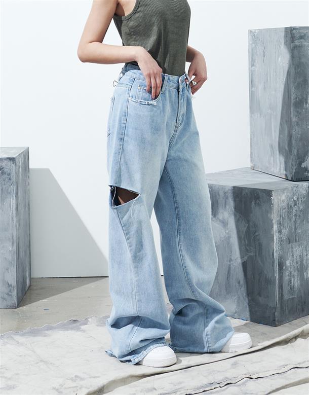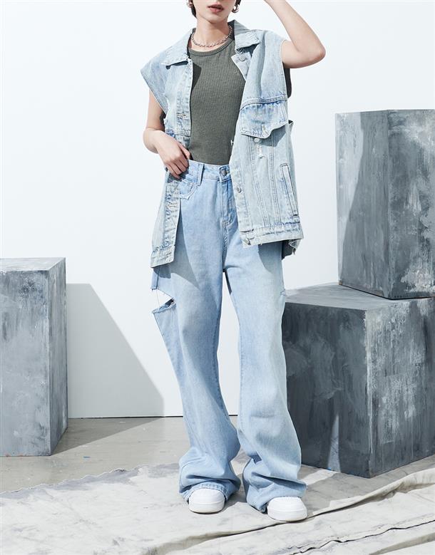 挺版水洗牛仔,版型直筒寬鬆,口袋微微破壞抽鬚,兩邊大腿側邊割破設計。