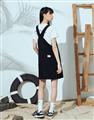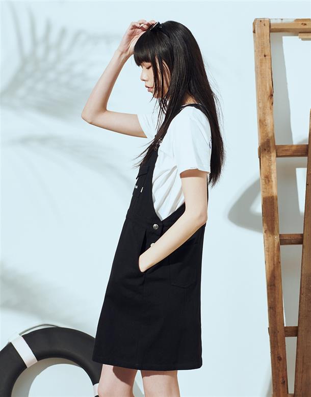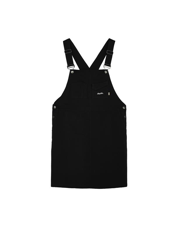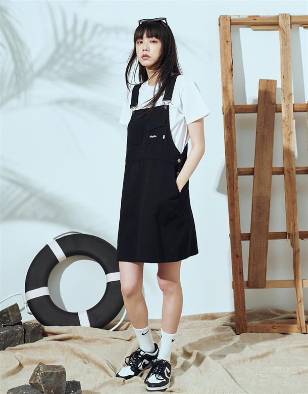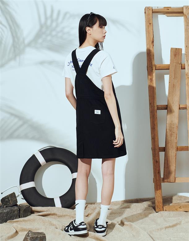 Navy City Girl著用,質感棉料,後片下襬開衩好活動,多口袋設計工裝吊帶裙。