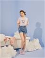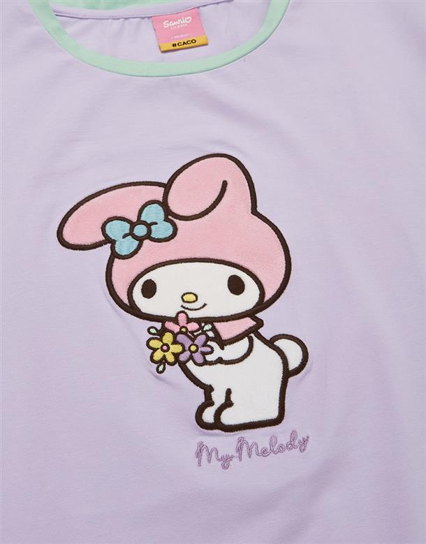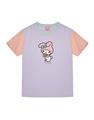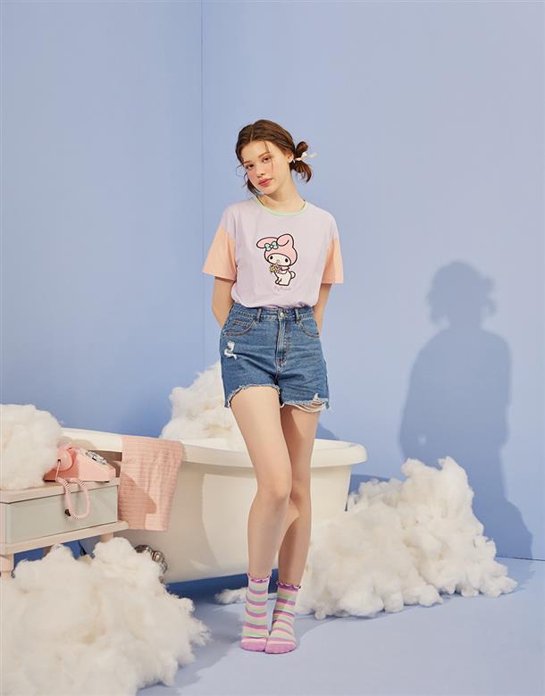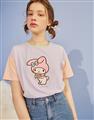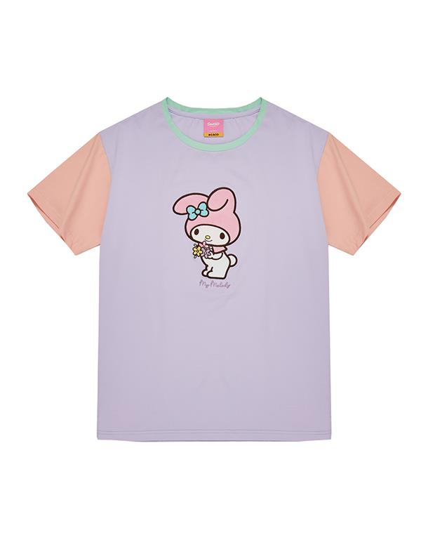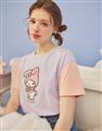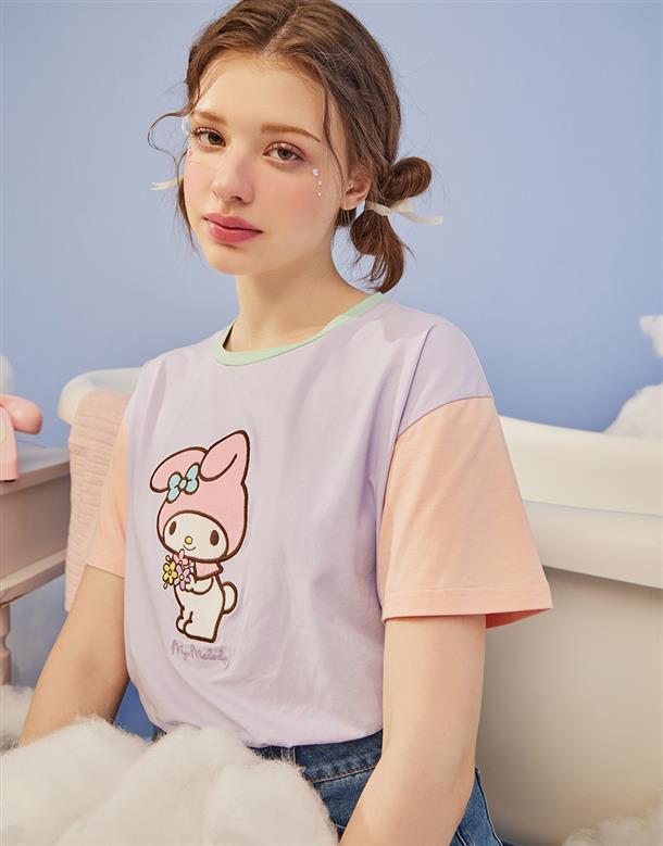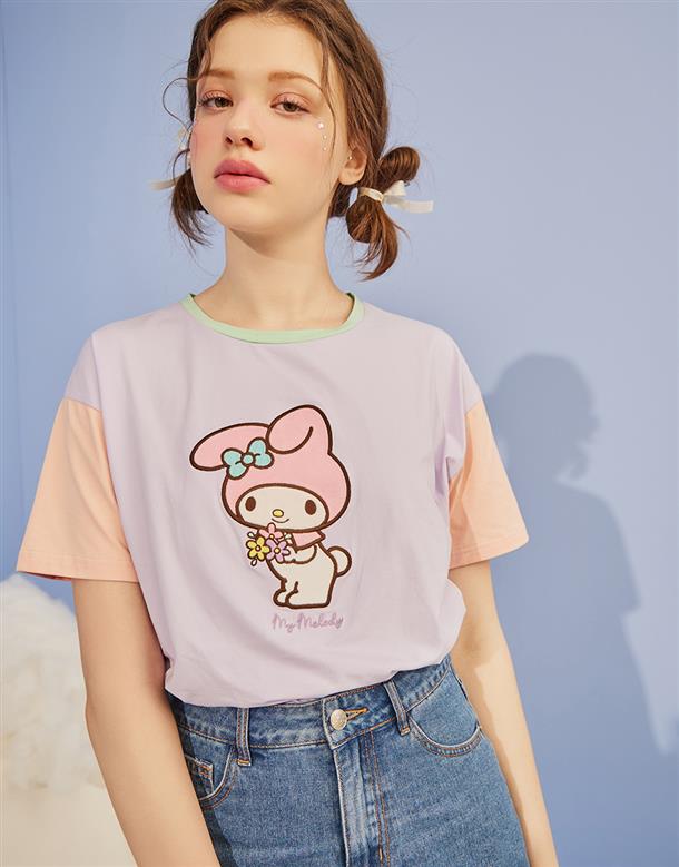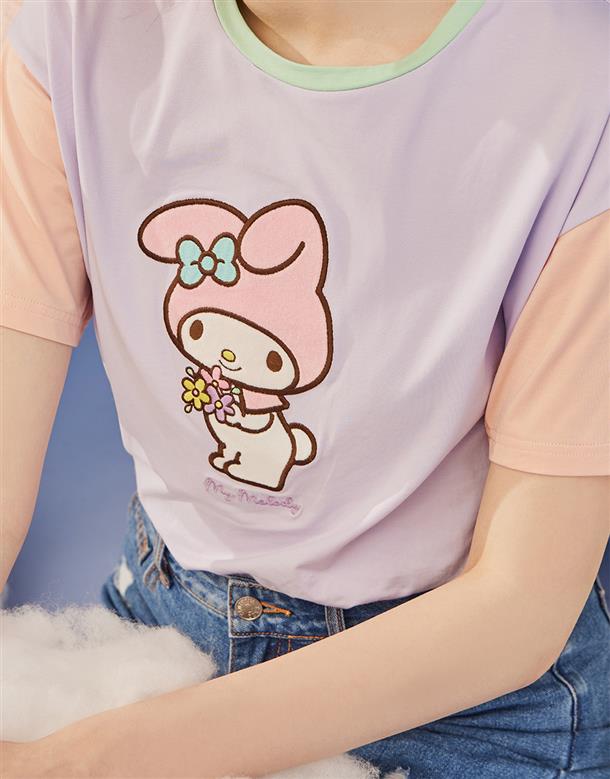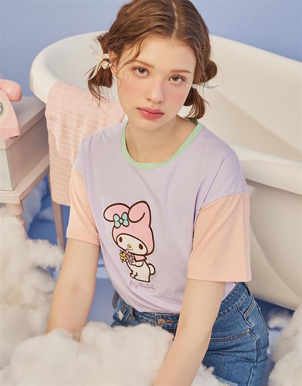 粉嫩拼色上衣,美樂蒂精緻貼布工藝。