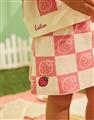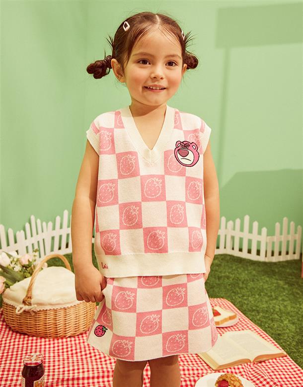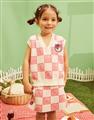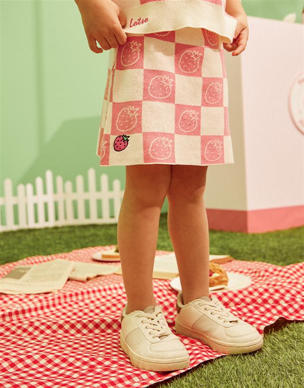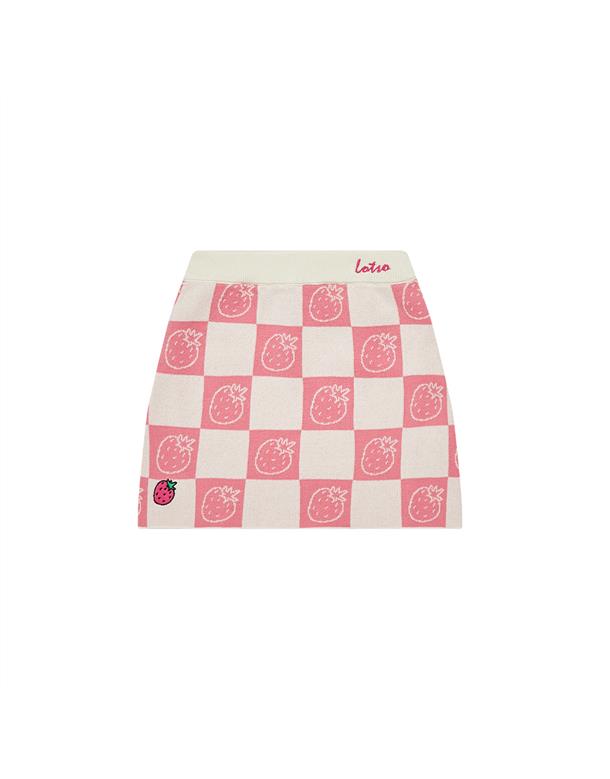 草莓棋盤格,滿版針織上衣,腰頭鬆緊帶設計,針織短裙。
