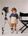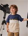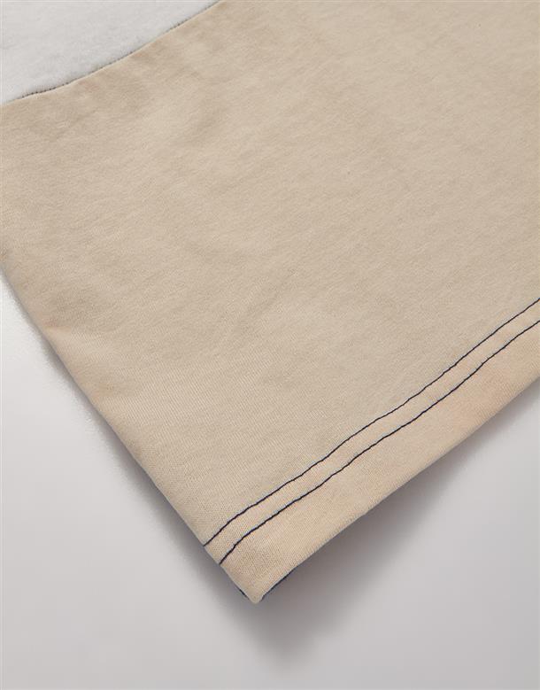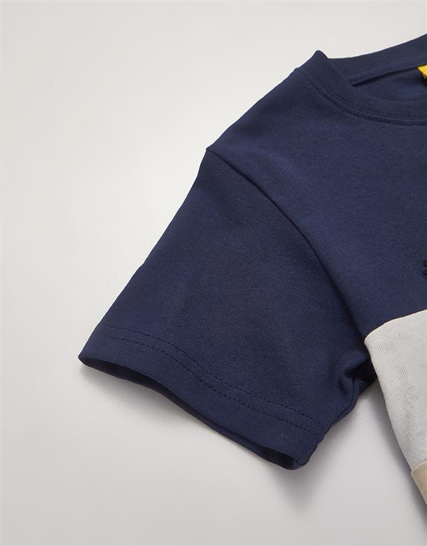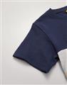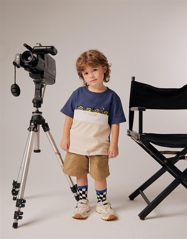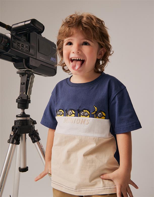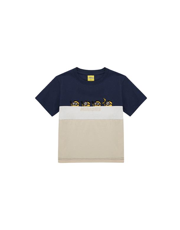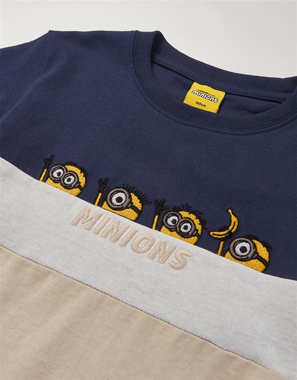 精緻小小兵電繡設計,三色拼接設計,舒適棉麻面料落肩短TEE。