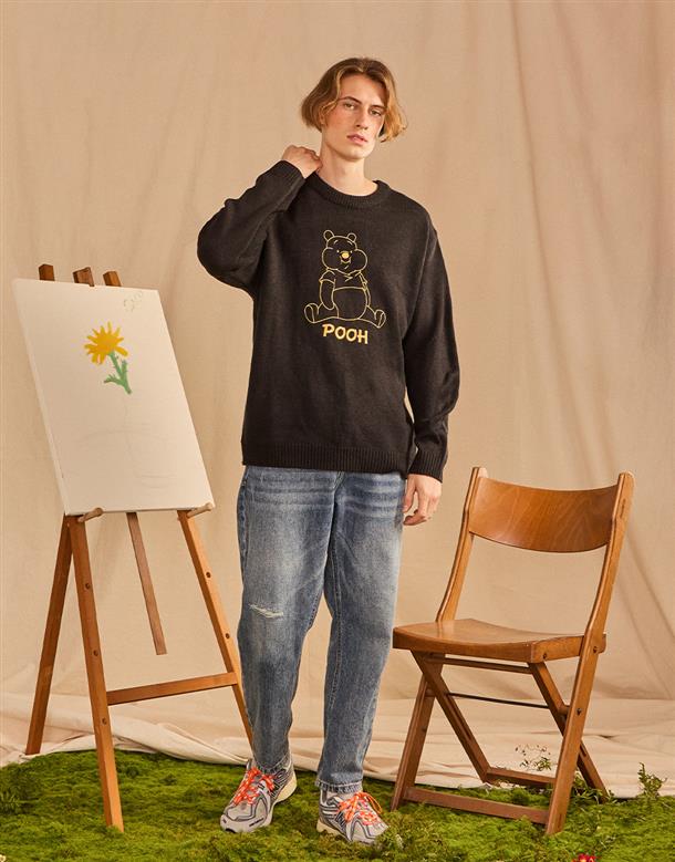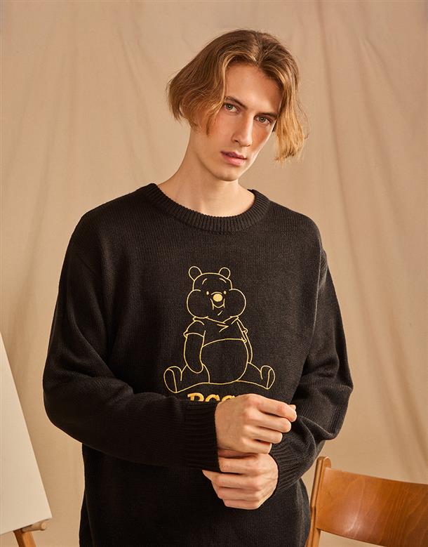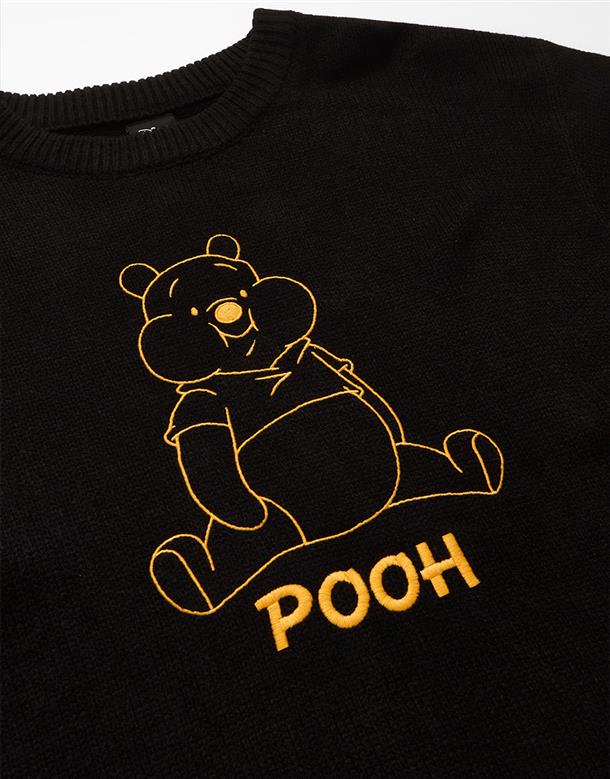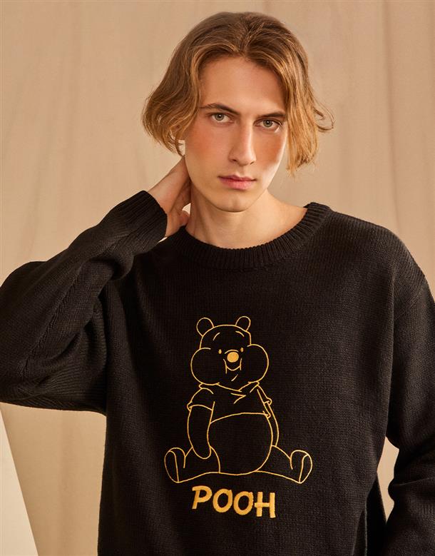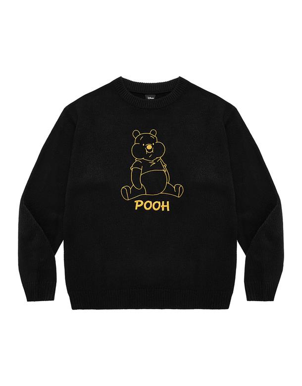 小熊維尼趣味表情提花,訂織不起球毛織,穿搭落肩款。