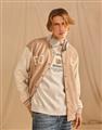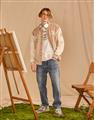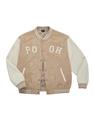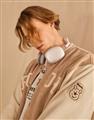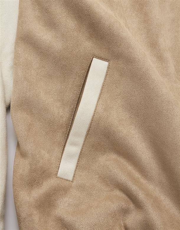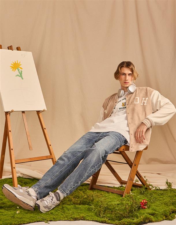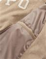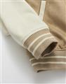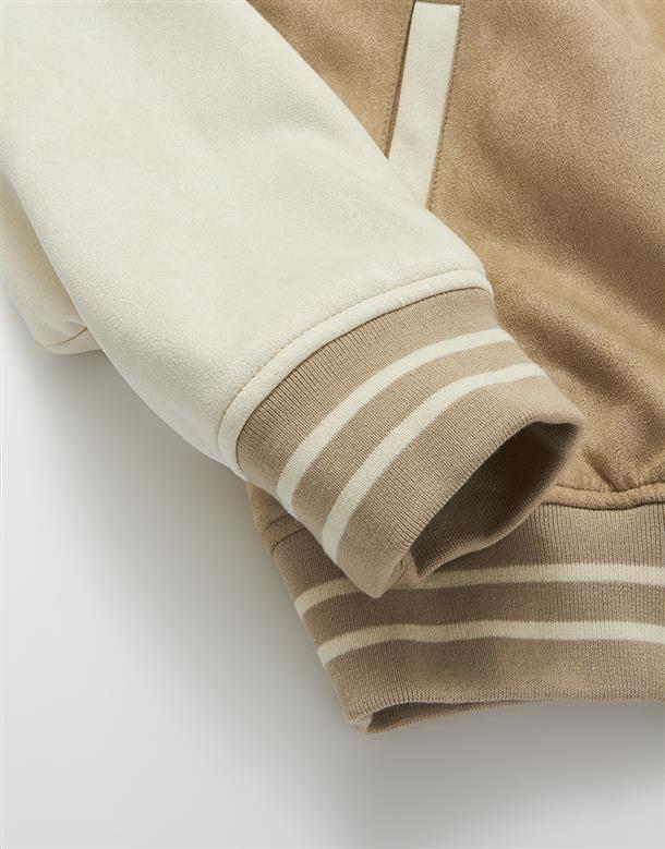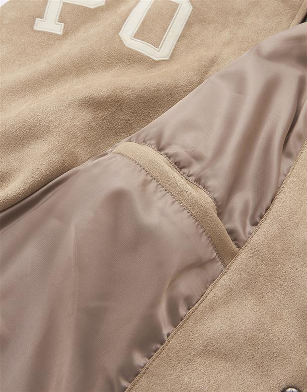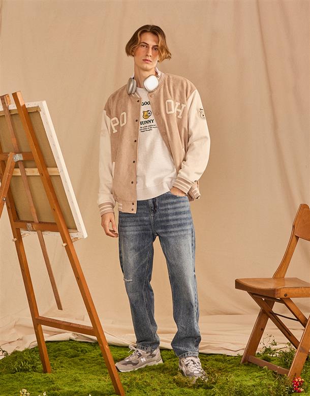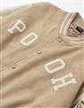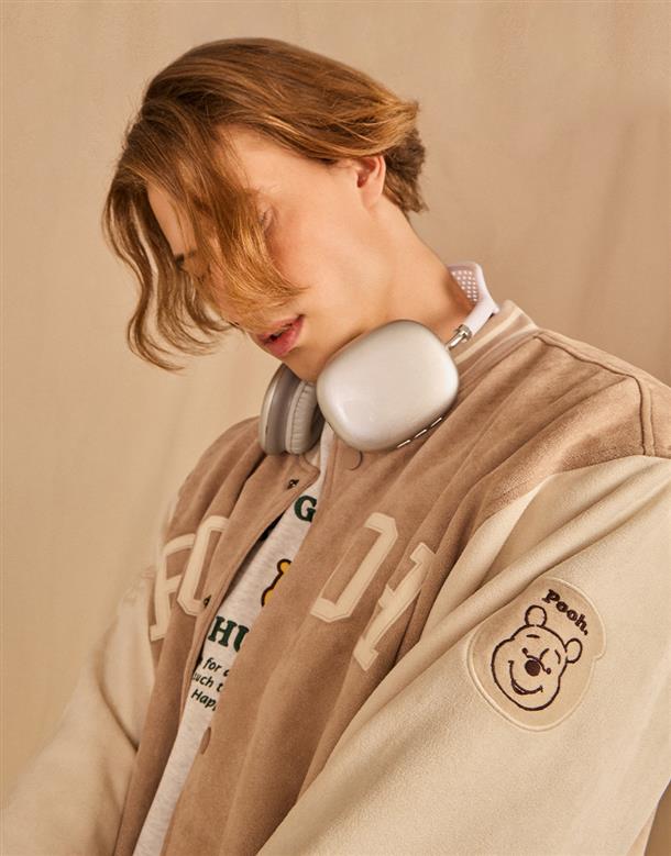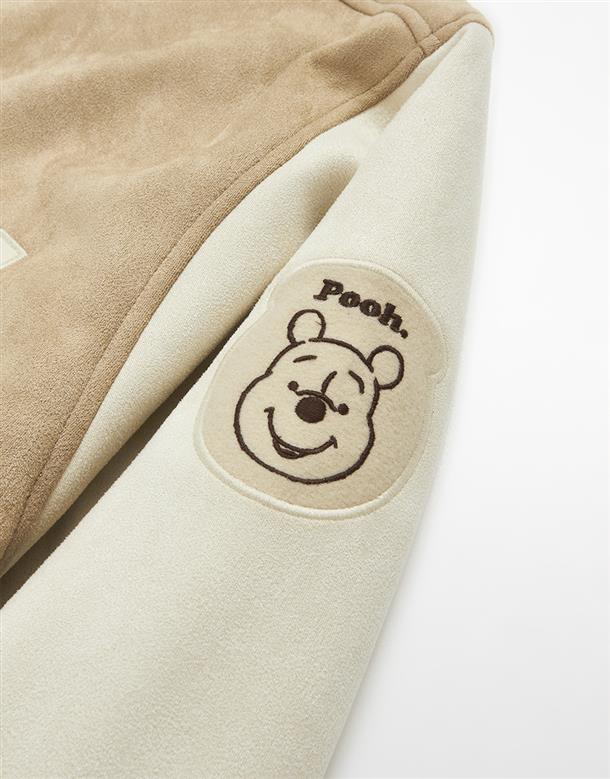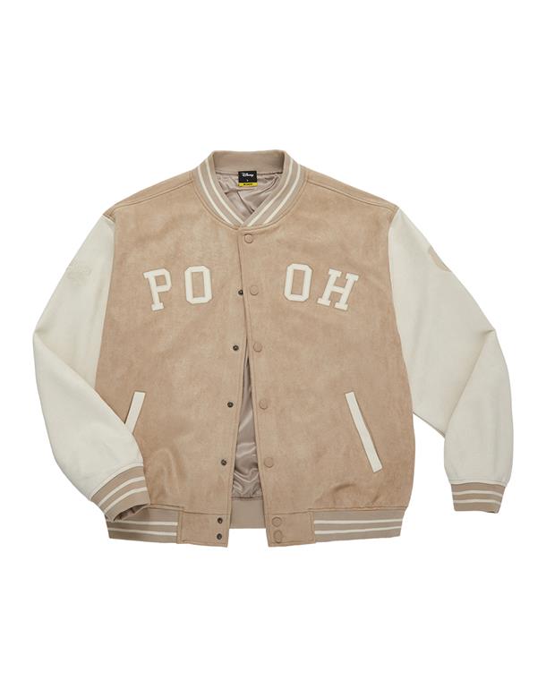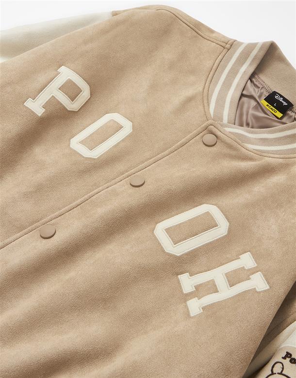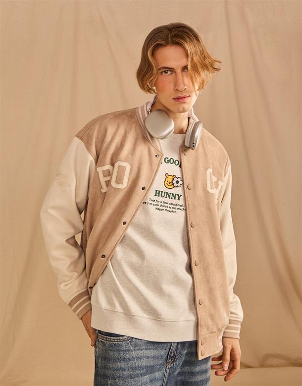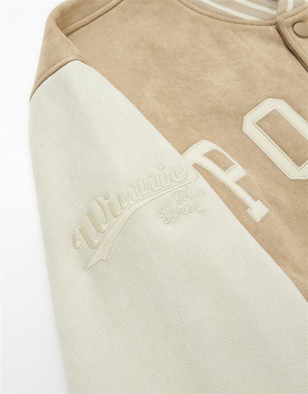 小熊維尼拼色棒球外套,貼布與電繡設計,微落肩寬鬆版型,率性麂皮穿搭款。