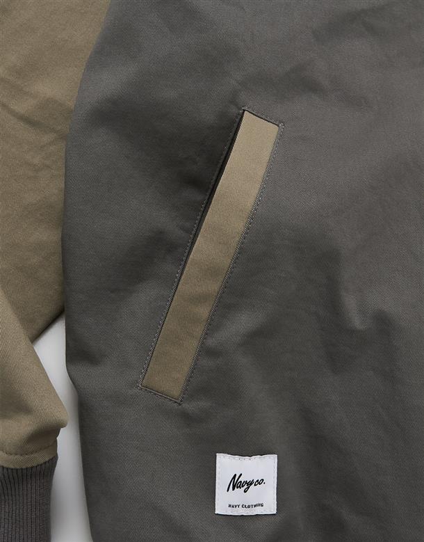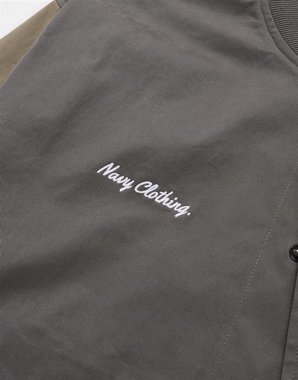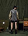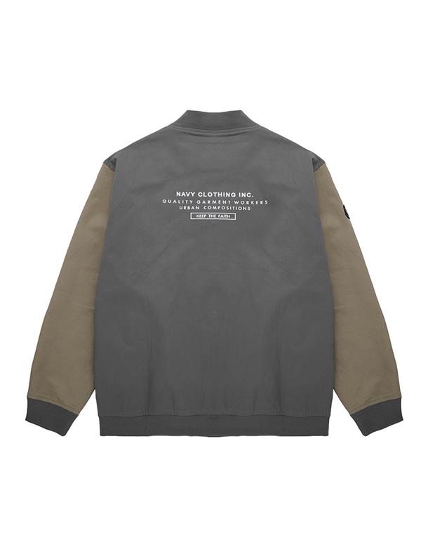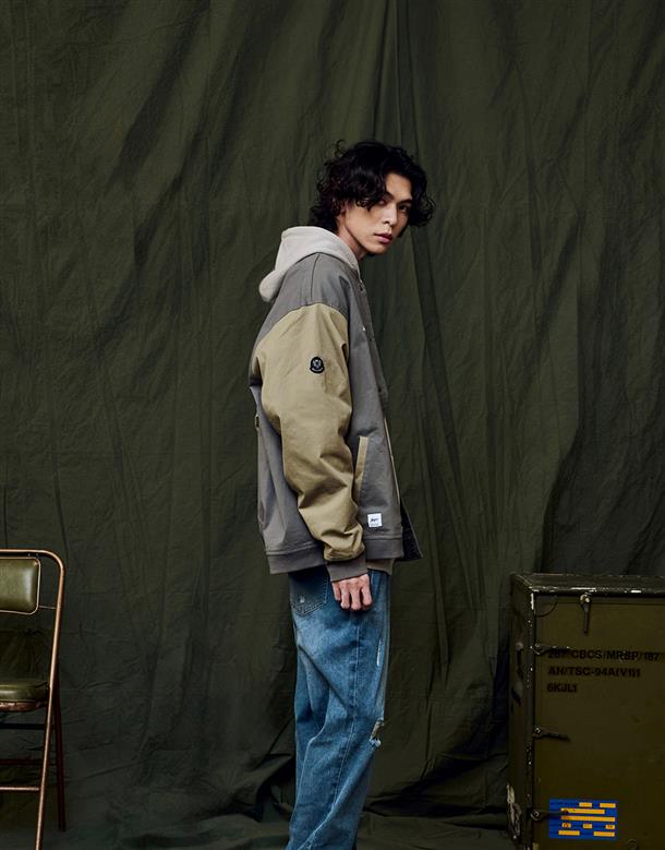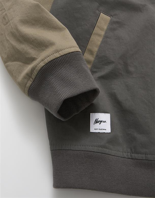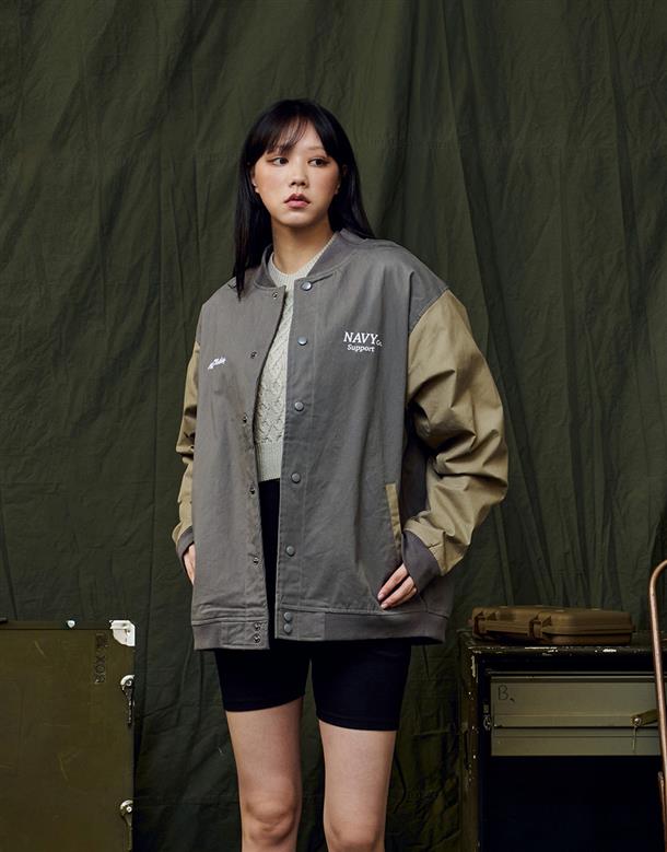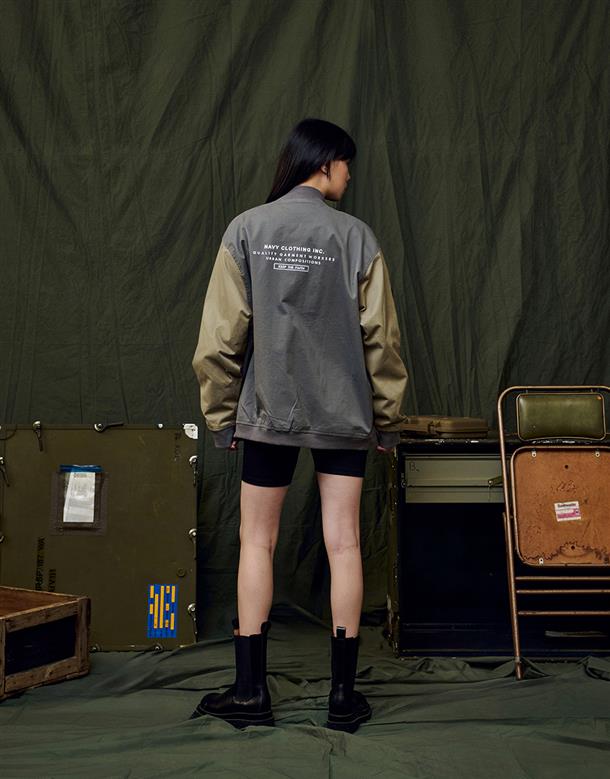 彈性斜紋款胸口電繡圖樣袖撞色落肩棒球外套。