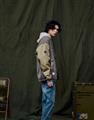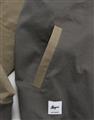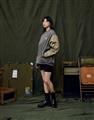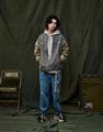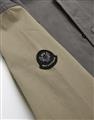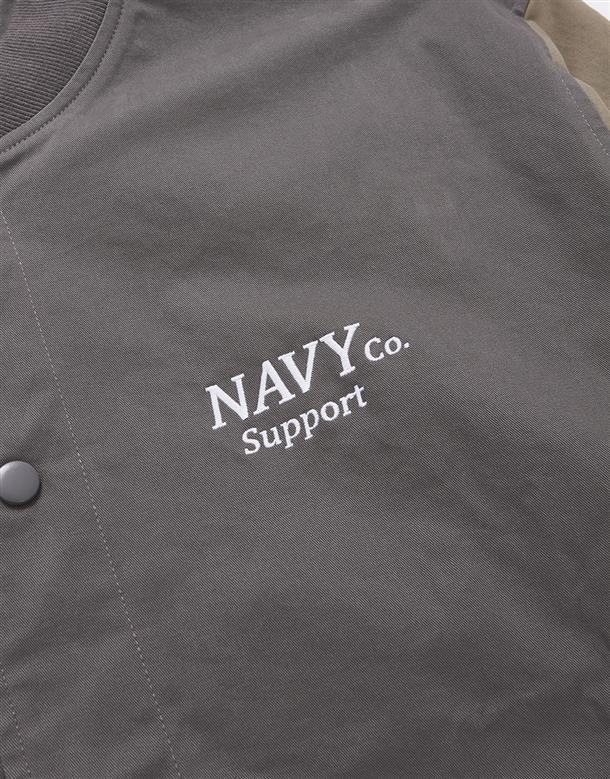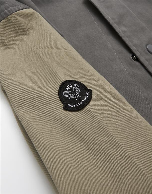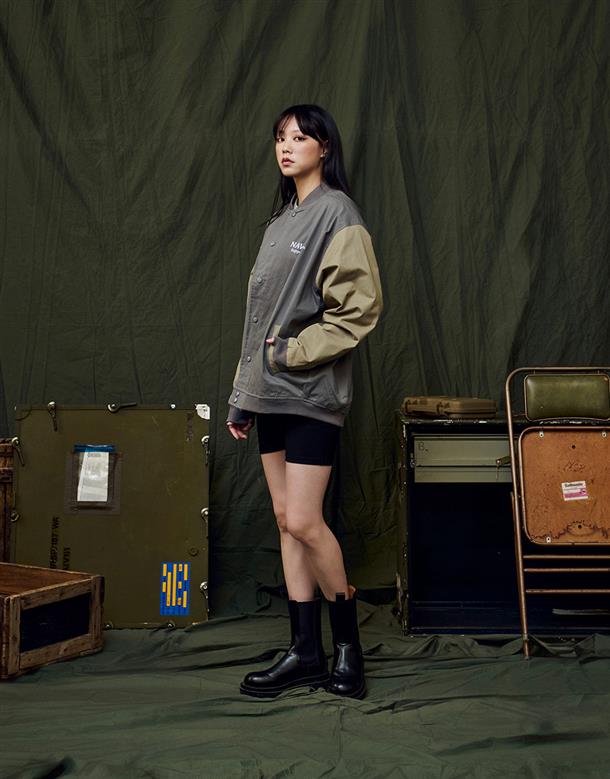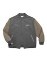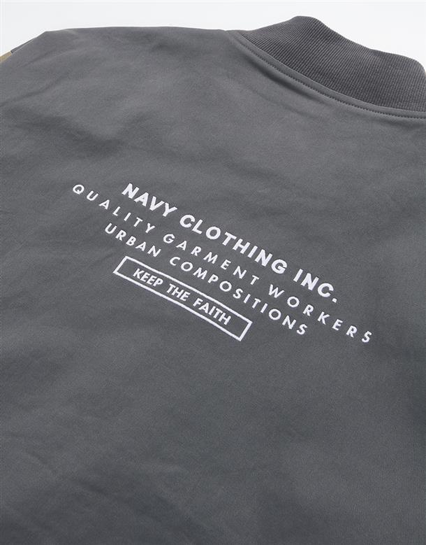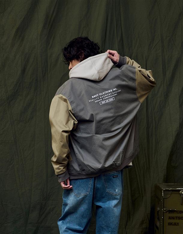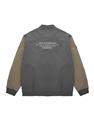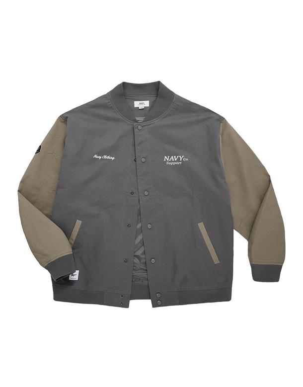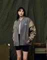 彈性斜紋款胸口電繡圖樣袖撞色落肩棒球外套。