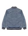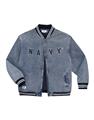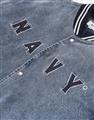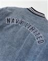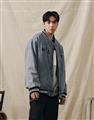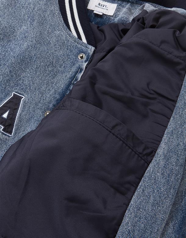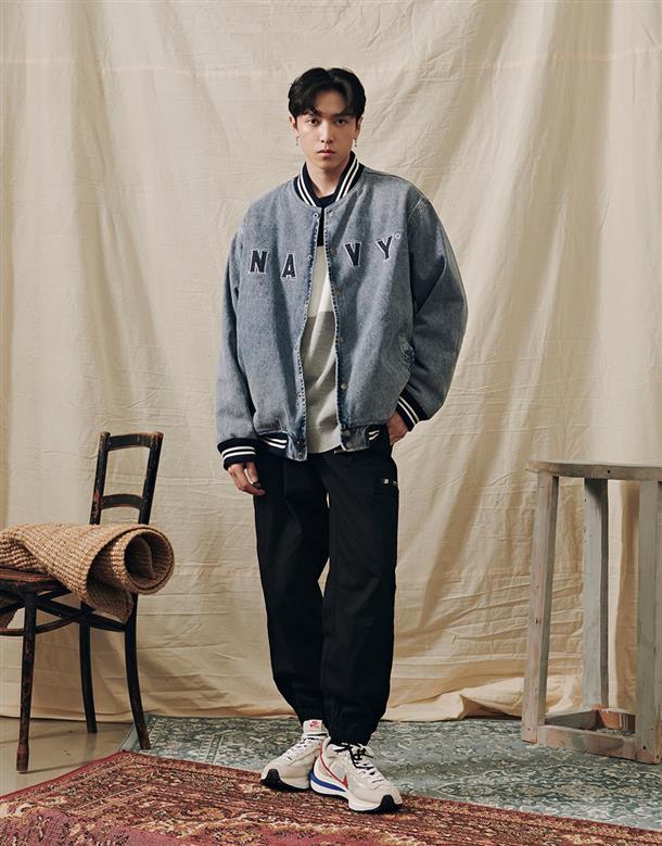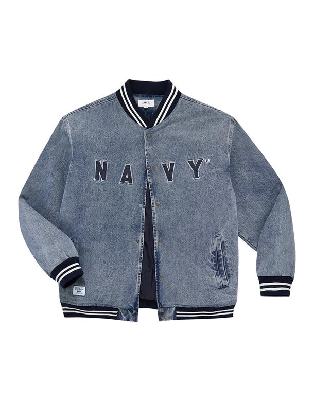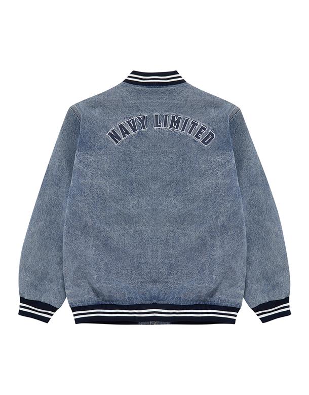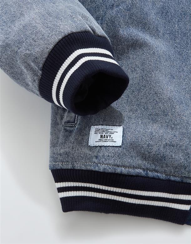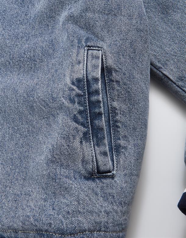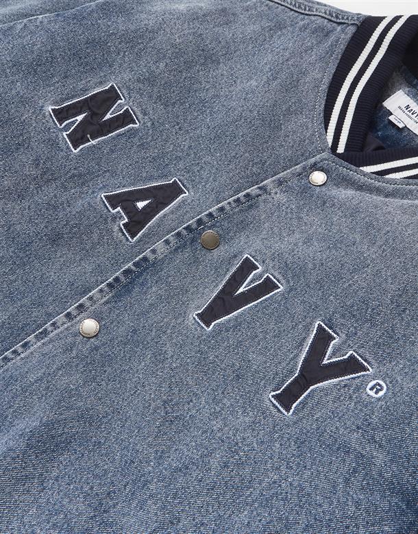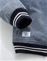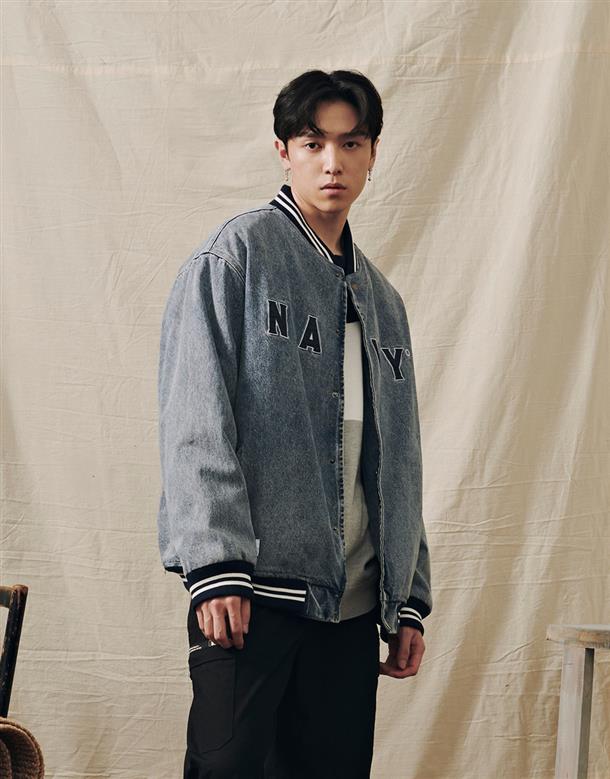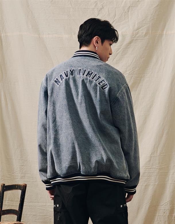 秋冬必備經典百搭洗水牛仔貼布繡落肩棒球外套。