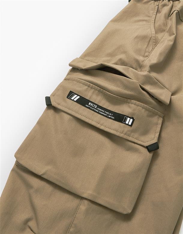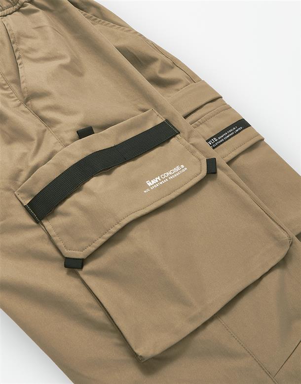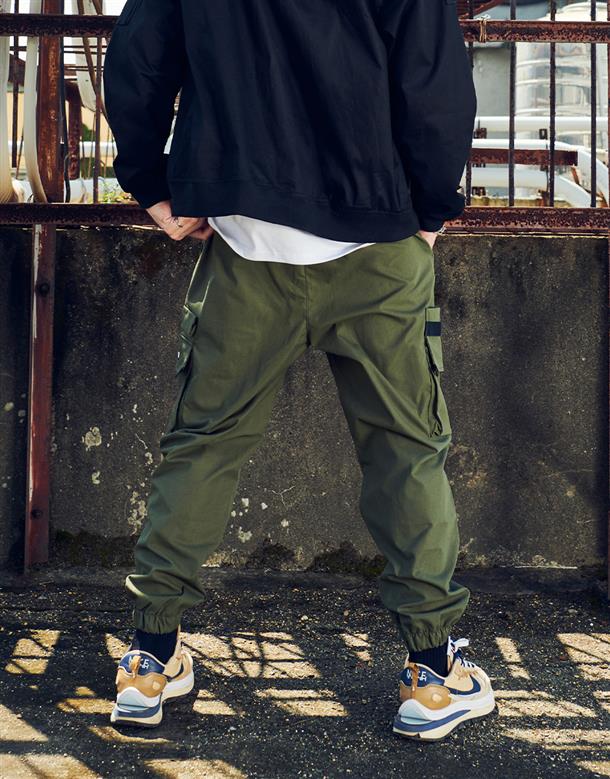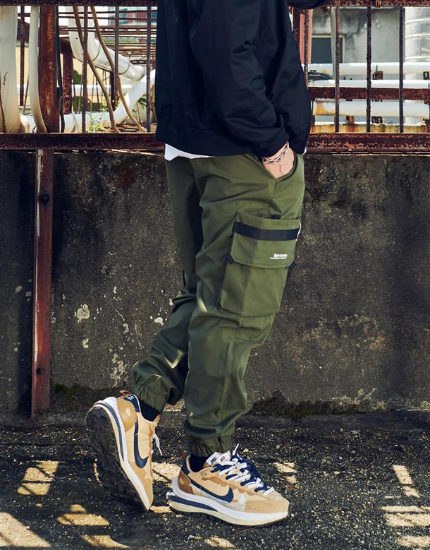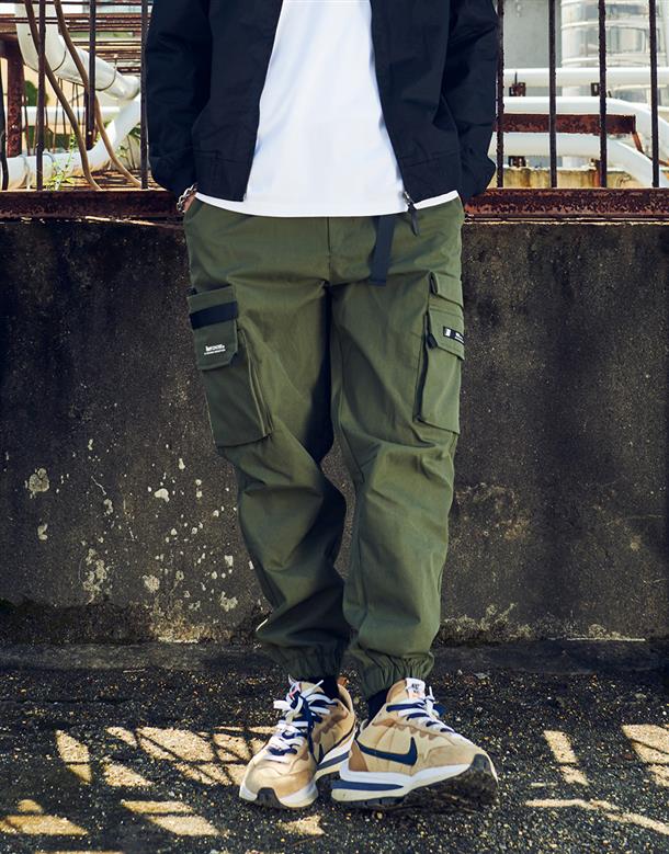機能工裝口袋造型穿搭款品牌文字印刷束腳褲。