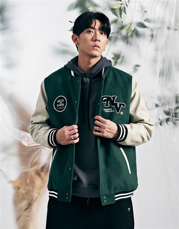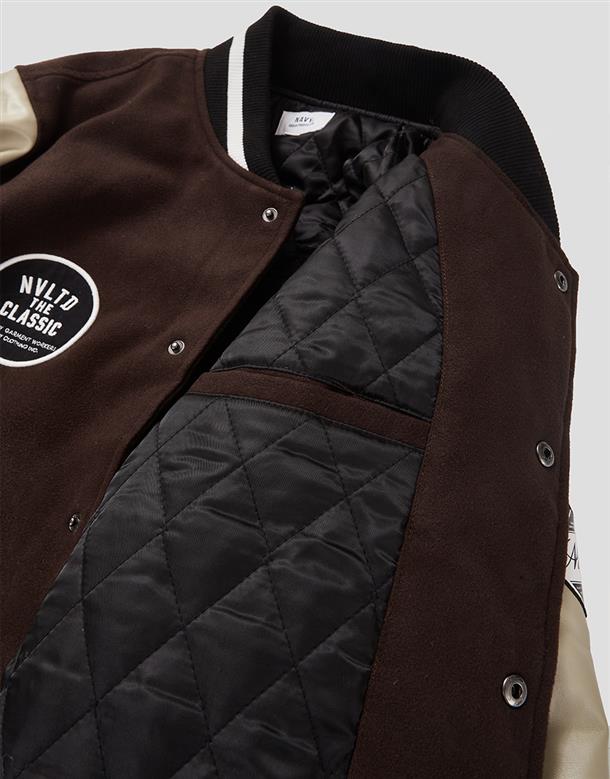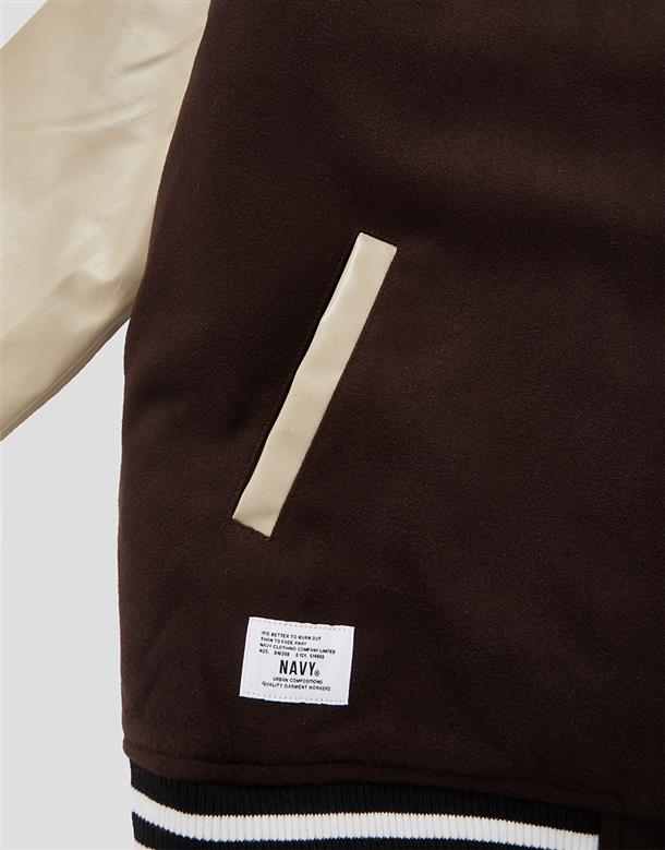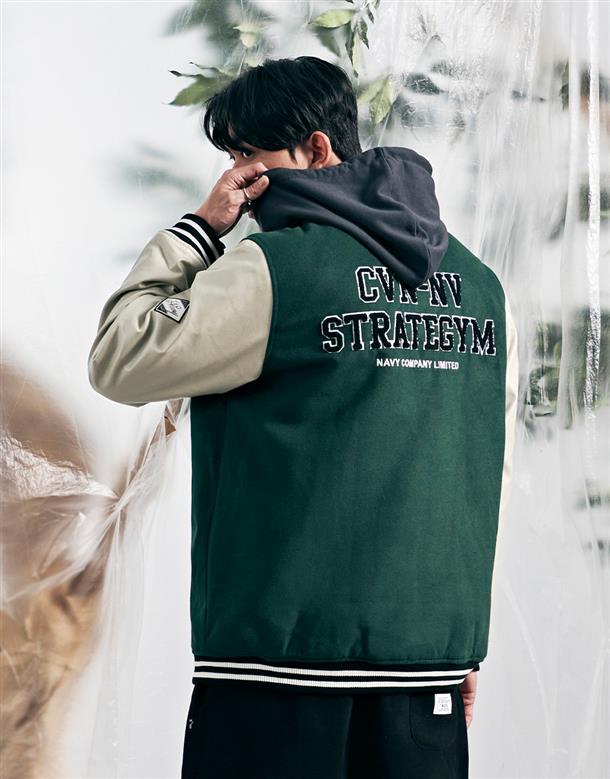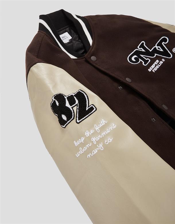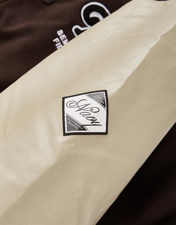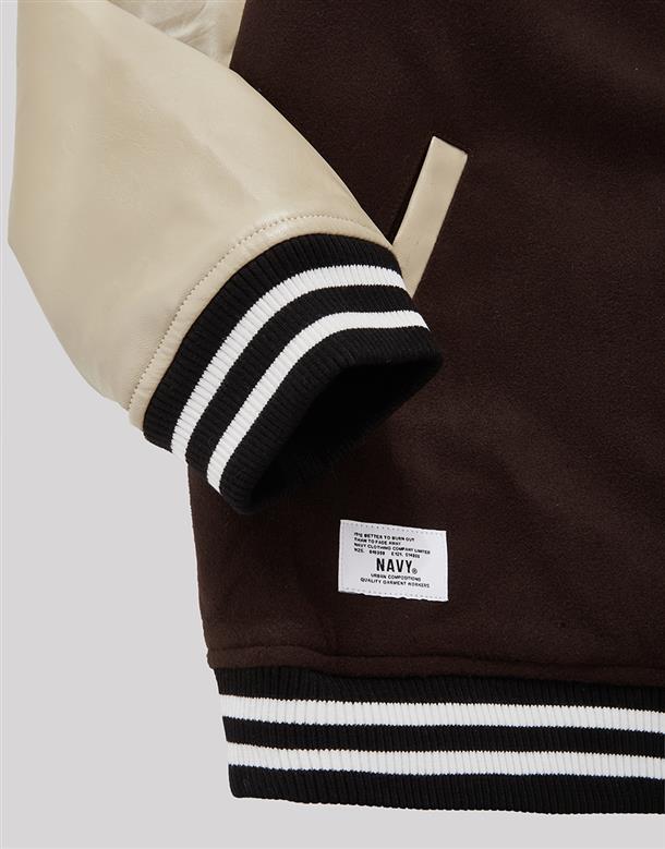街頭造型穿搭必備皮革袖保暖鋪棉棒球外套。