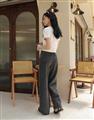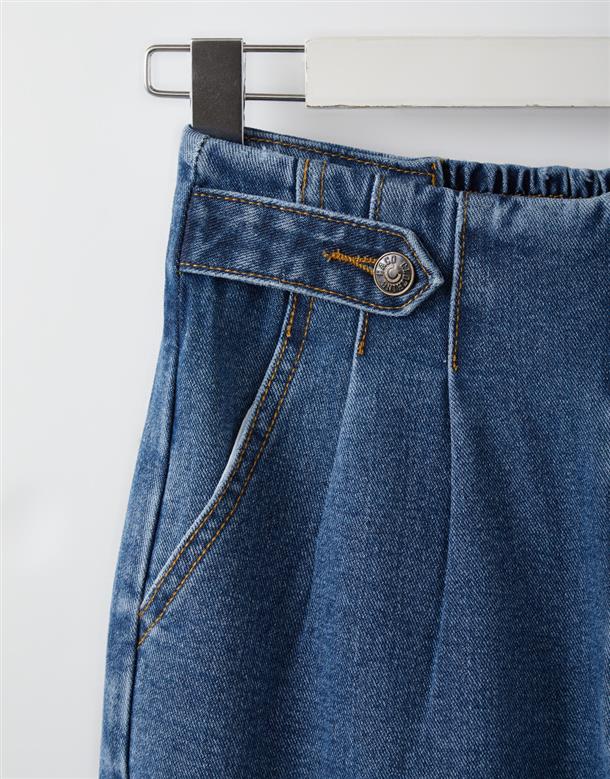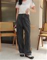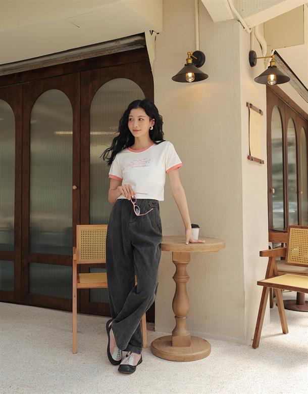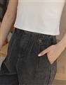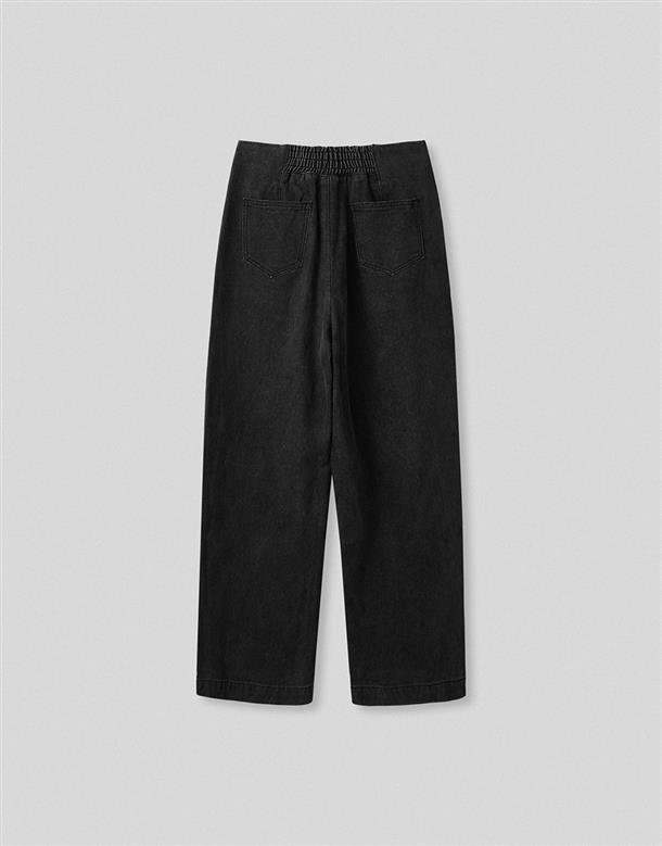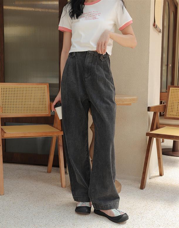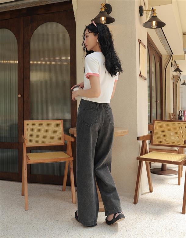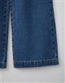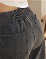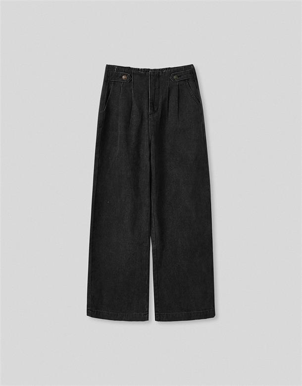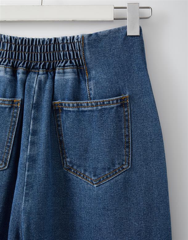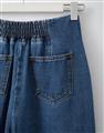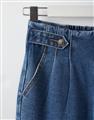 復古牛仔設計款,挺版無彈牛仔面料,腰節開拉鍊,後腰有彈性鬆緊設計,腰頭裝飾釦帶,版型直筒寬鬆。