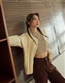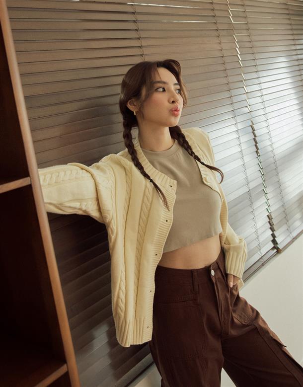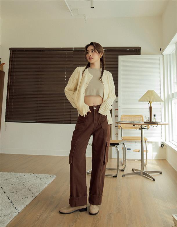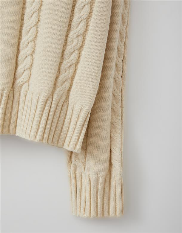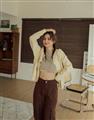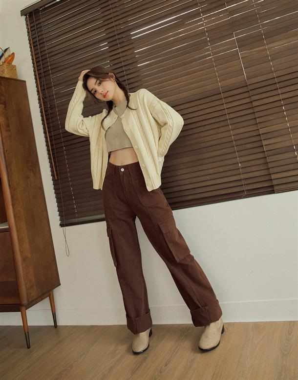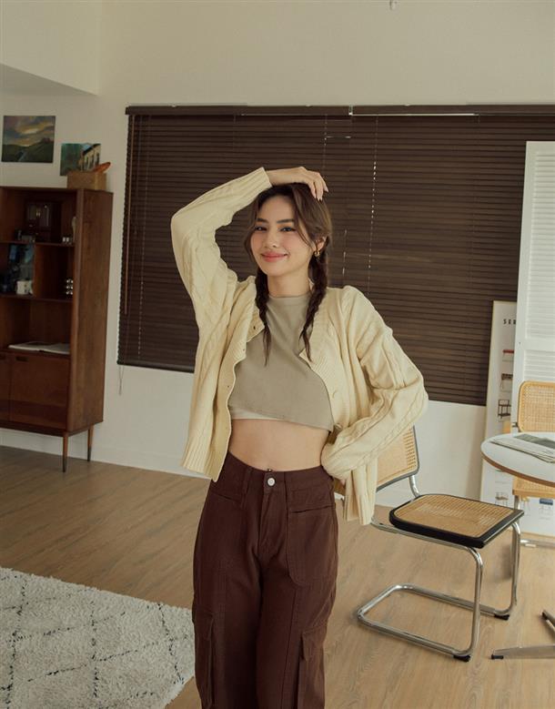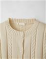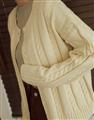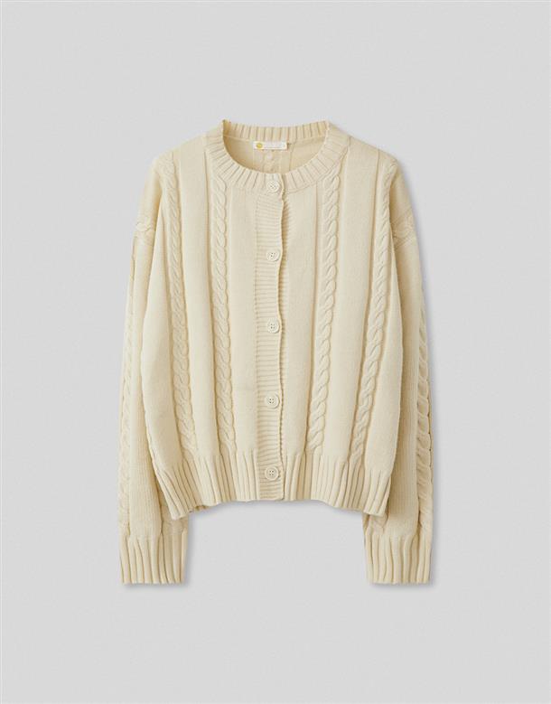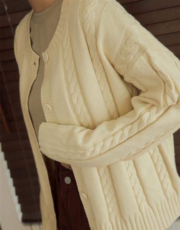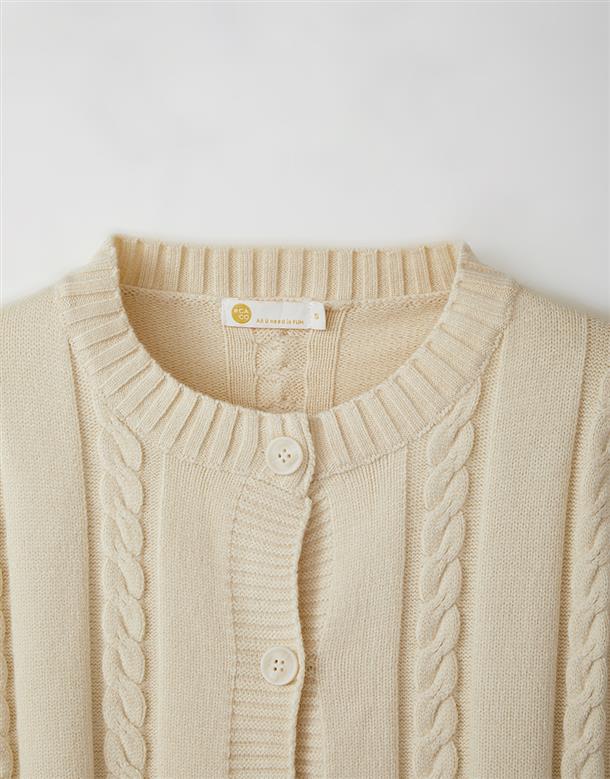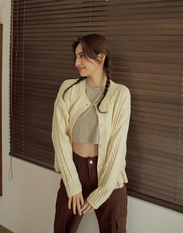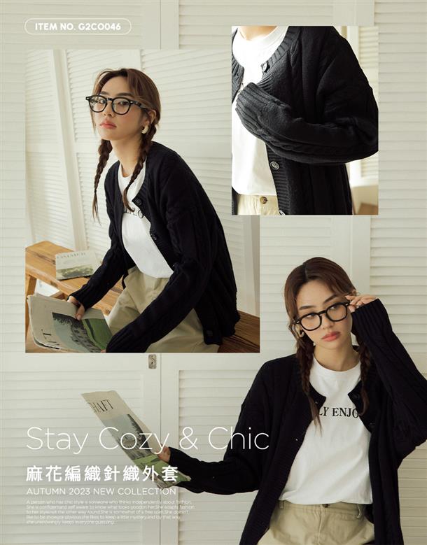 高質感柔軟包芯紗面料,有麻花編織紋路設計,領口袖口下擺皆有羅紋拼接,門襟配色琥珀釦。