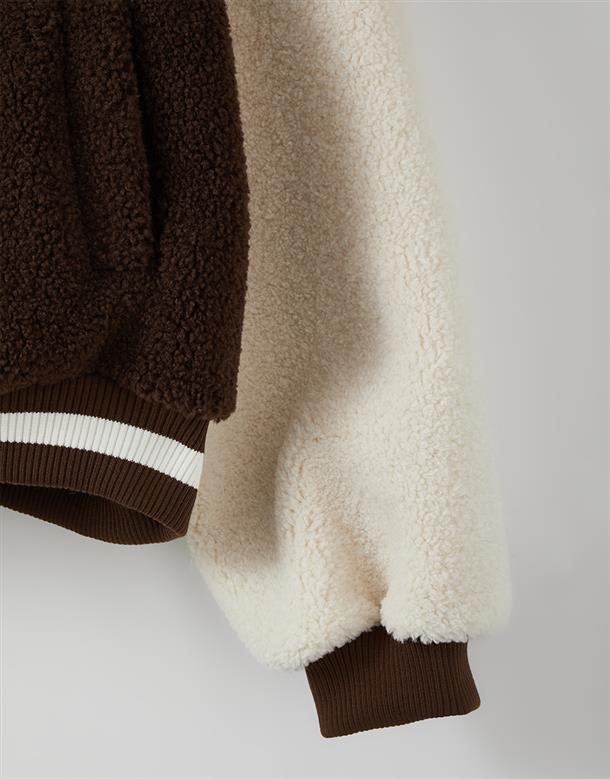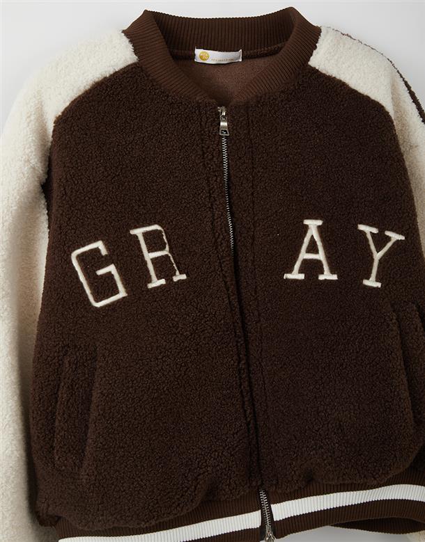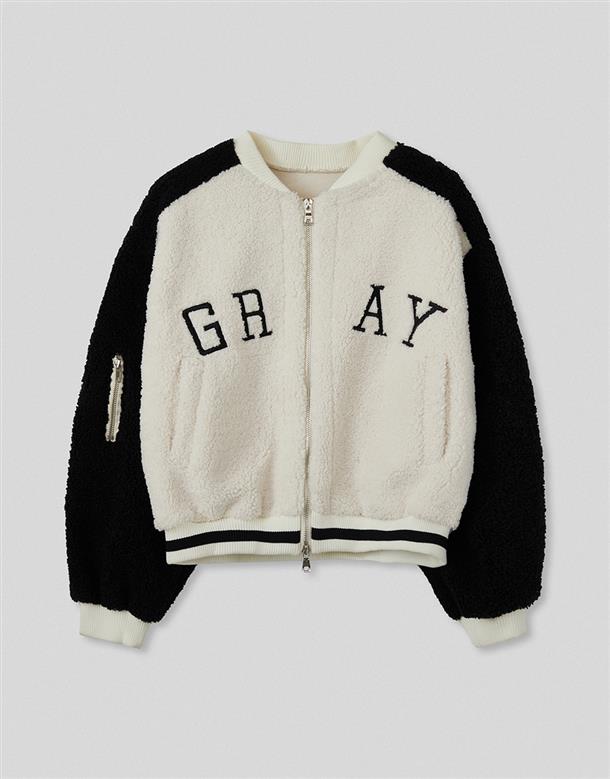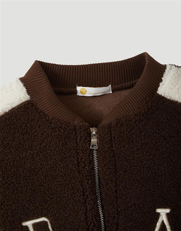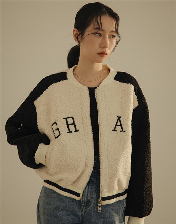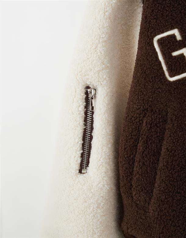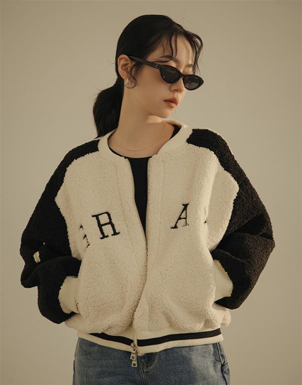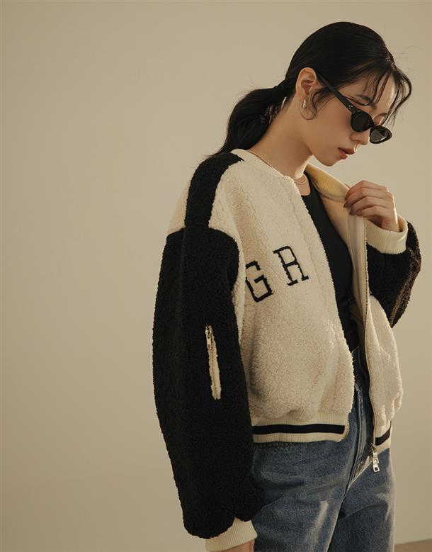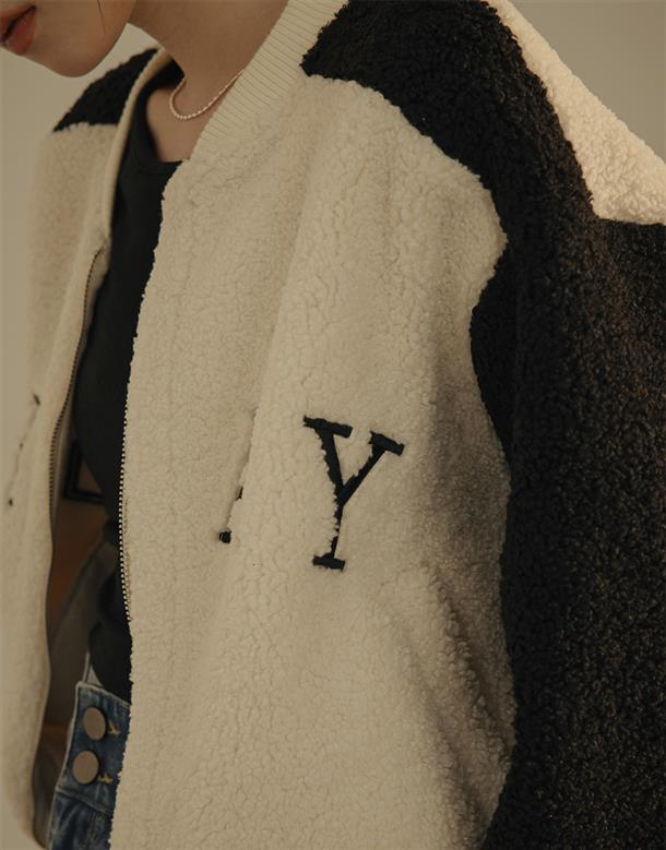 厚實保暖羊羔毛面料,內層為麂皮,搶眼有型撞色拼接,版型寬鬆,有實用斜插口袋,袖上裝飾拉鍊,門襟雙頭拉鍊設計,胸前印花刺繡。