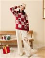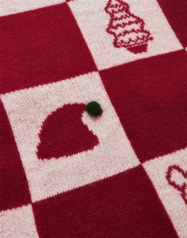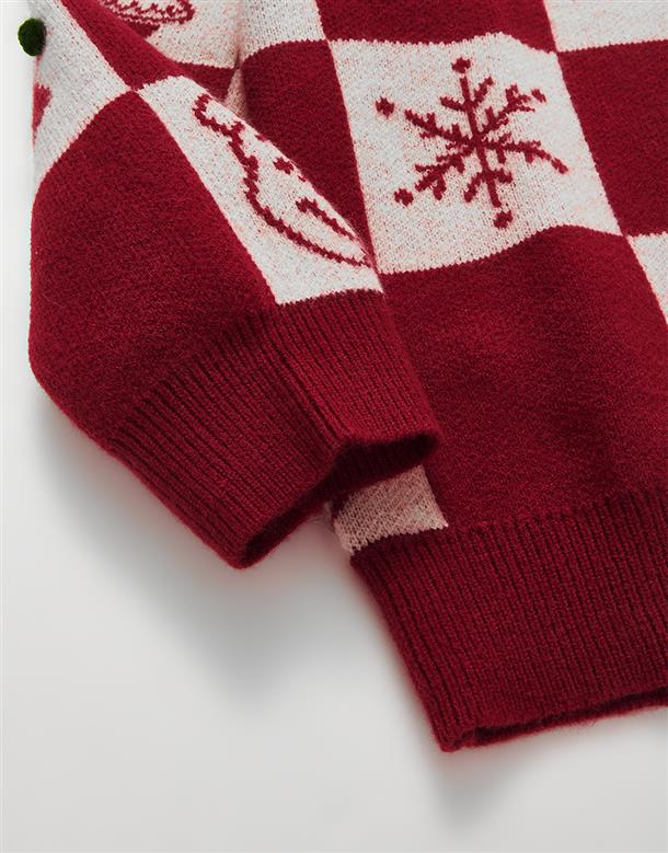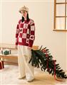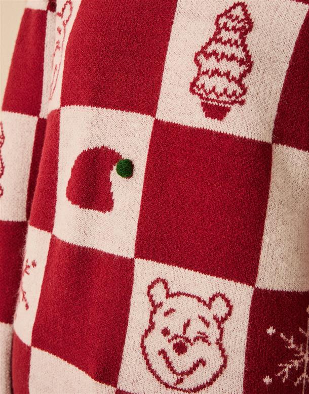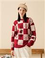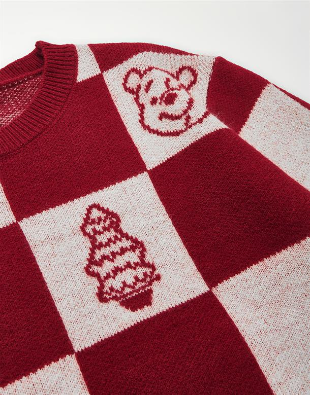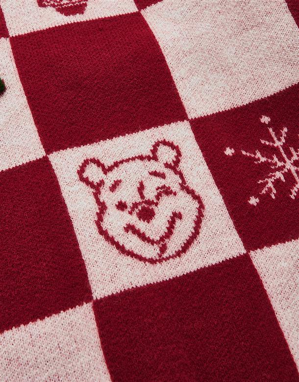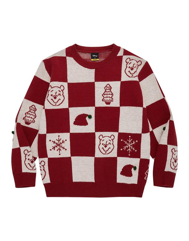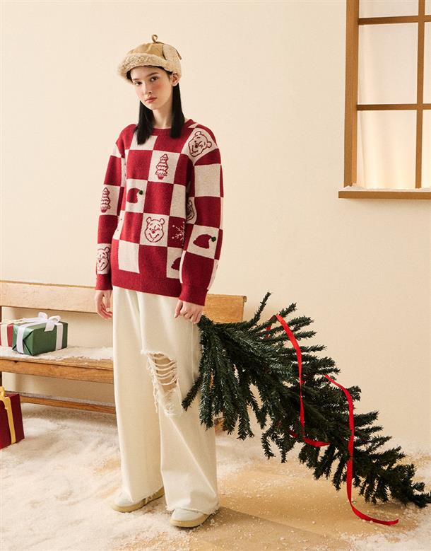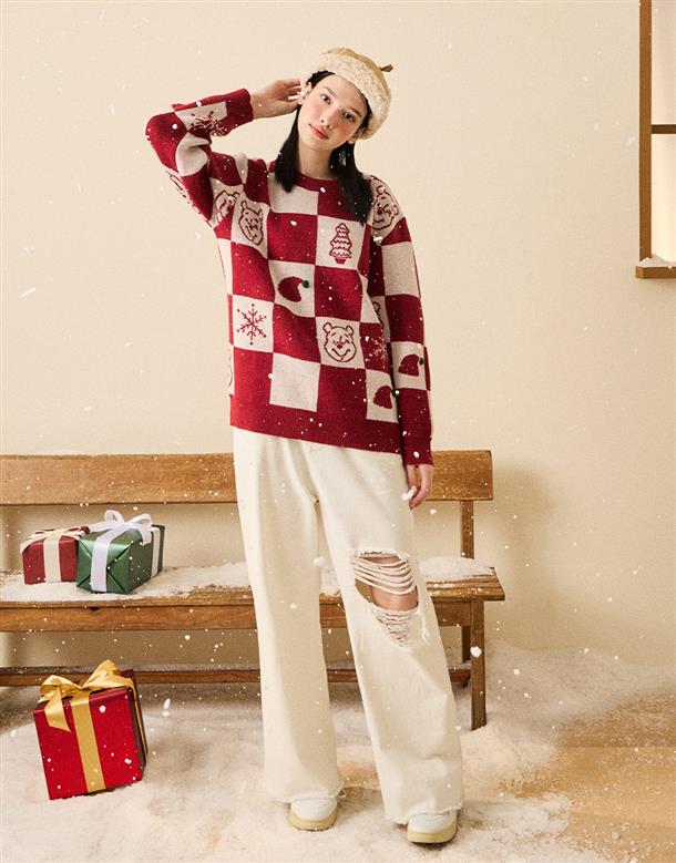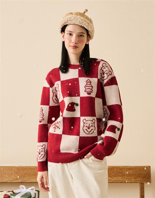 聖誕維尼系列,撞色格紋提花,寬鬆毛織上衣,保暖穿搭款。