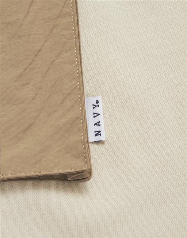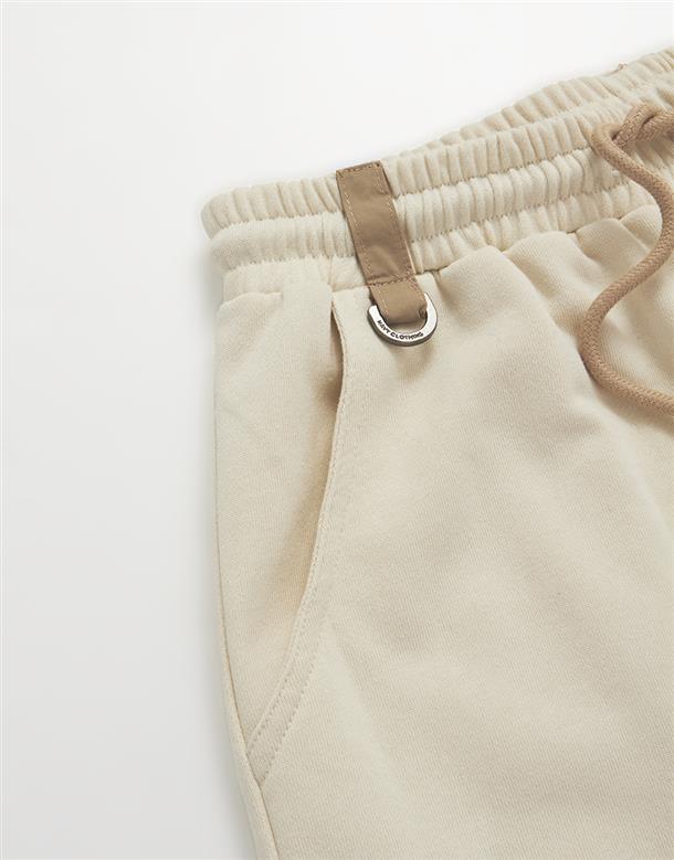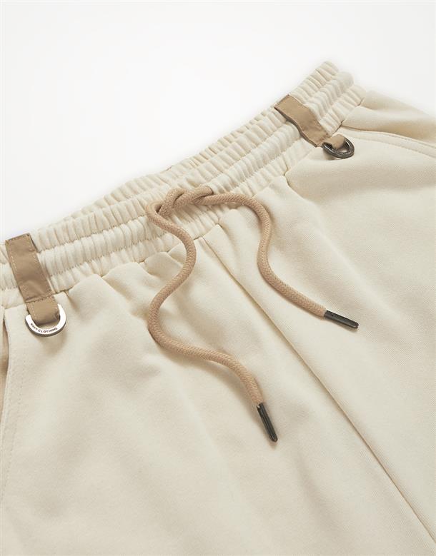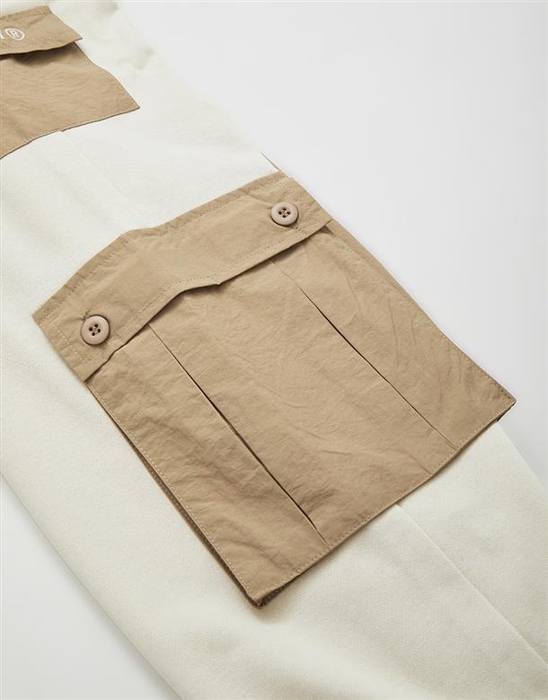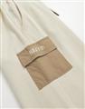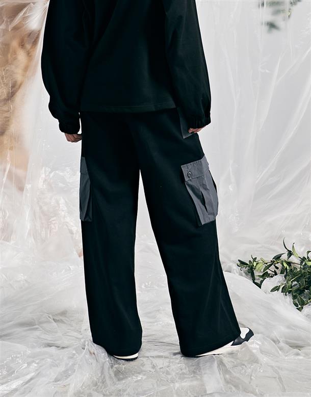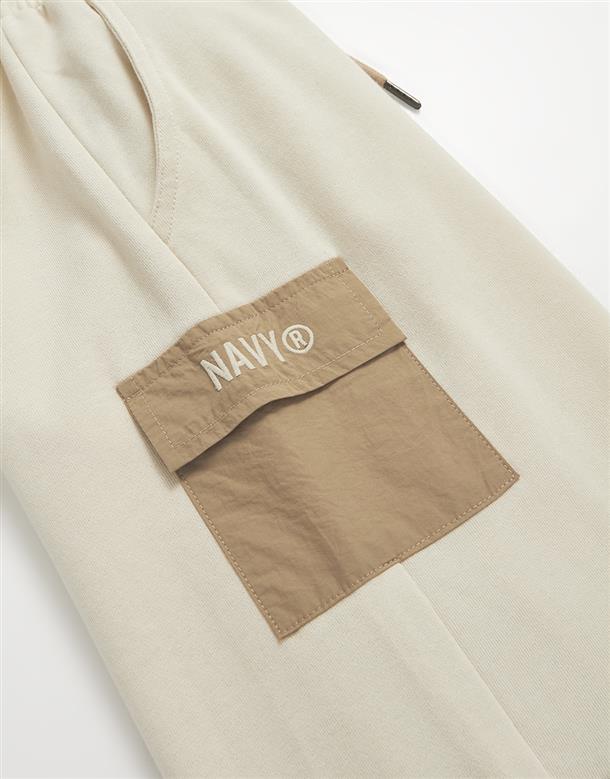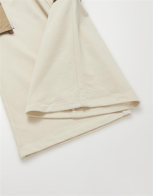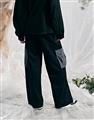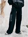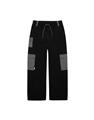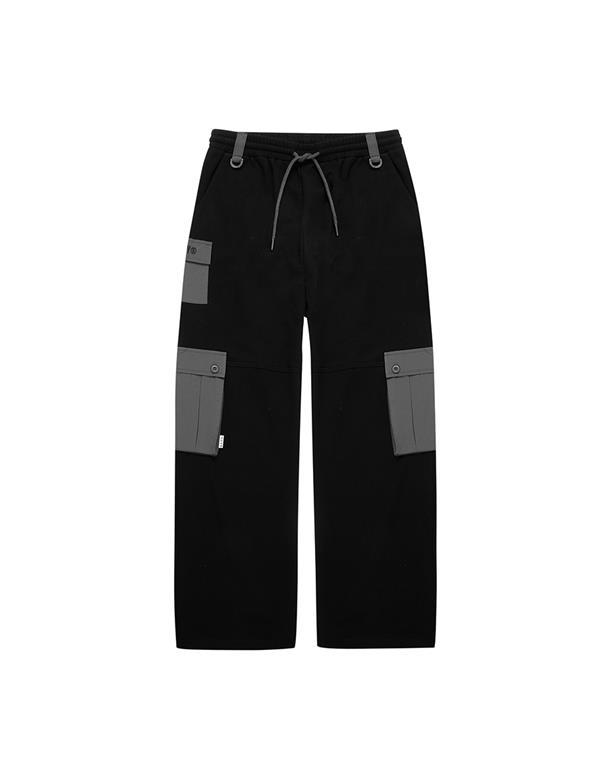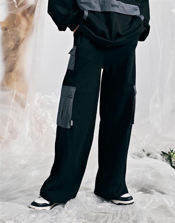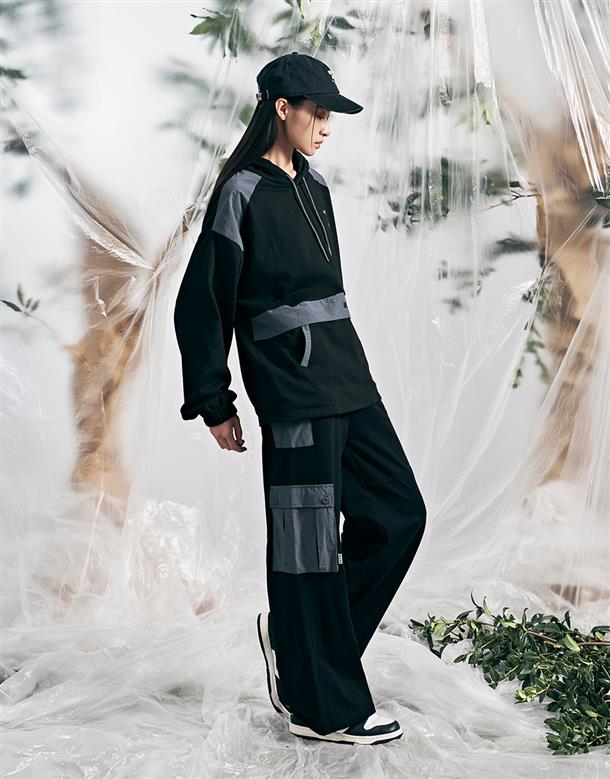 柔軟衛衣與刷刷布,異材質拼接設計,品牌電繡與織標,鬆緊腰帶好穿脫,工裝多口袋設計,率性直筒修身長褲,同款拼色帽TEE可搭成套。