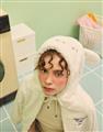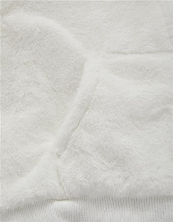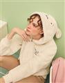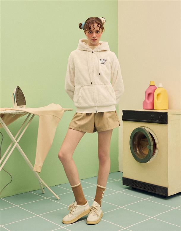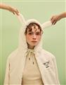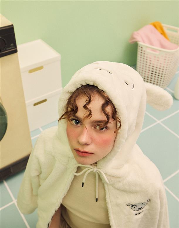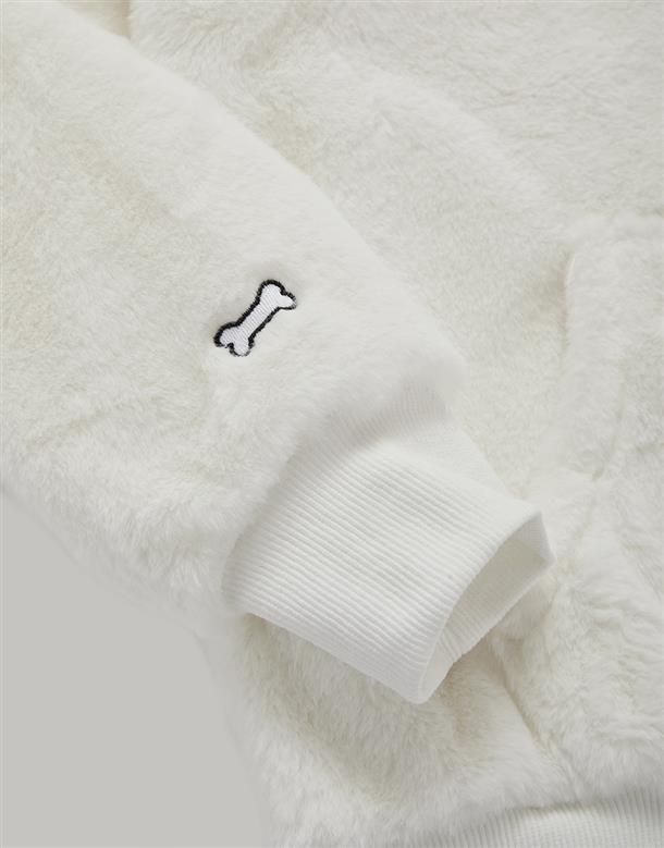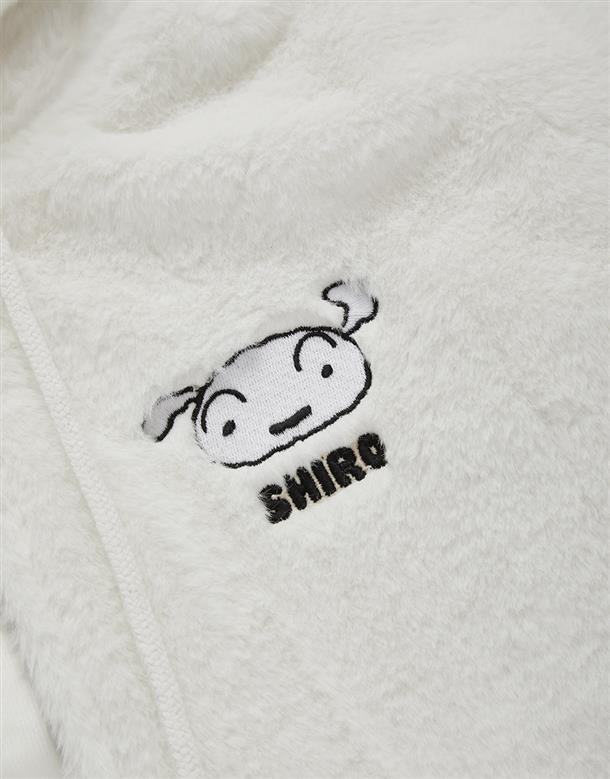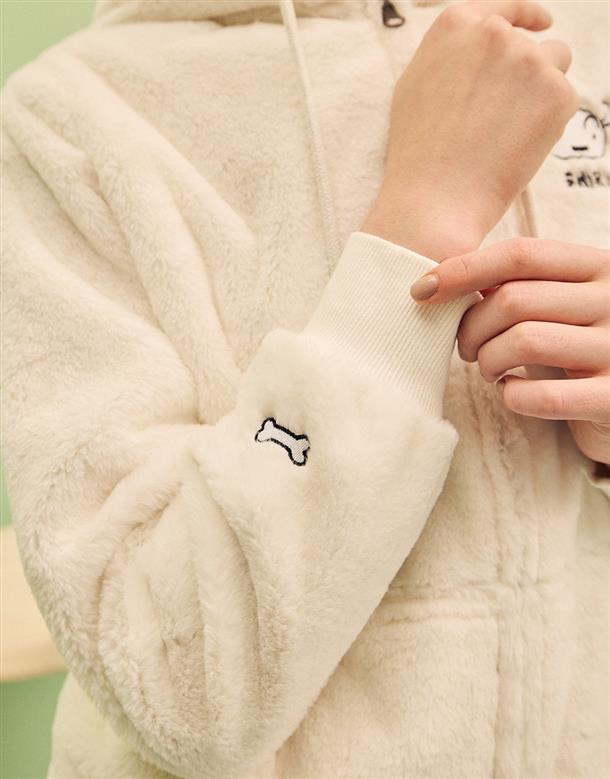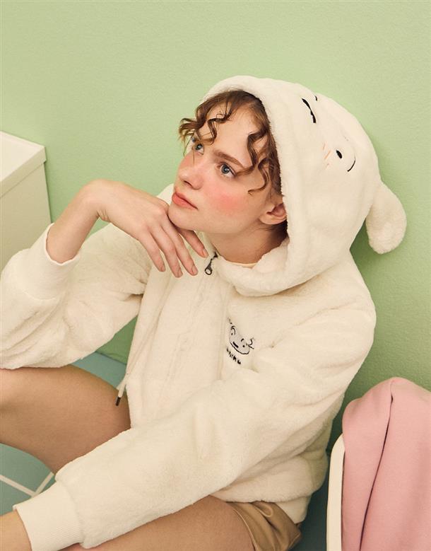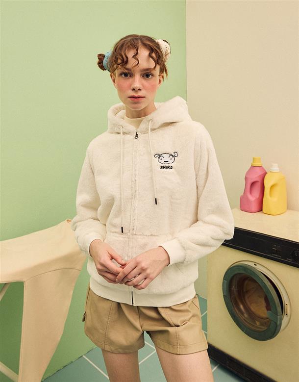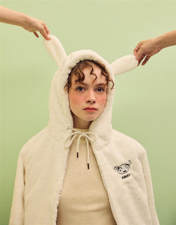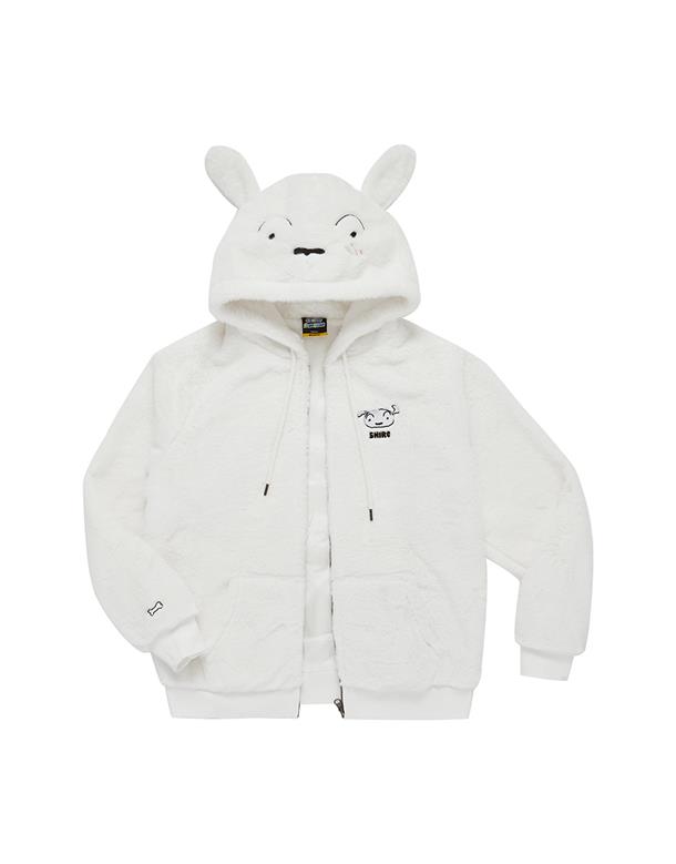 小白連帽外套,趣味立體耳朵設計,精緻電繡,舒適柔軟絨毛面料。