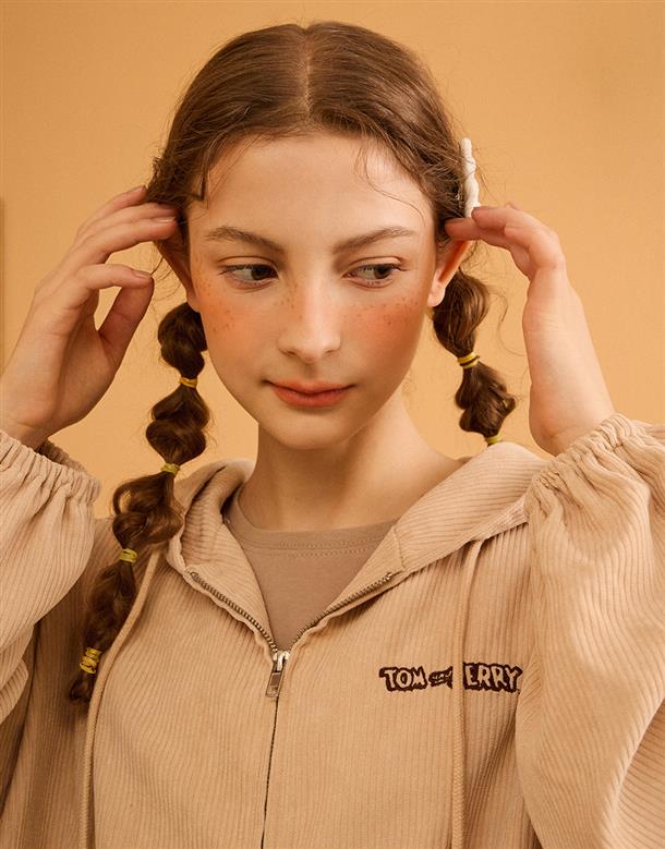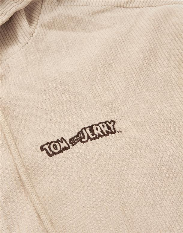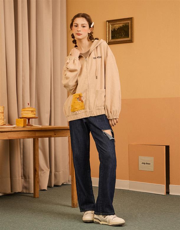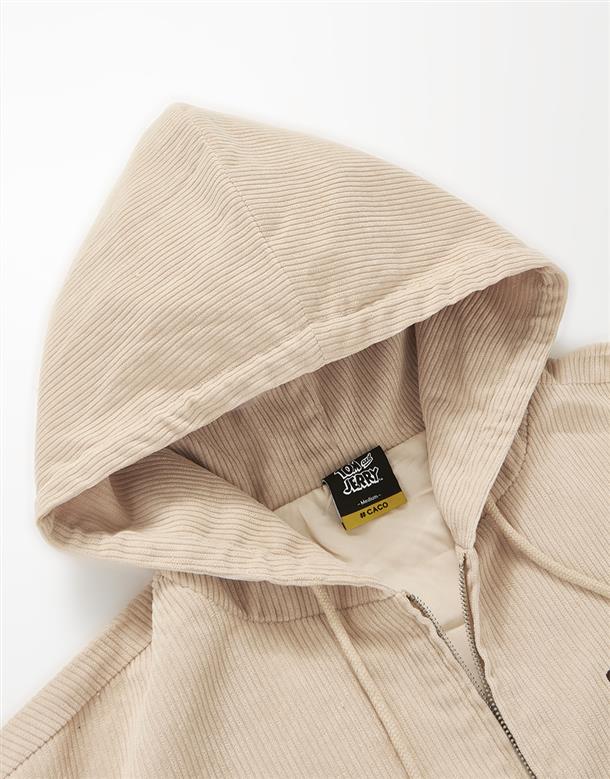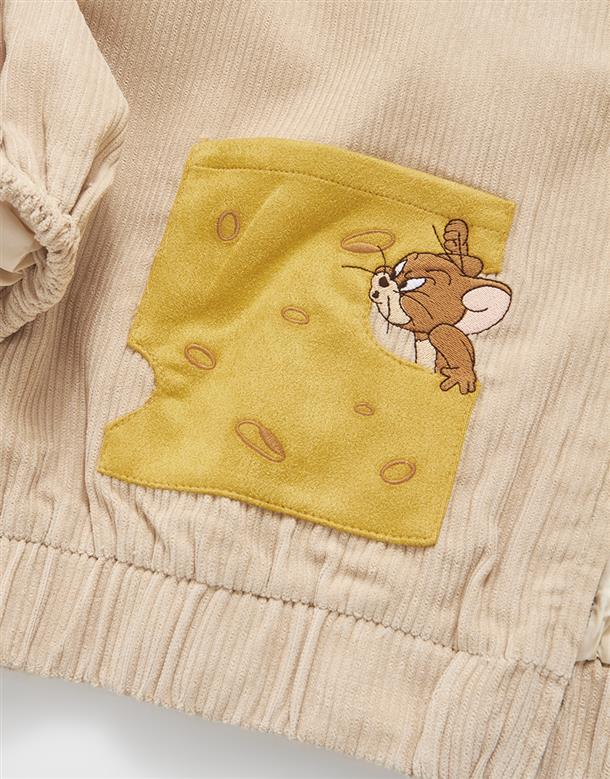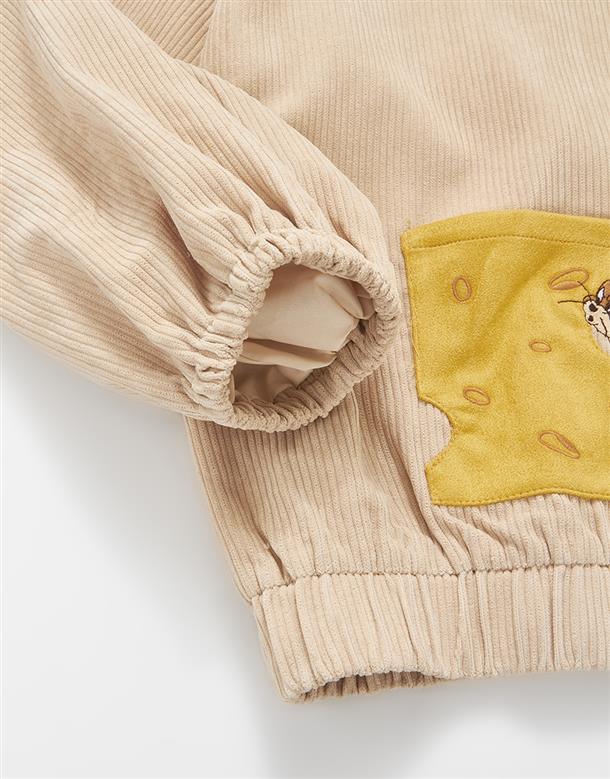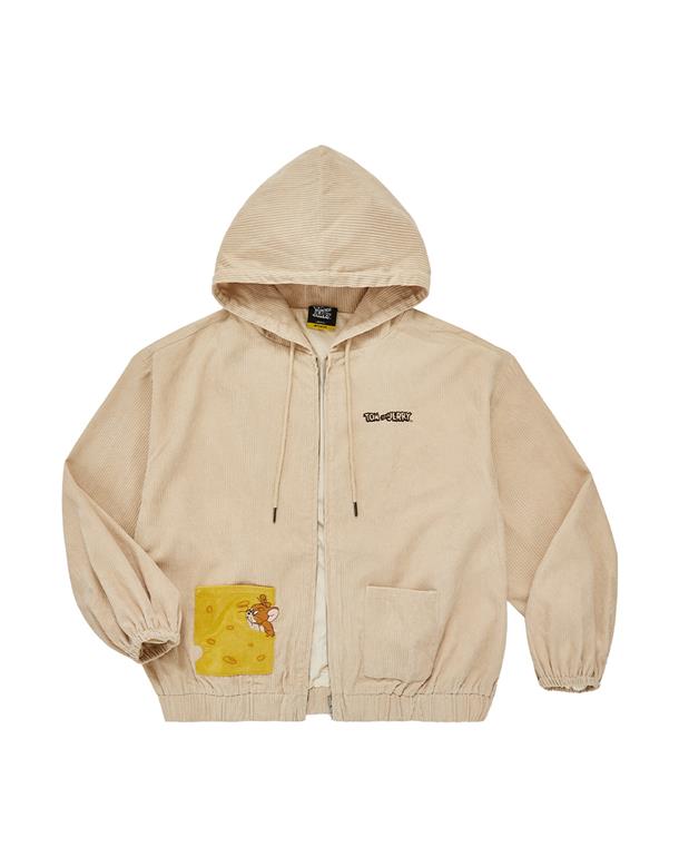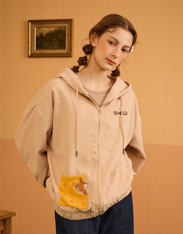 傑利鼠精緻電繡,起司造型貼袋,燈芯絨柔軟材質,寬鬆落肩連帽外套。