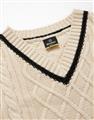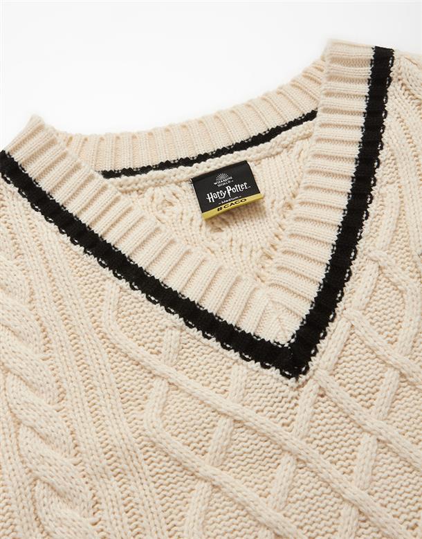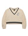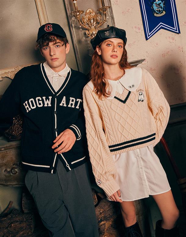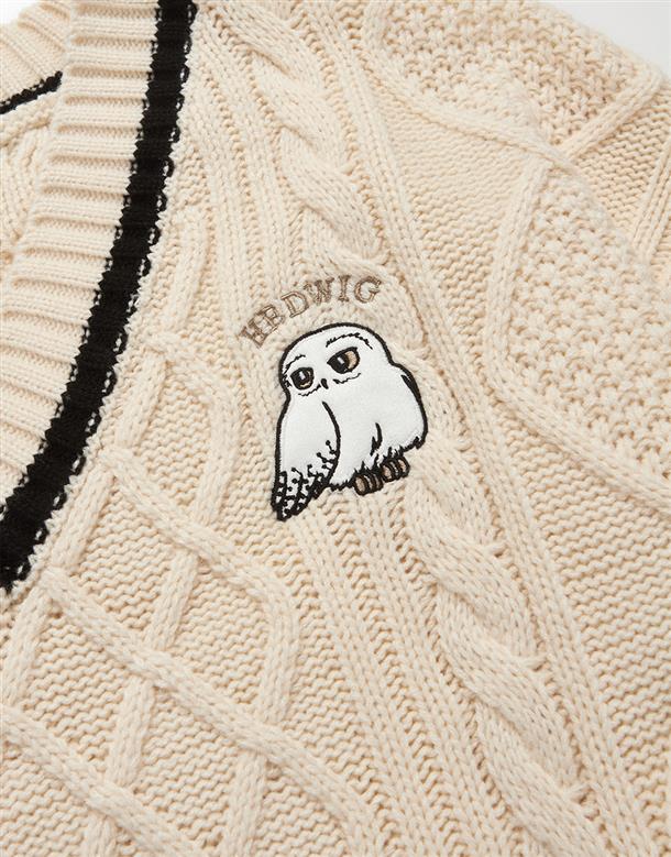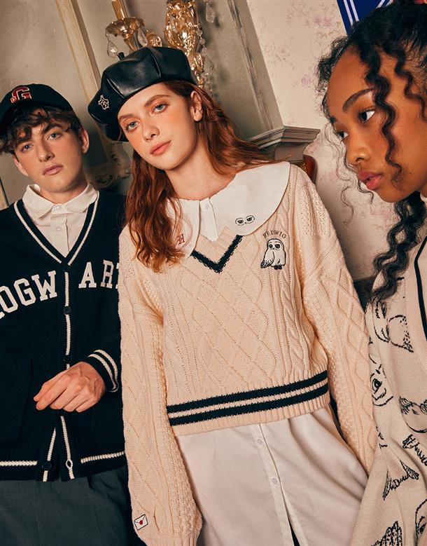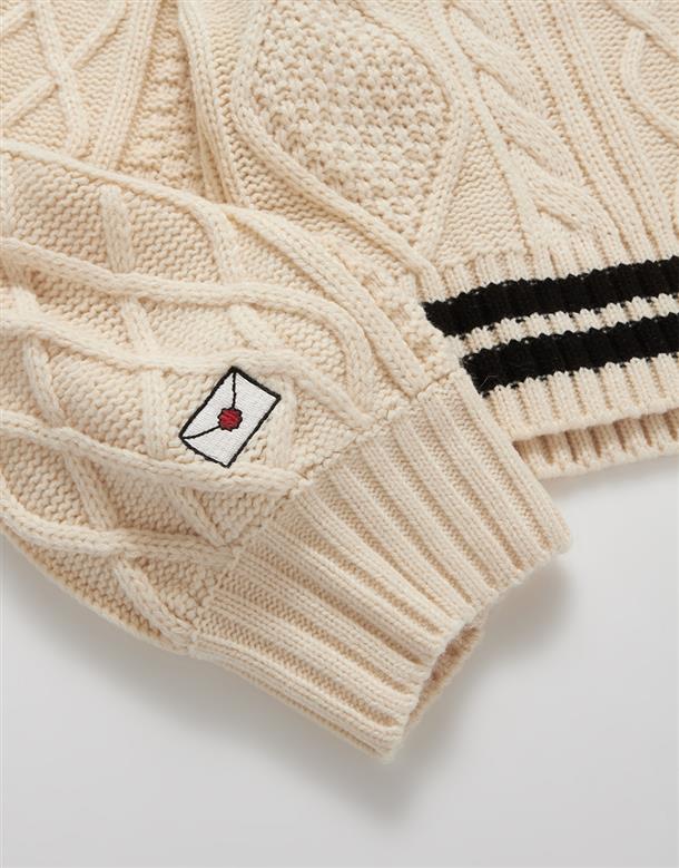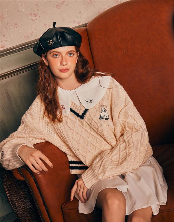 柔軟毛織撞色設計,細緻麻花與嘿美圖像貼布繡花,落肩V領百搭毛衣。