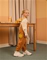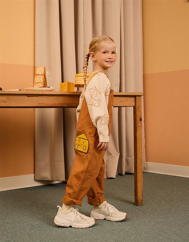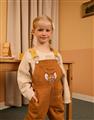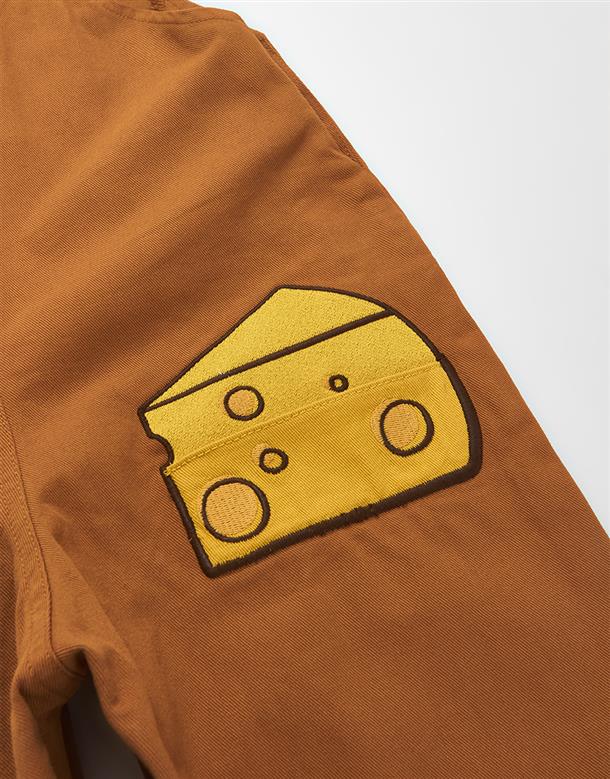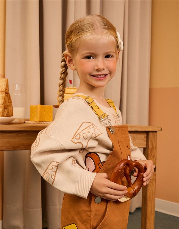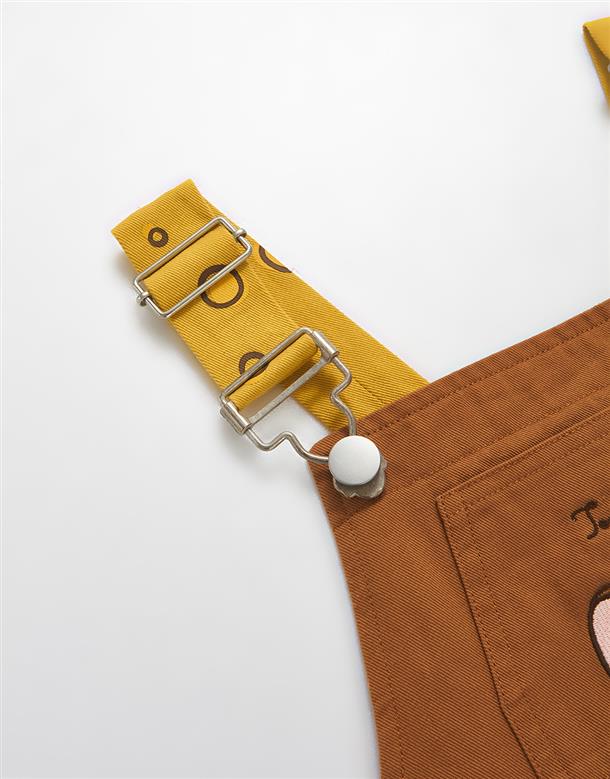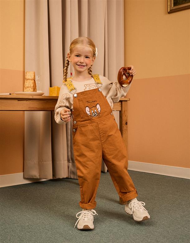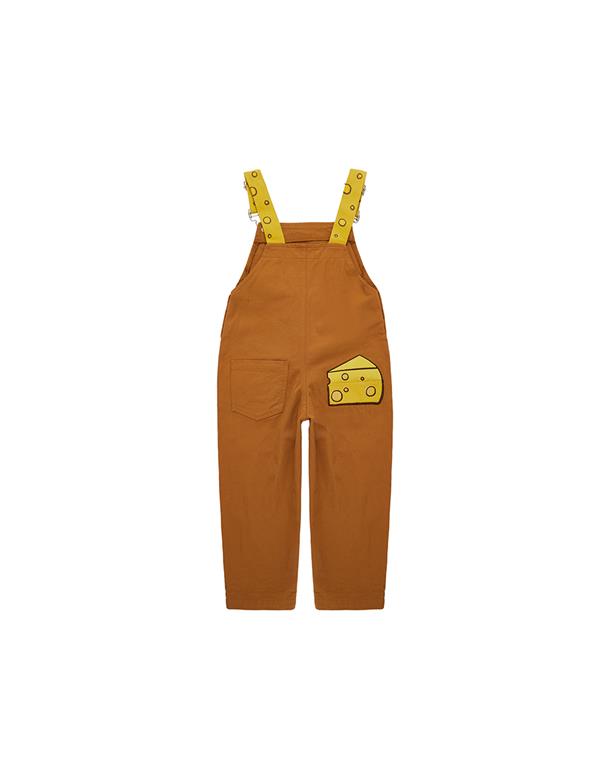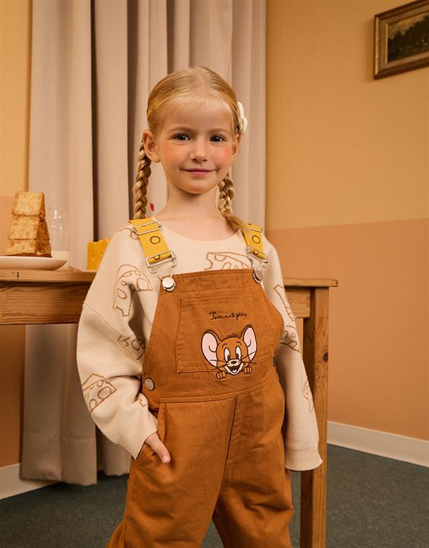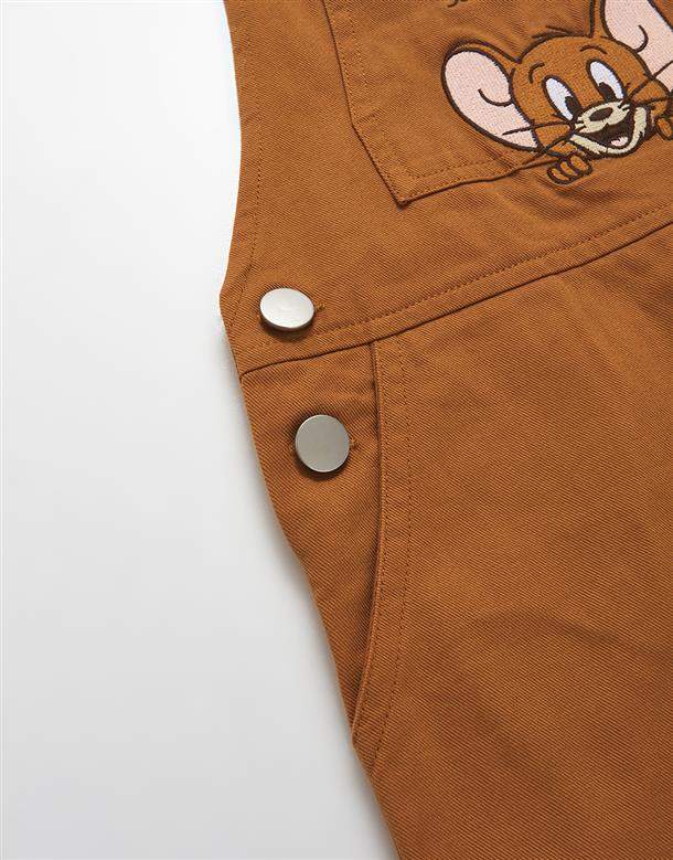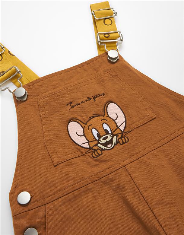 傑利鼠精緻電繡,撞色起司肩帶/口袋,斜紋洗水吊帶褲。