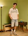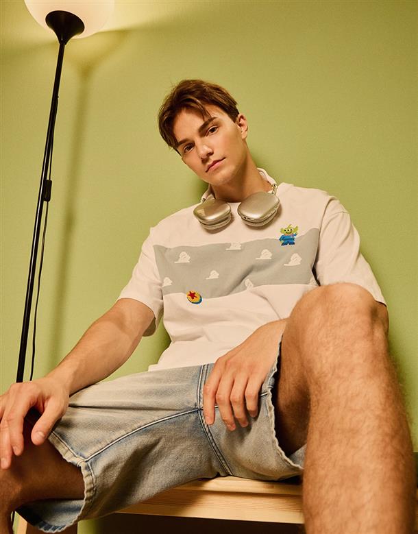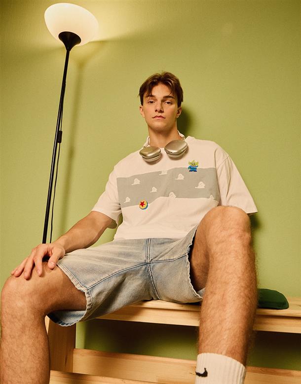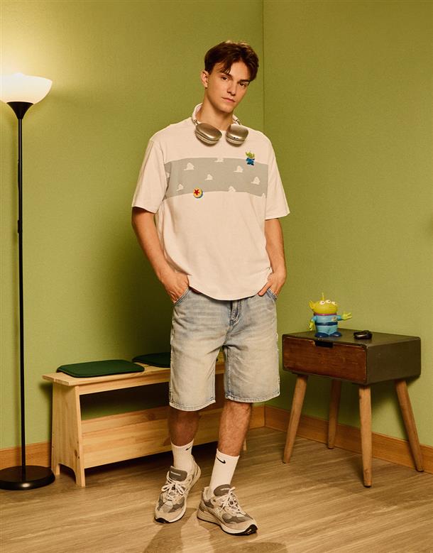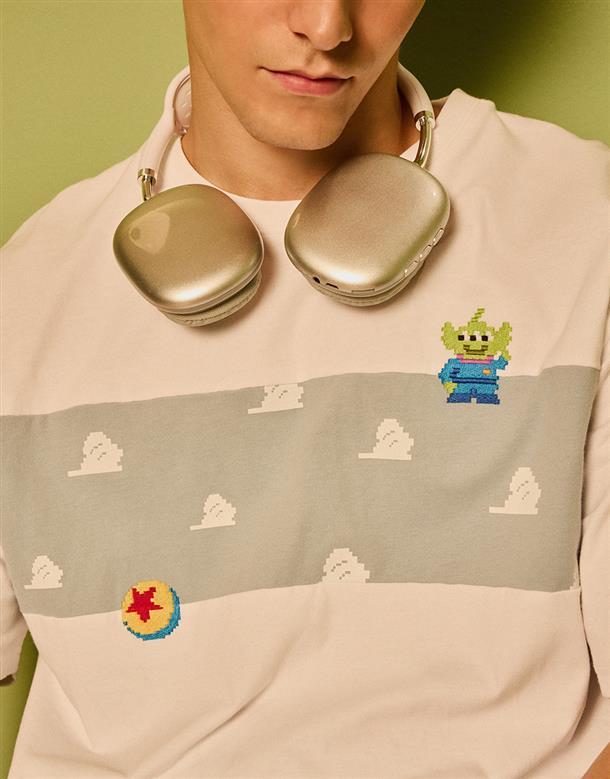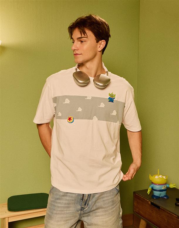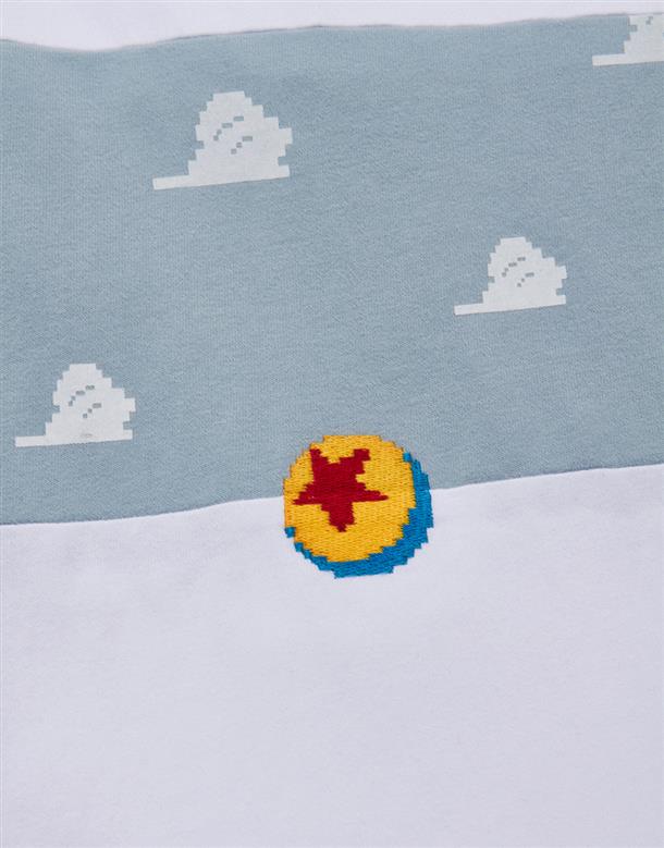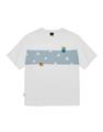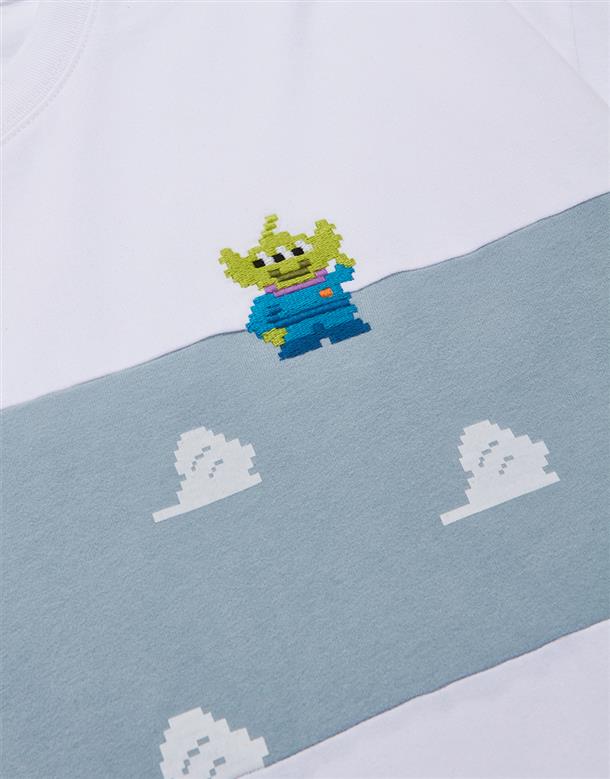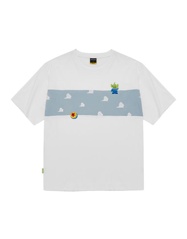 像素風格三眼怪雲朵設計,剪接撞色落肩短T。