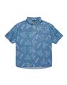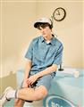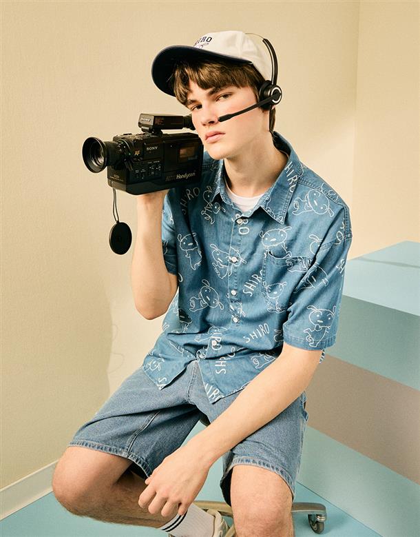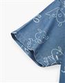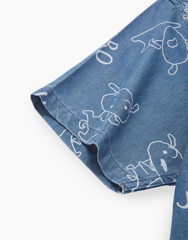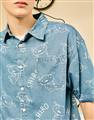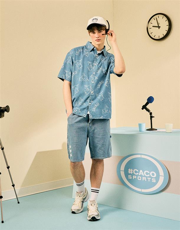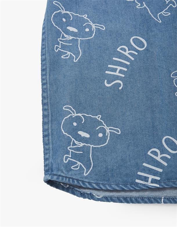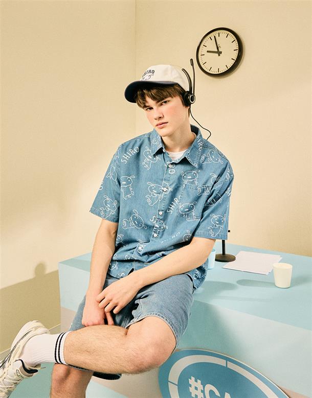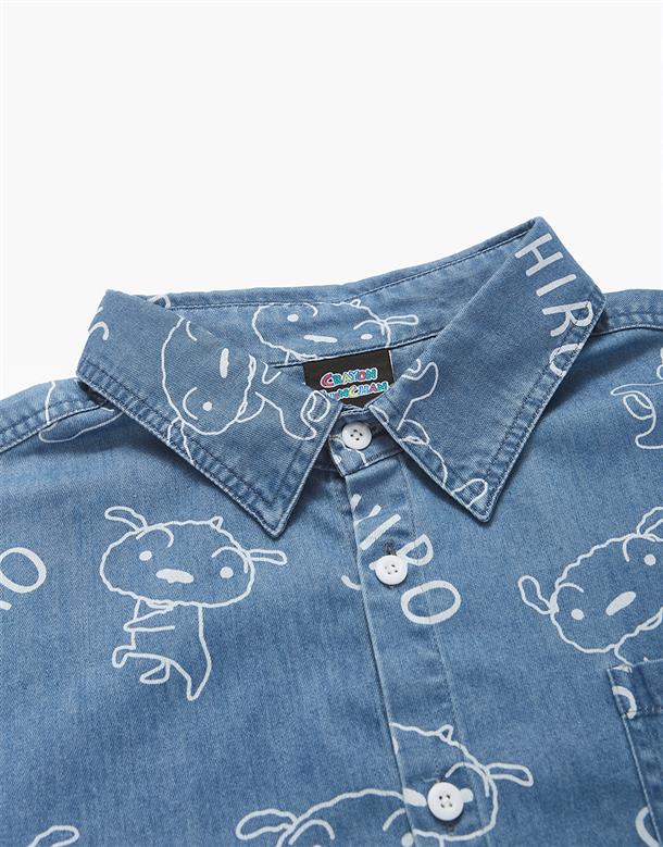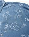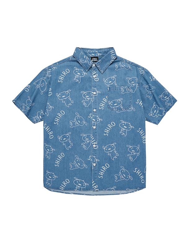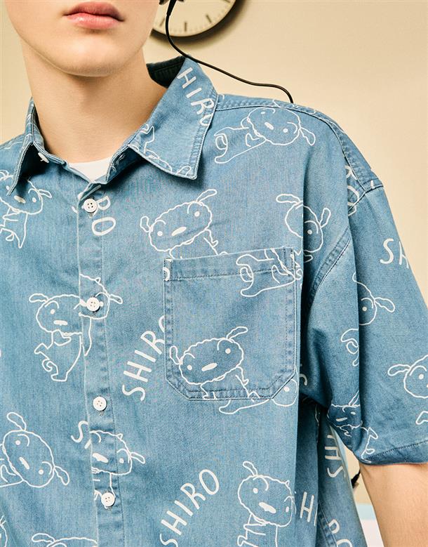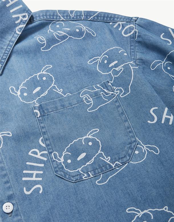 小白滿版印花寬鬆落肩牛仔襯衫。