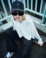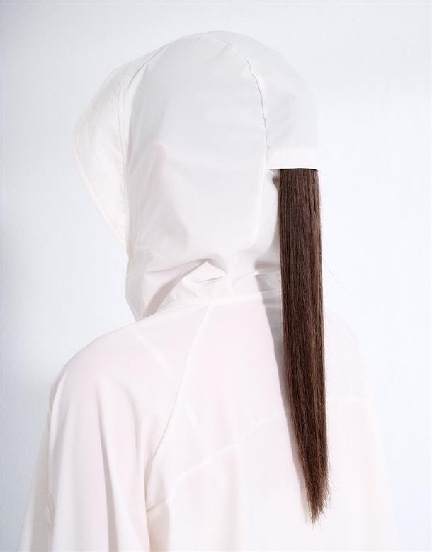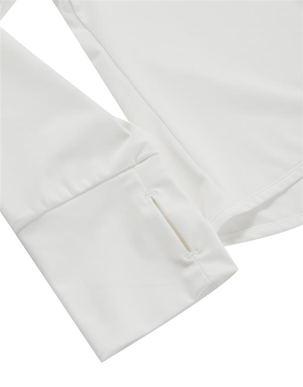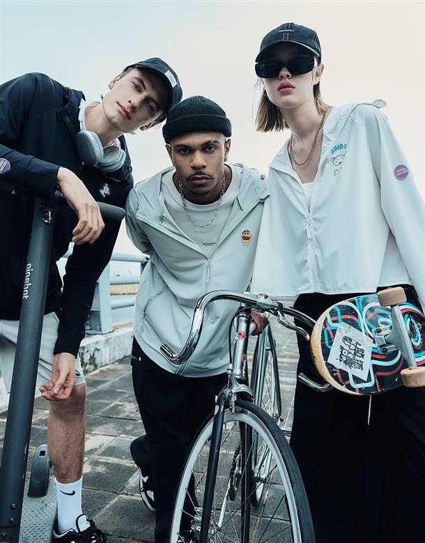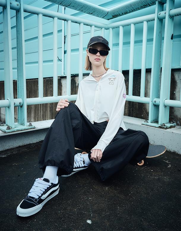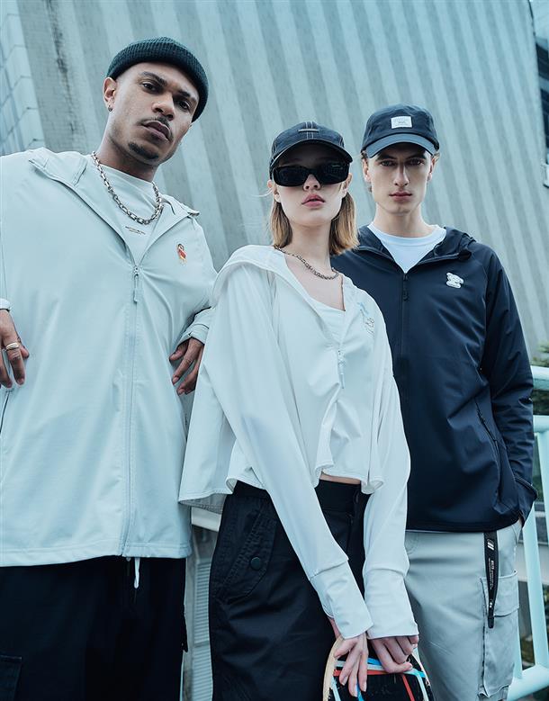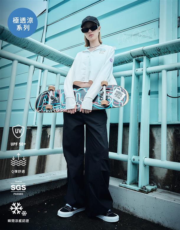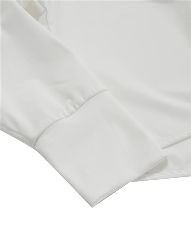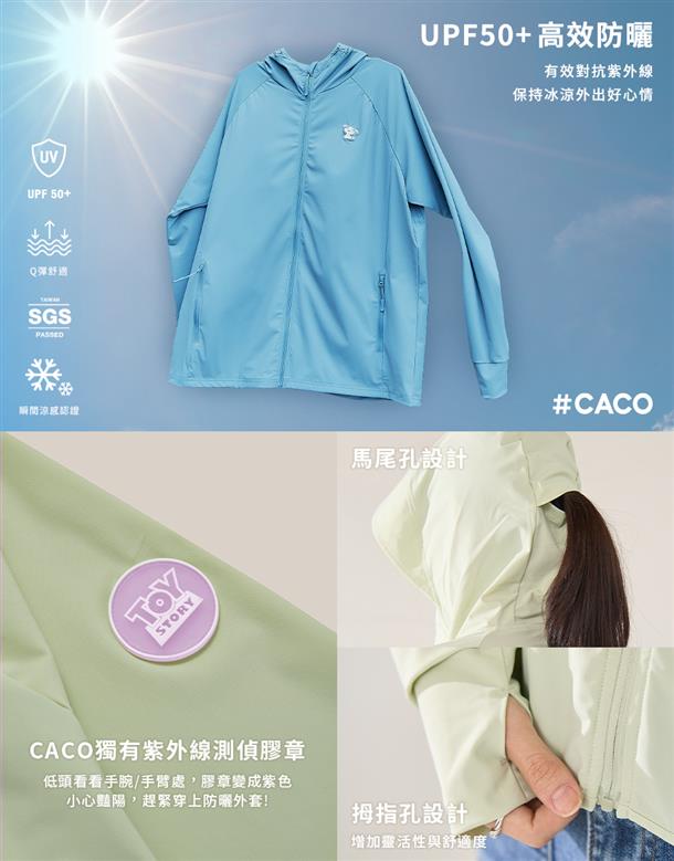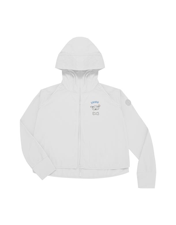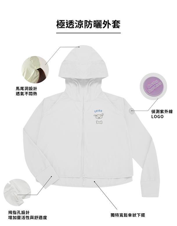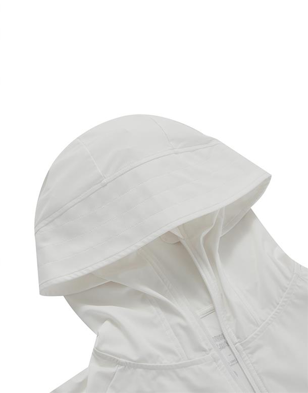 訂製機能性涼感面料,在夏日穿搭具有冰涼及抗UV效果,特殊傘狀短版修身版型,立體遮陽帽簷,帽子後方開髮洞設計,以及手袖加長指扣設計,更能達到全方位抵抗紫外線,前胸趣味小白小物質感印刷設計。