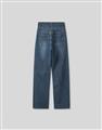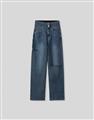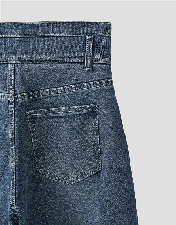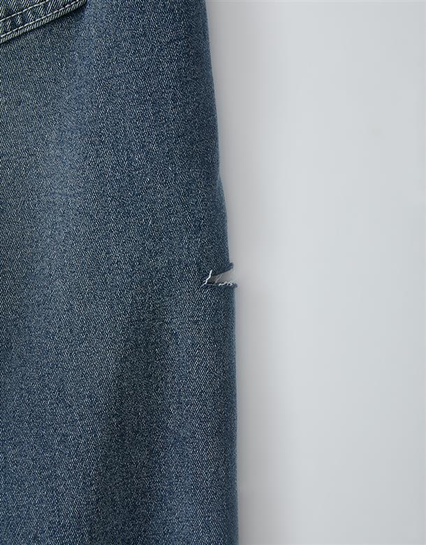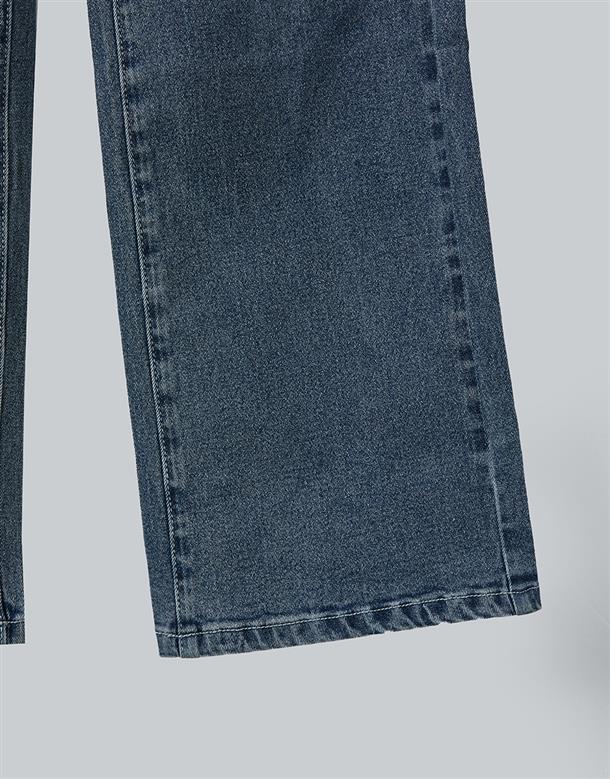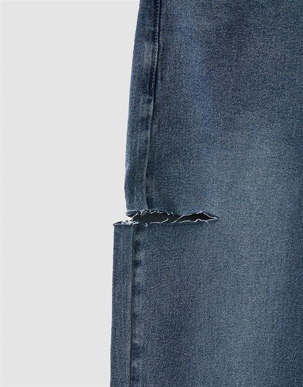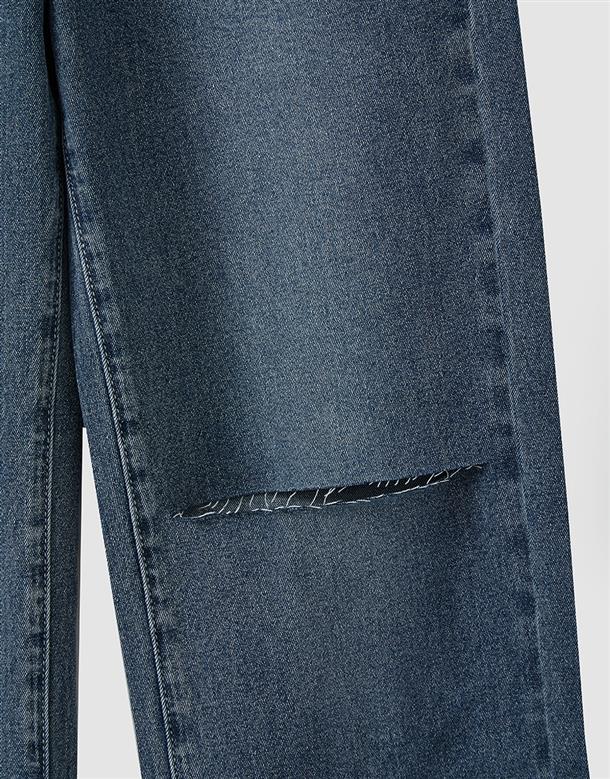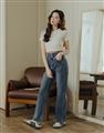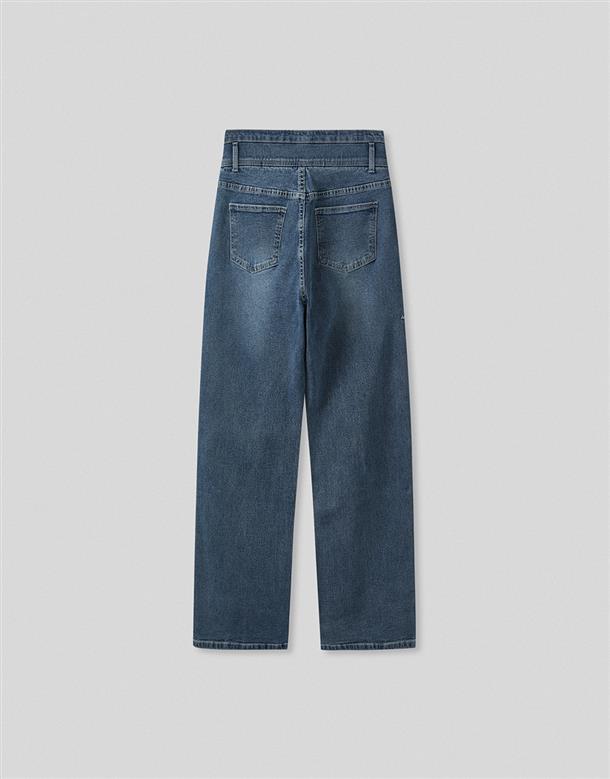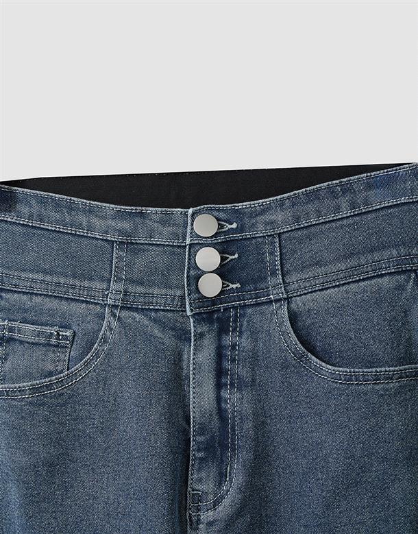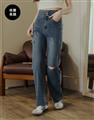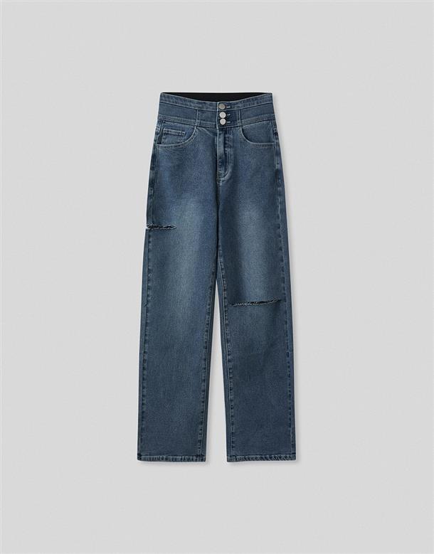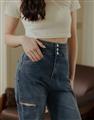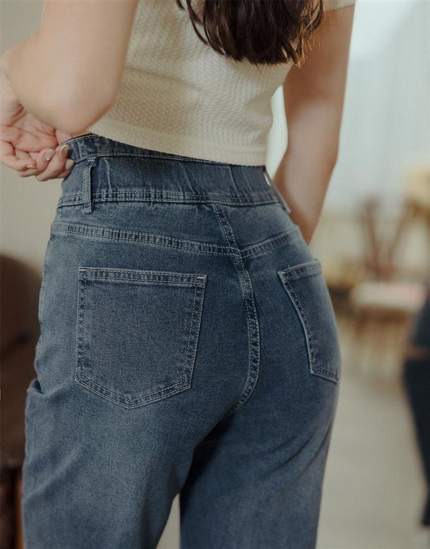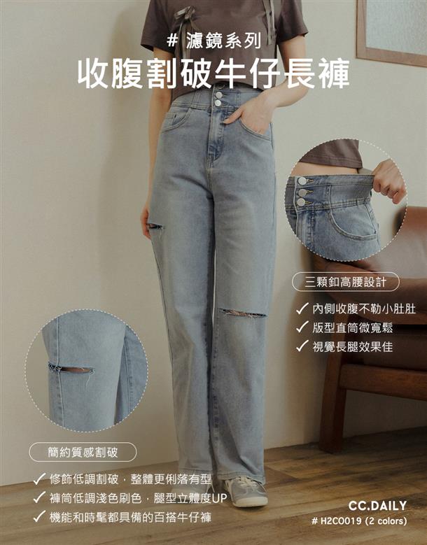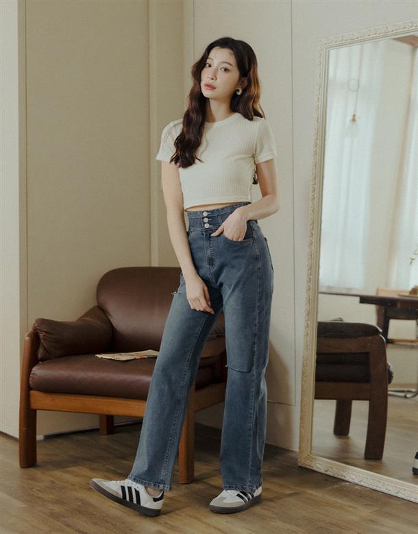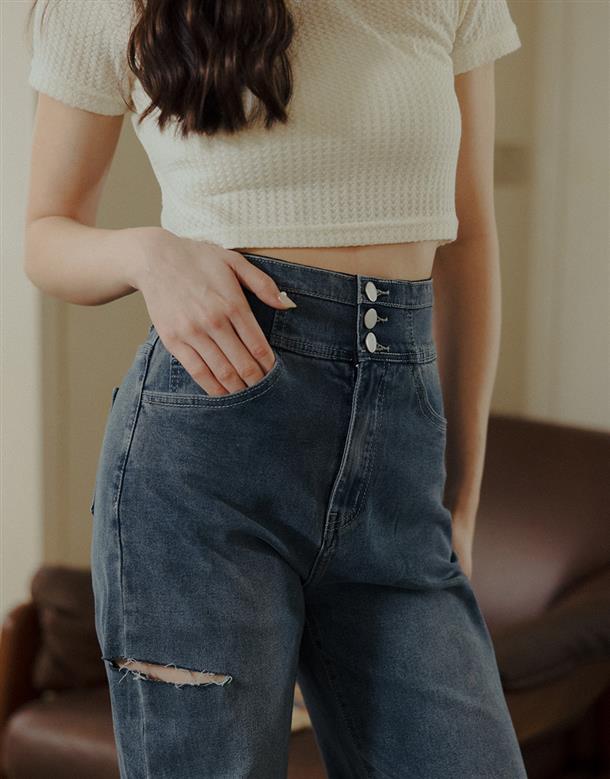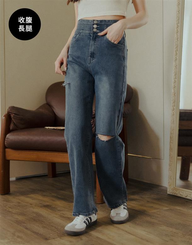 挺版微彈牛仔面料,三排釦高腰版型,收腹收腰顯瘦彈力鬆緊帶設計,後腰有V字翹臀線剪裁,褲管割破設計,整件為寬鬆直筒休閒版型。
