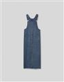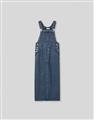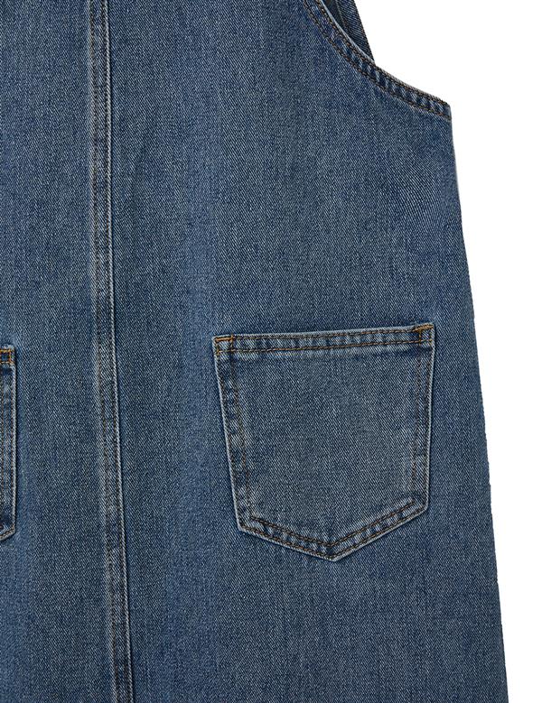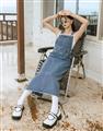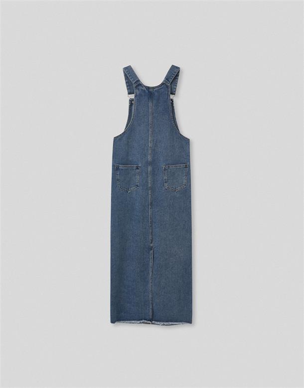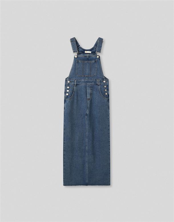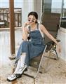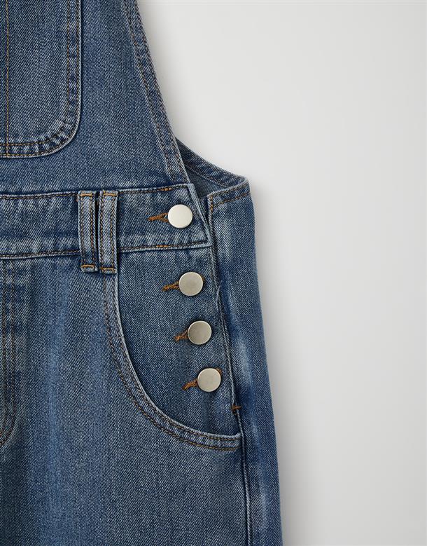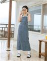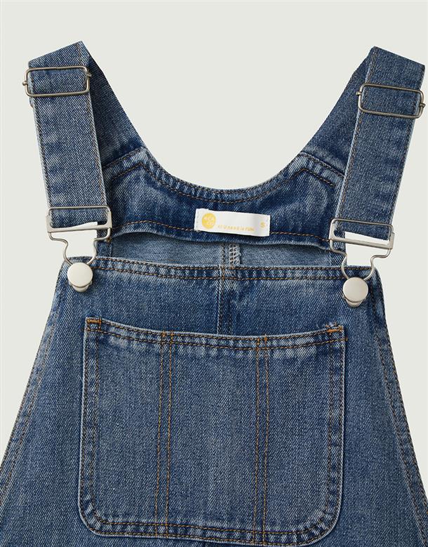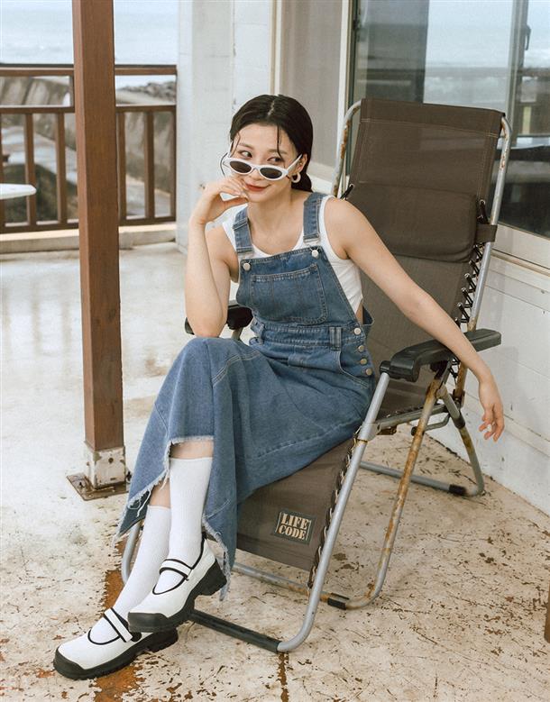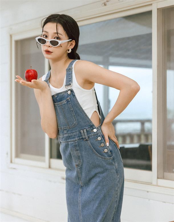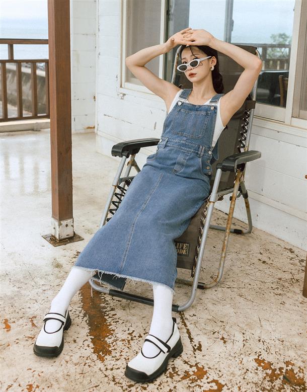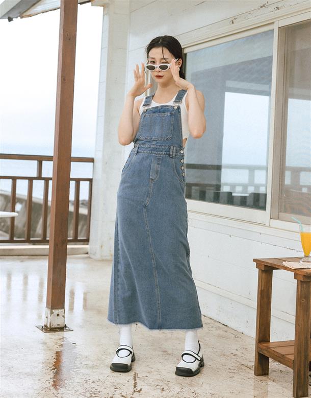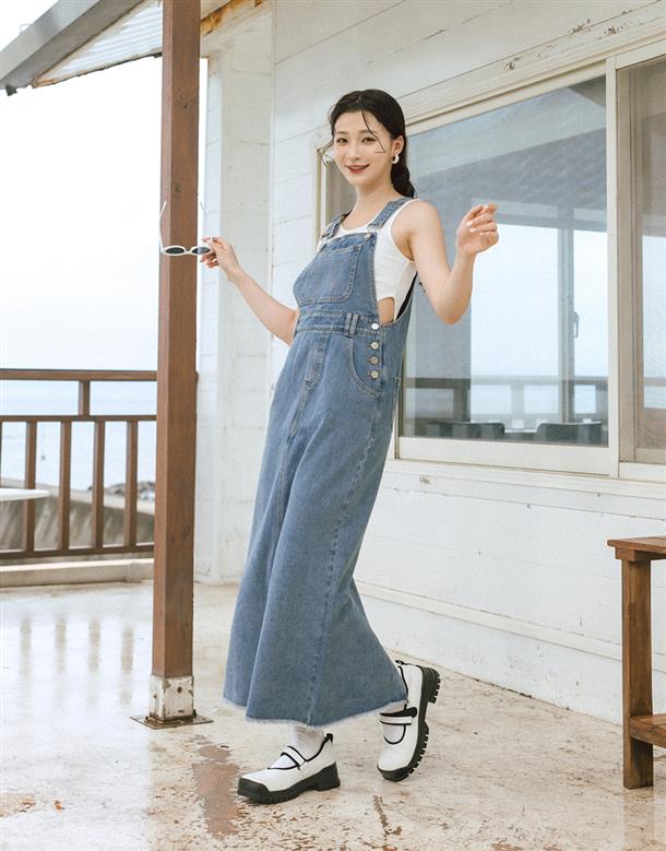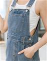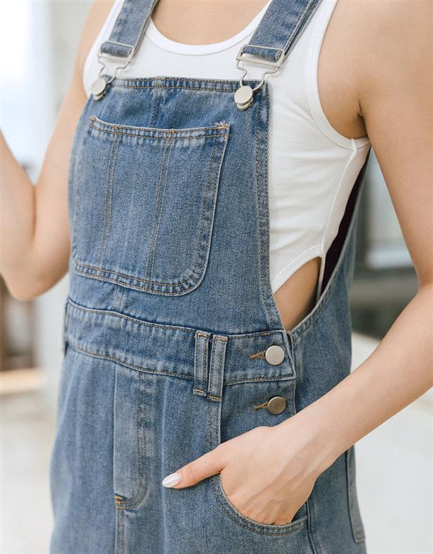 親膚無彈牛仔面料,連身長腿修飾比例,版型直筒不過於寬鬆,梨型身材友善,下擺隨興不修邊,肩帶可調節