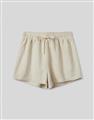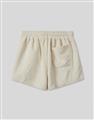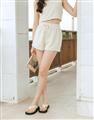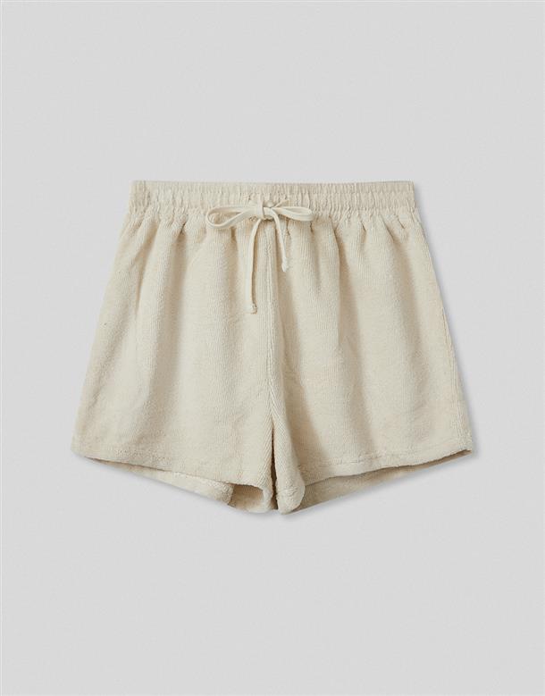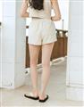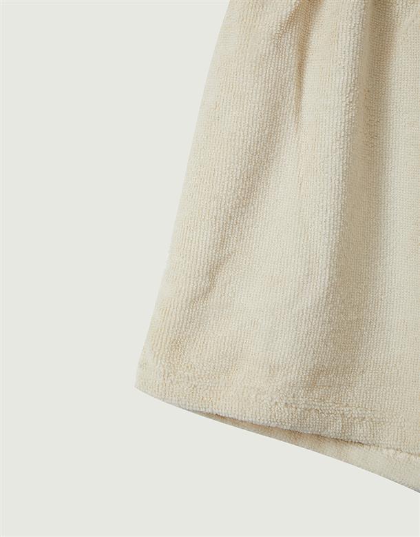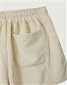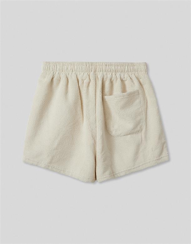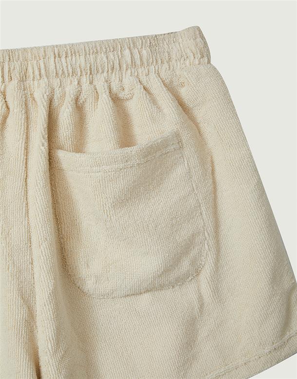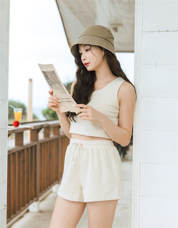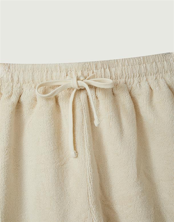 混棉吸水毛巾布,休閒寬鬆版,腰圍鬆緊帶加棉抽繩,下擺斜上弧度極修飾大腿,背面一個貼口袋