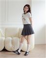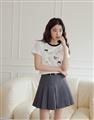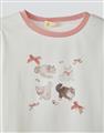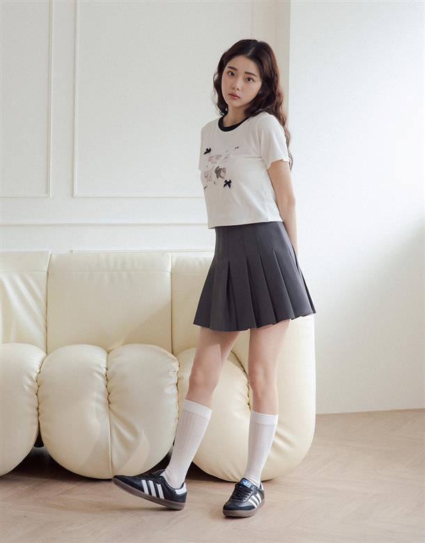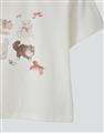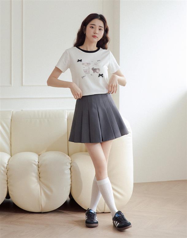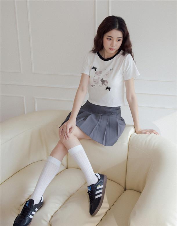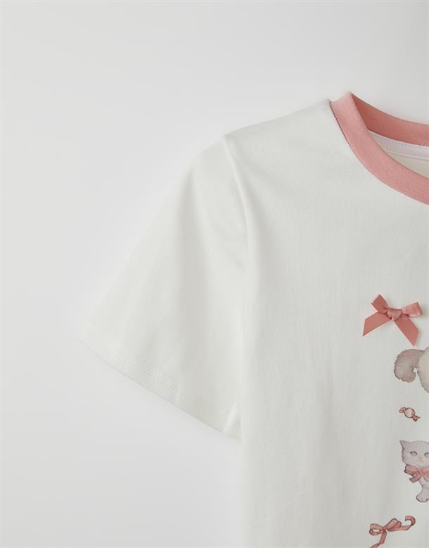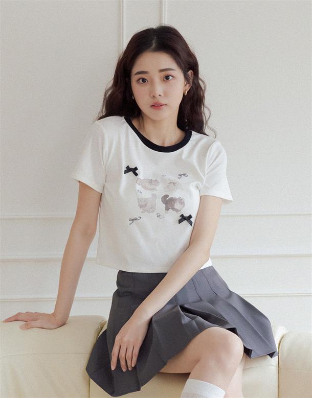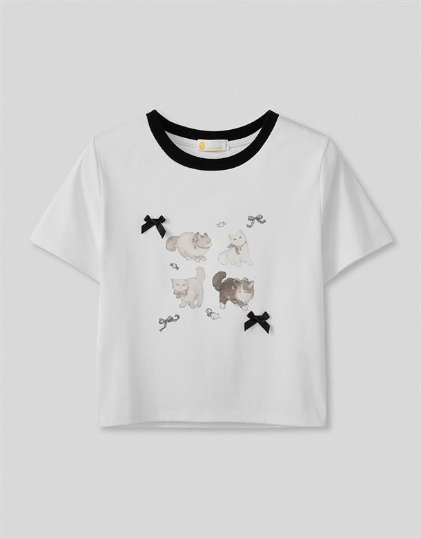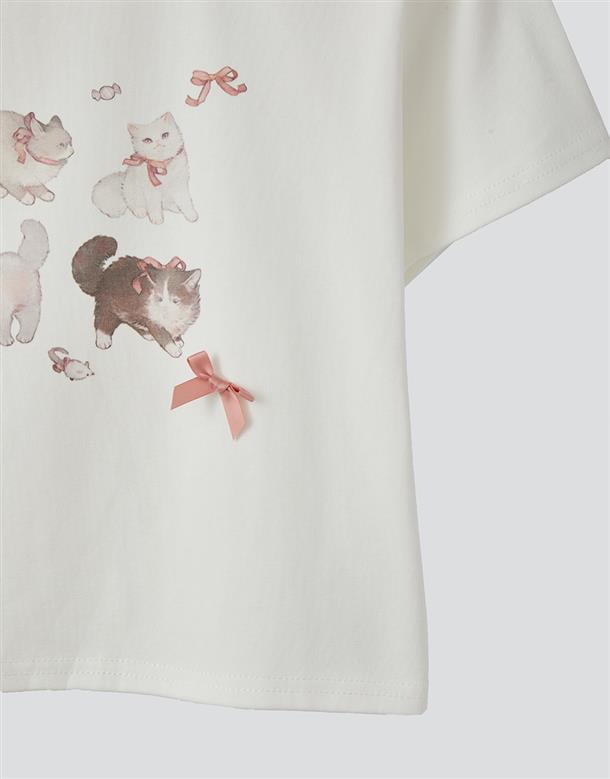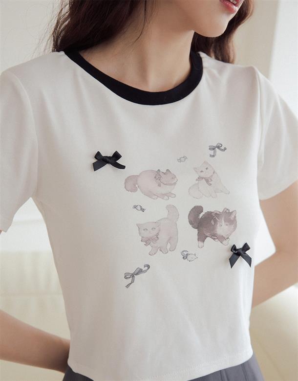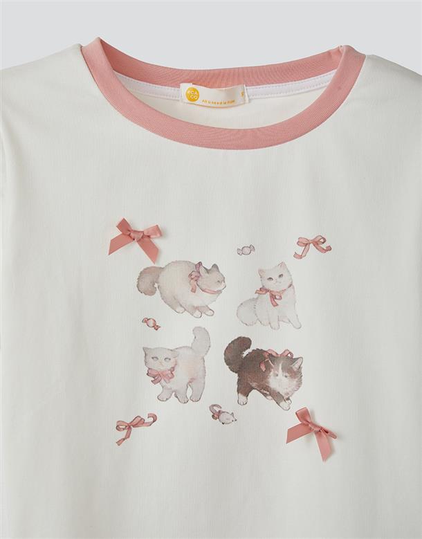 舒適棉質彈力面料,合身中短版,小貓繪圖印花,蝴蝶結緞帶設計。