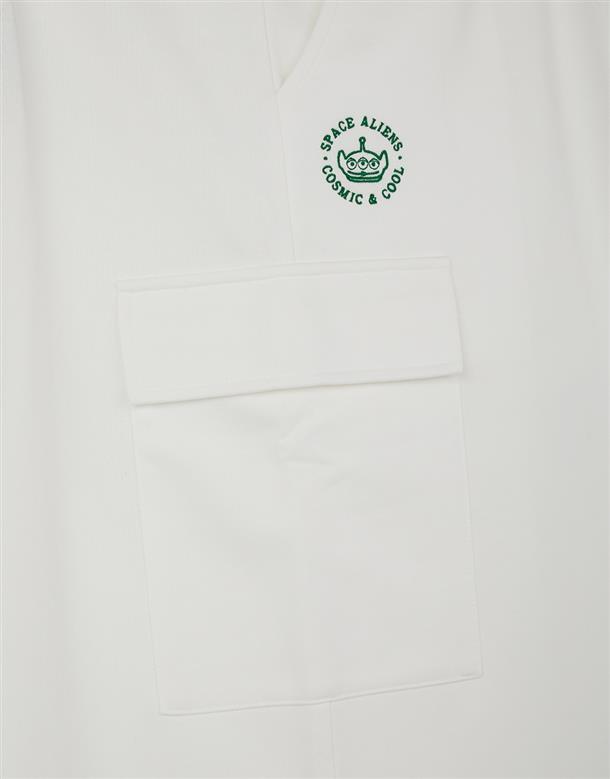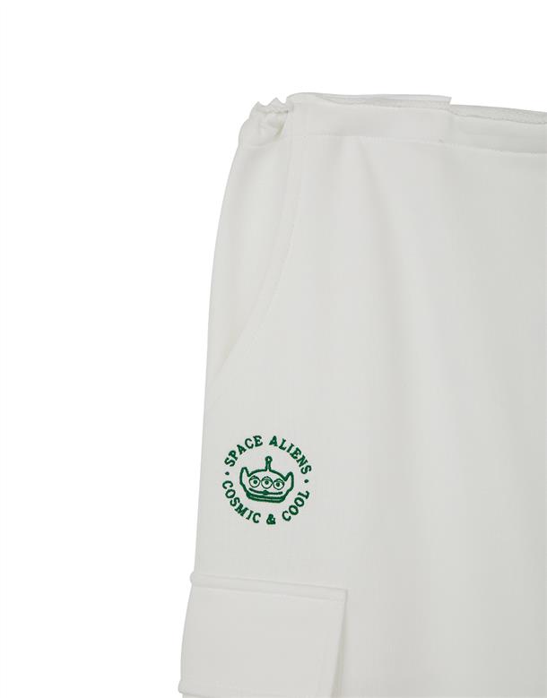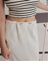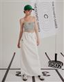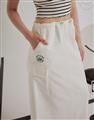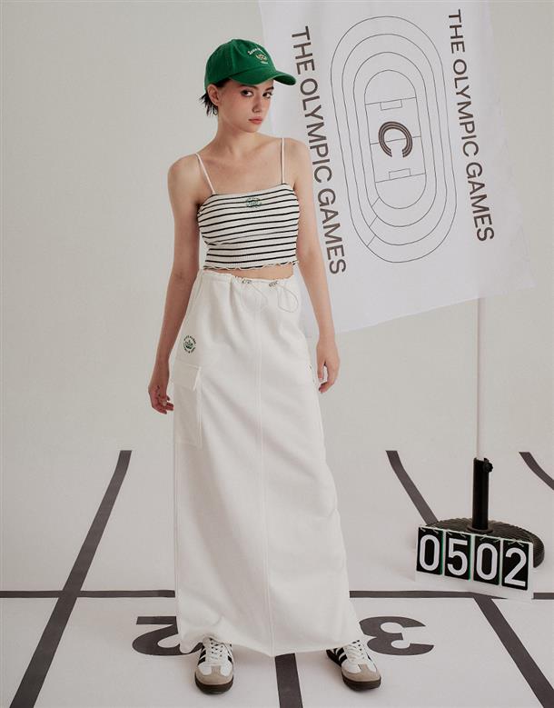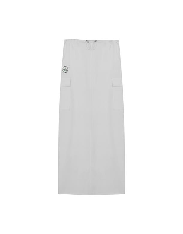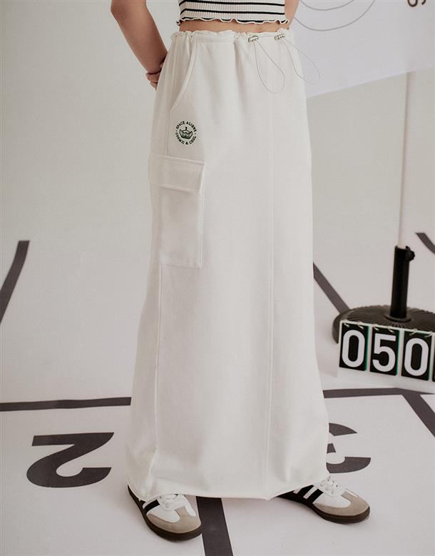腰頭調節環抽繩設計,兩側多口袋,後開衩下擺不修邊造型工裝裙。